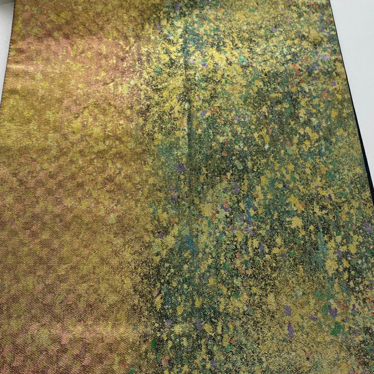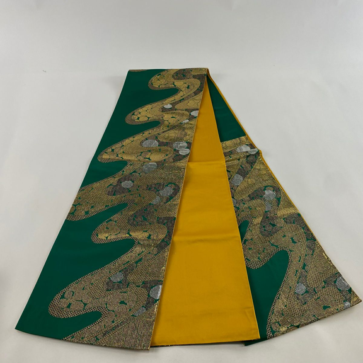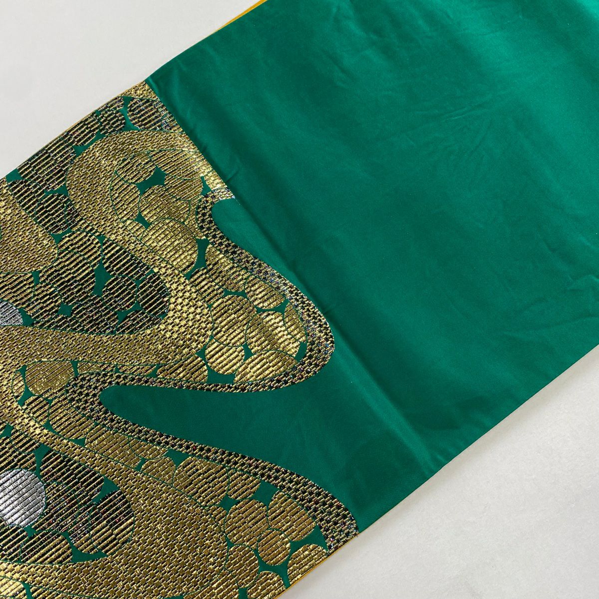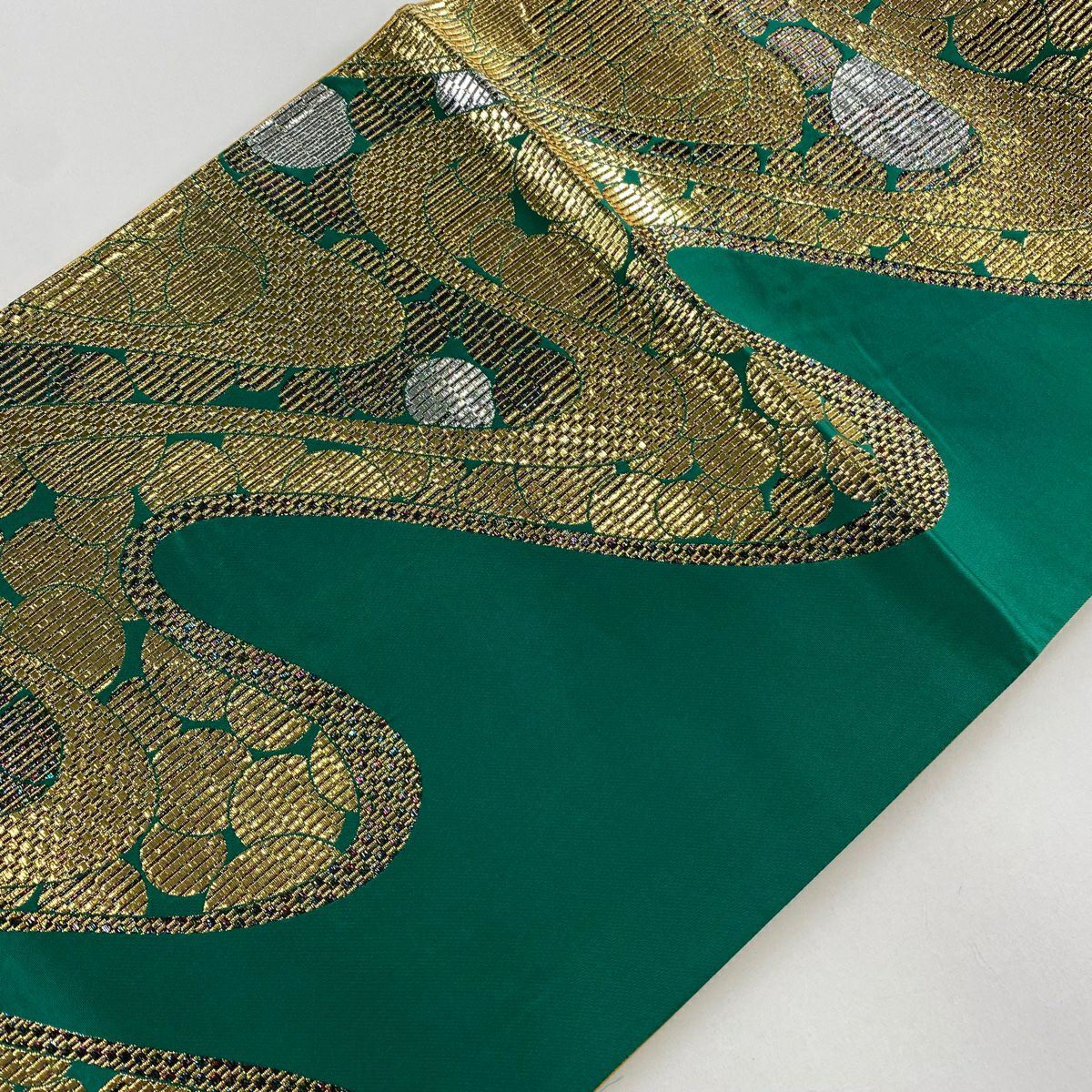 【在庫一掃】 【美品】 袋帯 秀品 幾何学 箔 緑 六通 正絹