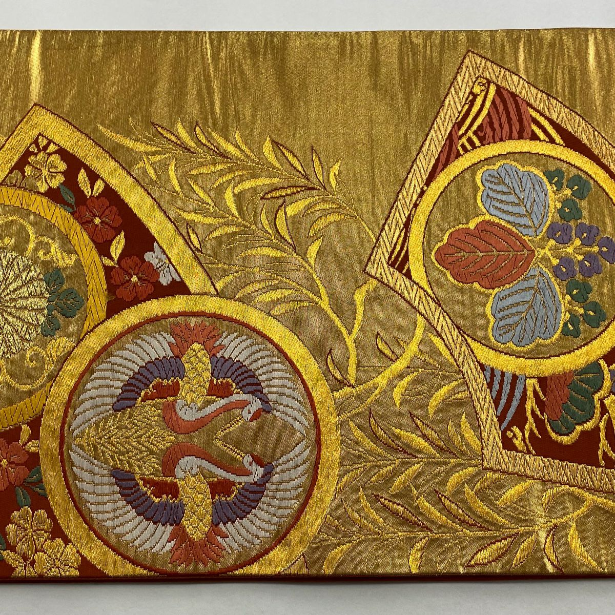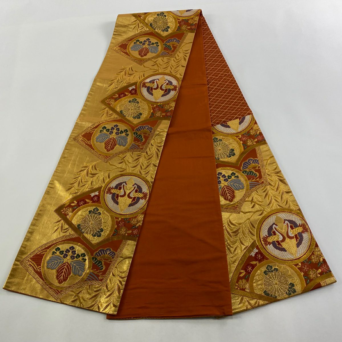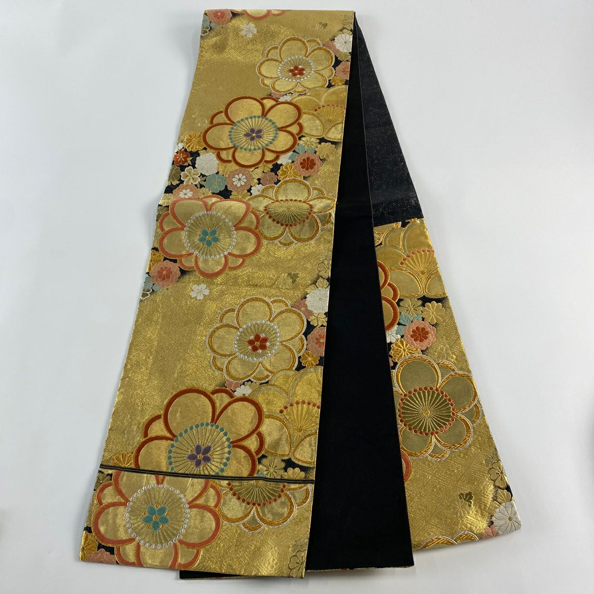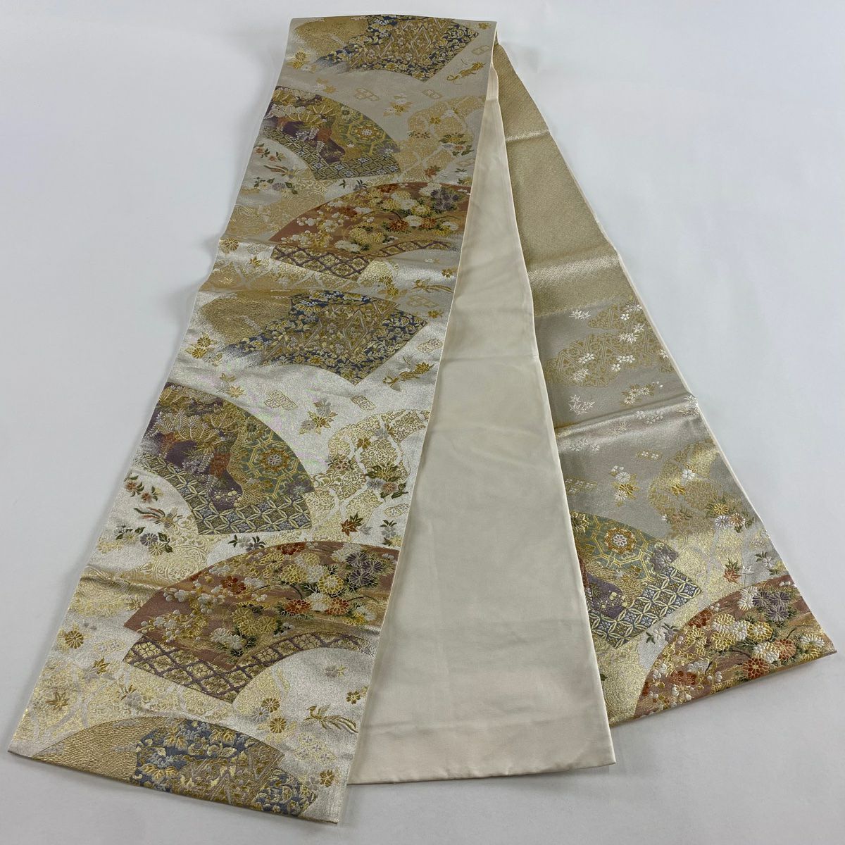 【在庫一掃】 袋帯 秀品 扇面 菊 箔 金糸 金色 六通 正絹
