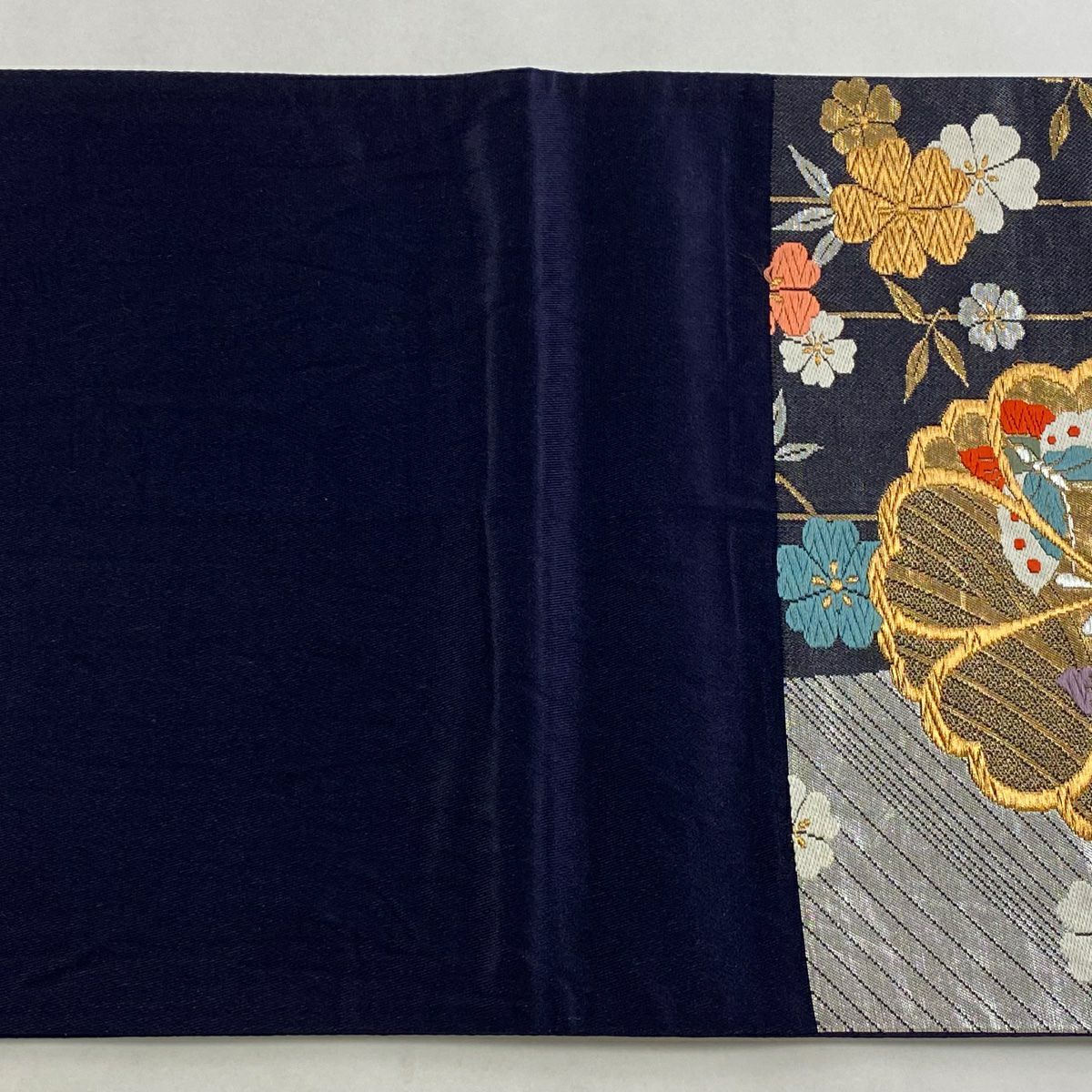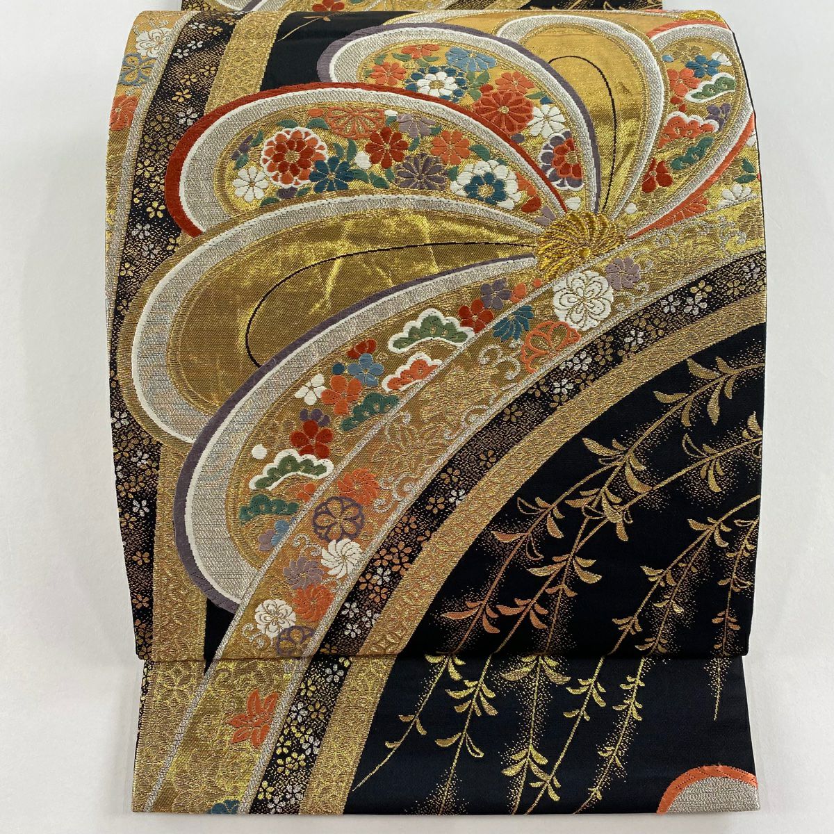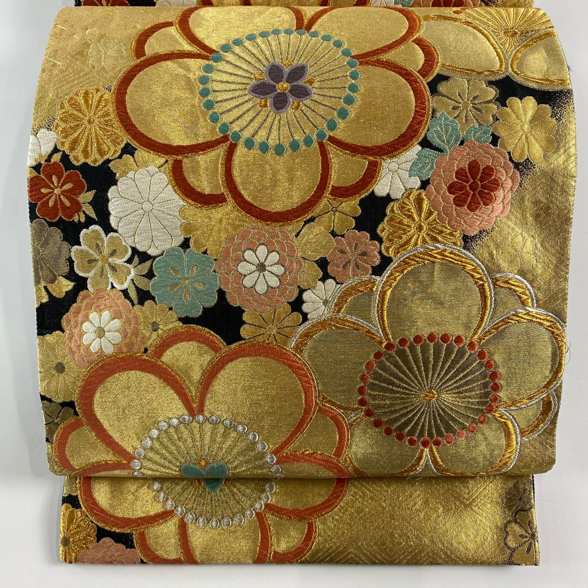 【在庫一掃】 袋帯 秀品 扇面 菊 箔 金糸 金色 六通 正絹