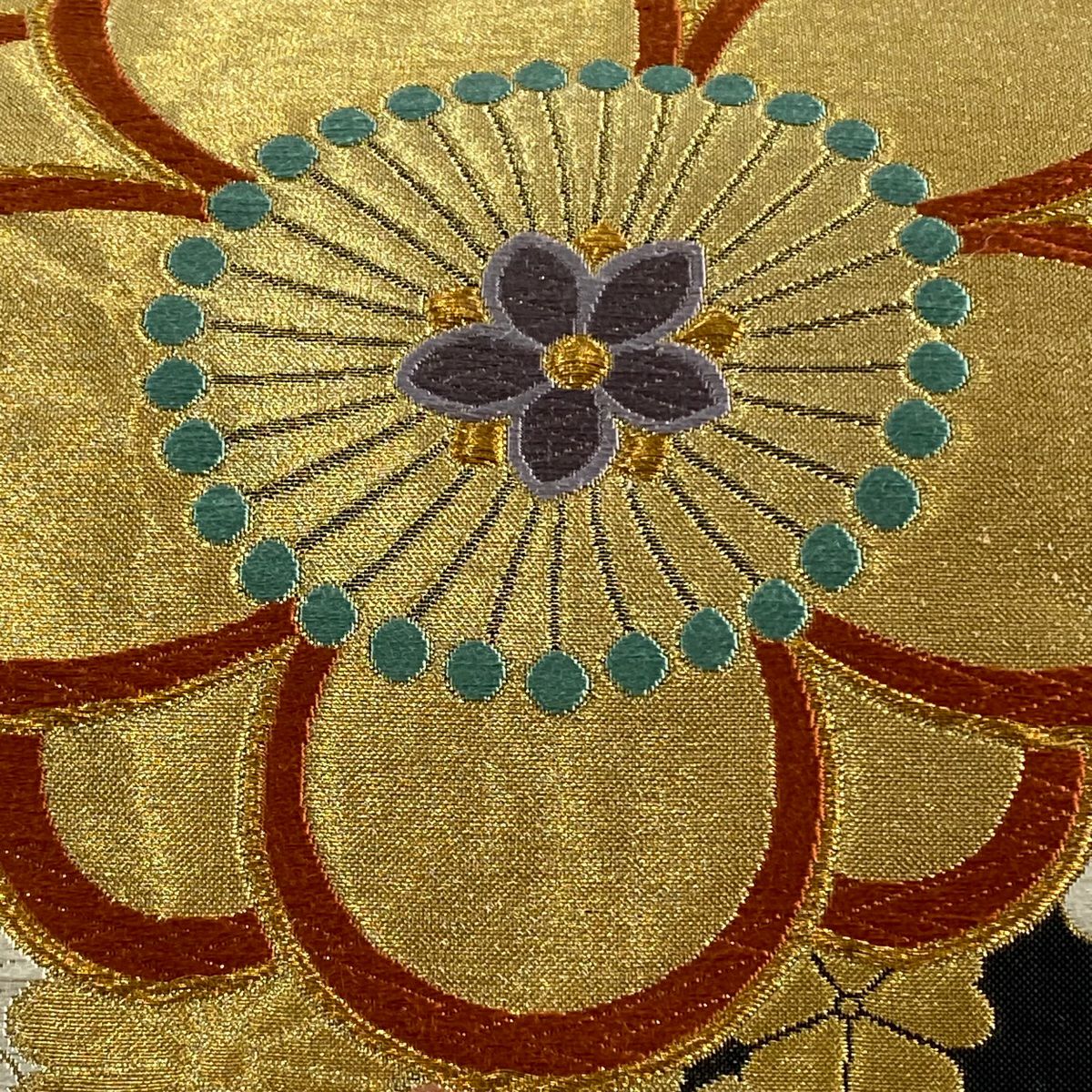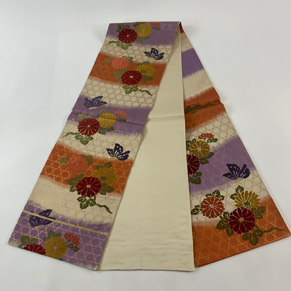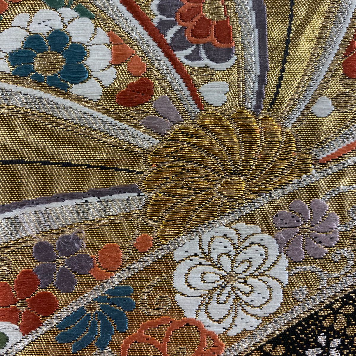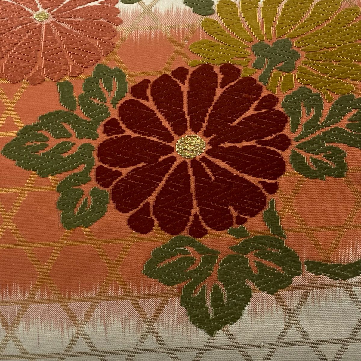 【在庫一掃】 袋帯 秀品 扇面 菊 箔 金糸 金色 六通 正絹