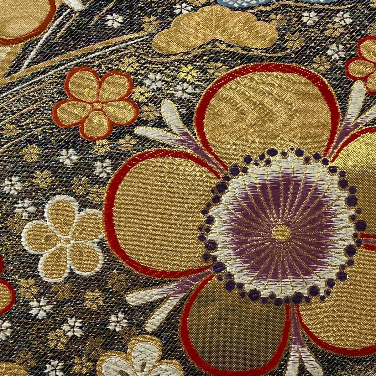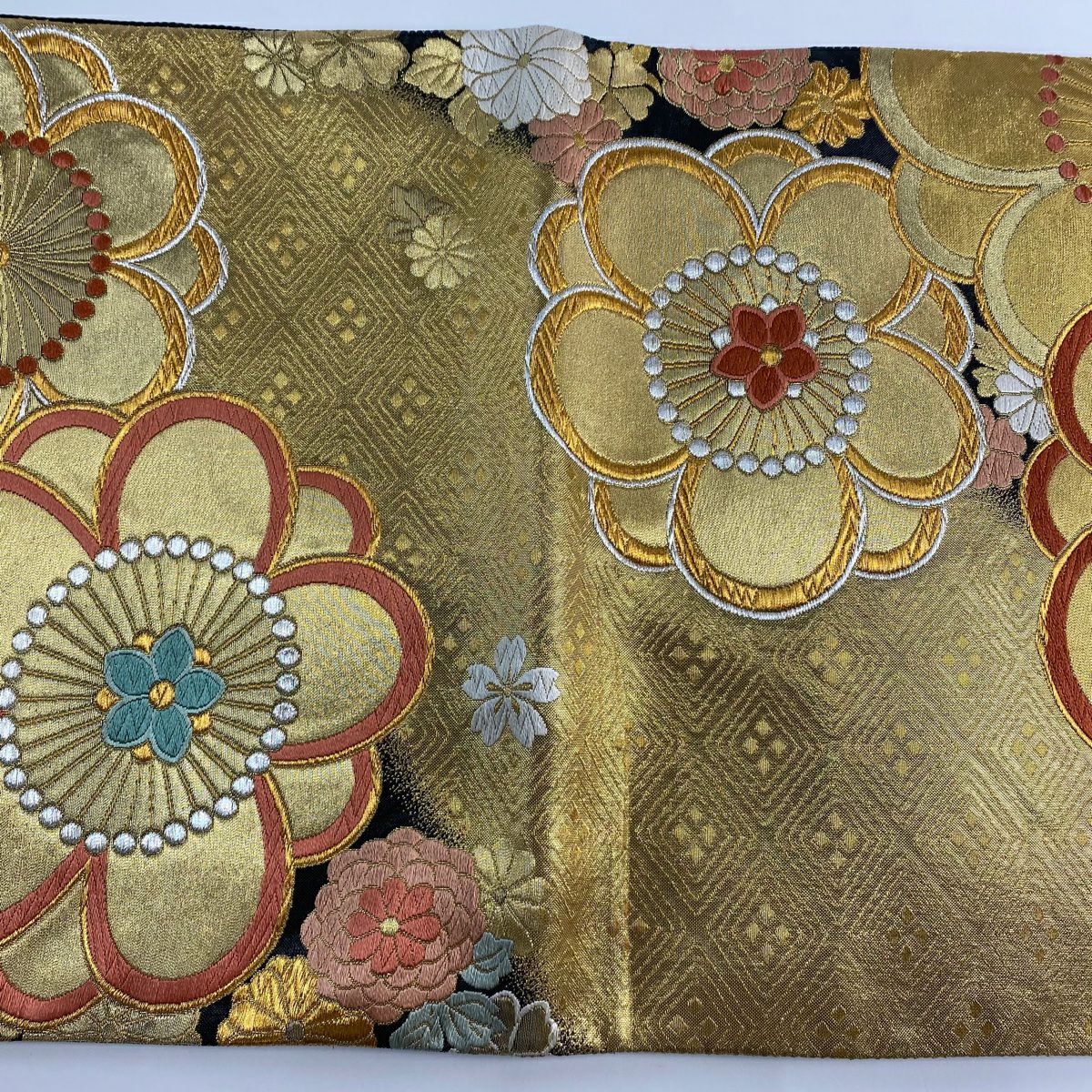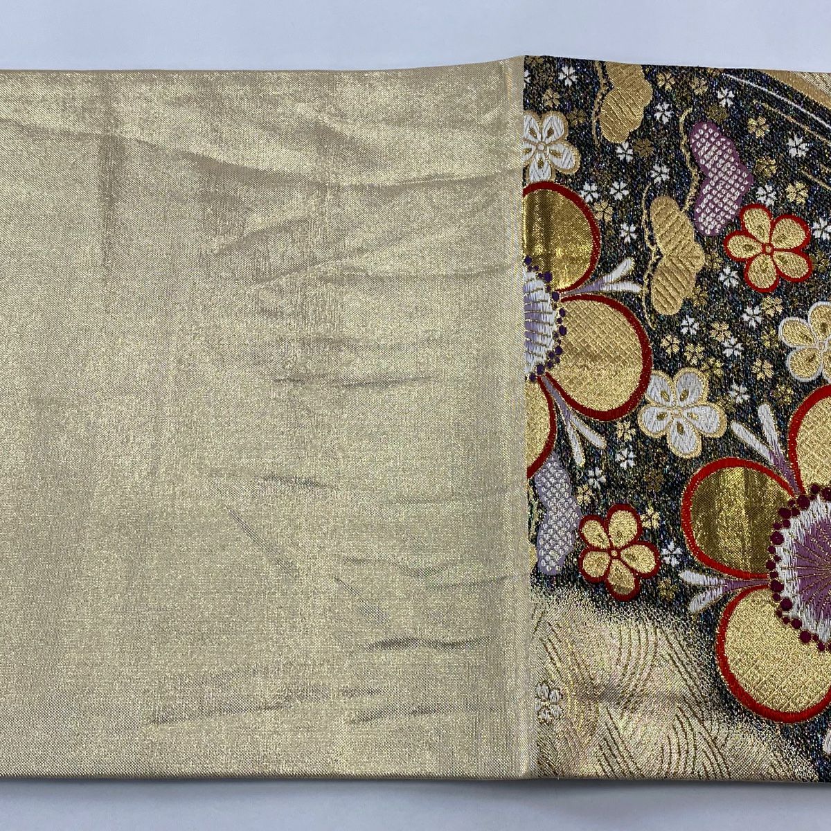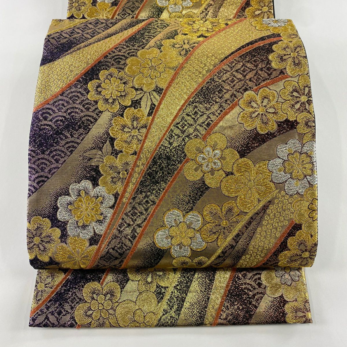 【在庫一掃】 袋帯 秀品 梅 菊 唐織 箔 金色 六通 正絹