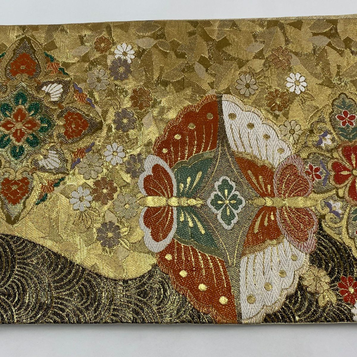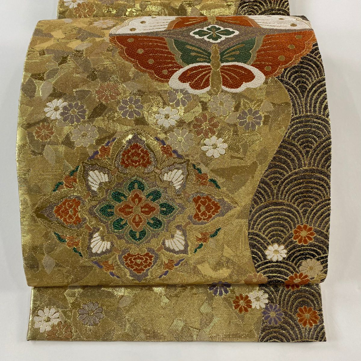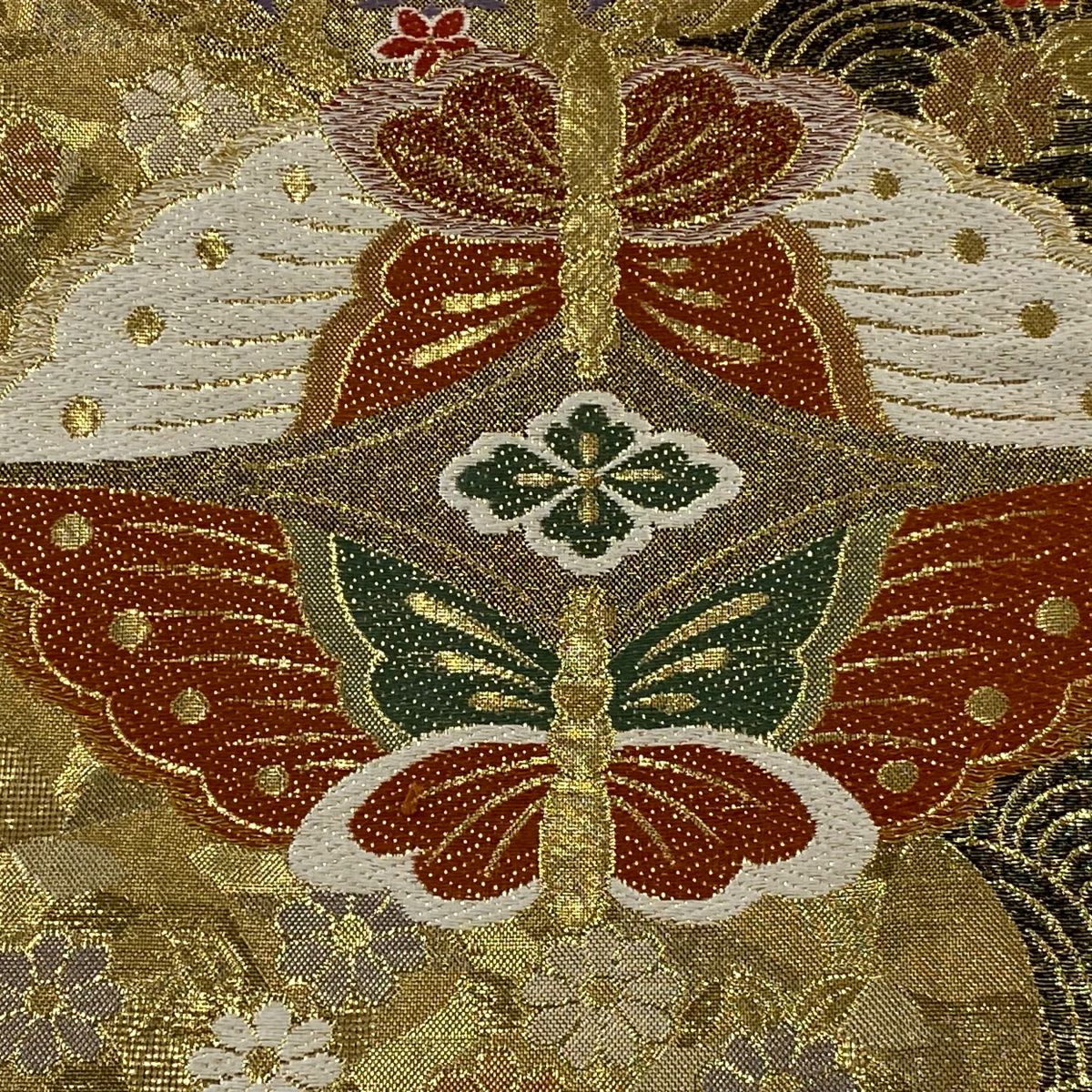 【在庫一掃】 袋帯 秀品 華文 蝶 金糸 箔 金色 六通 正絹