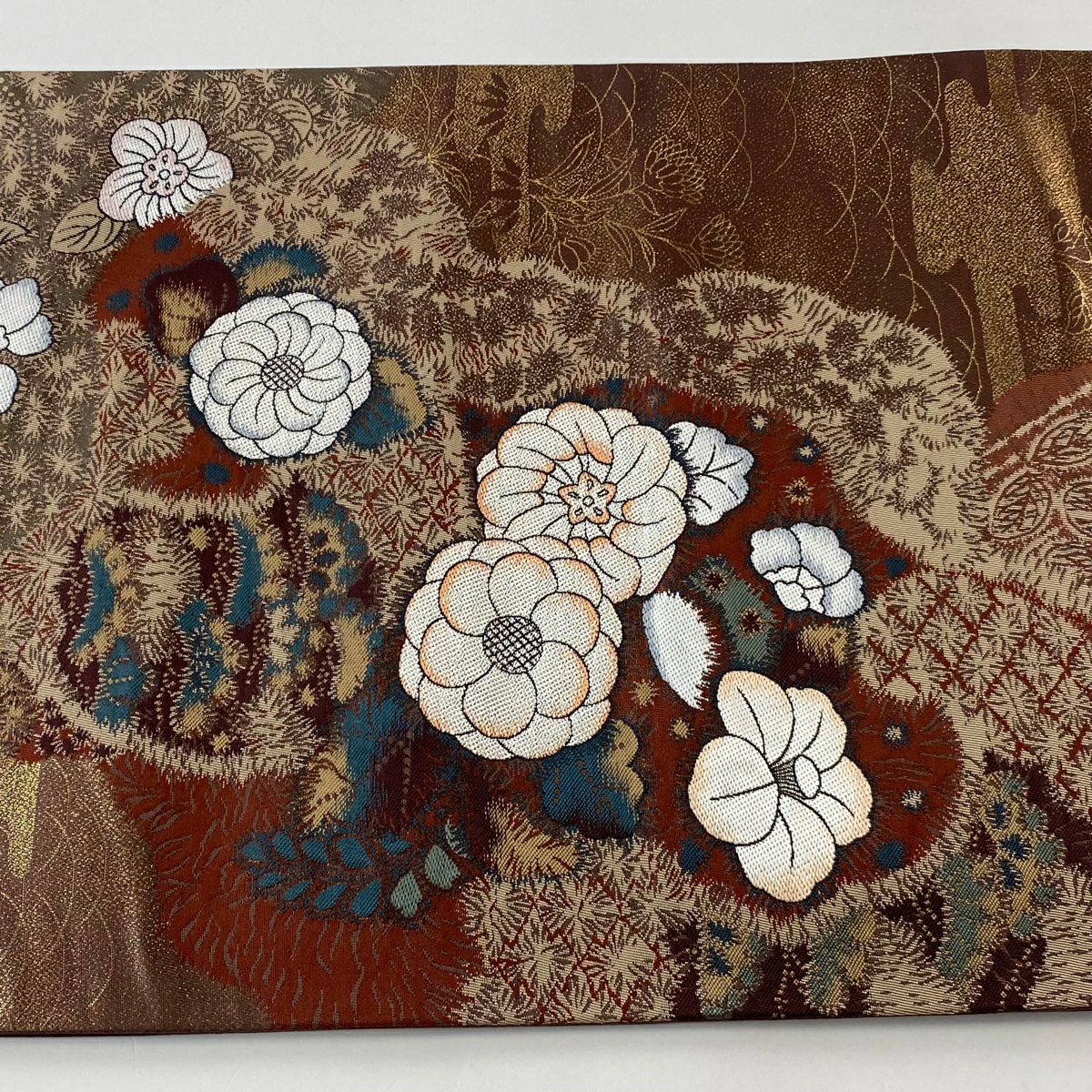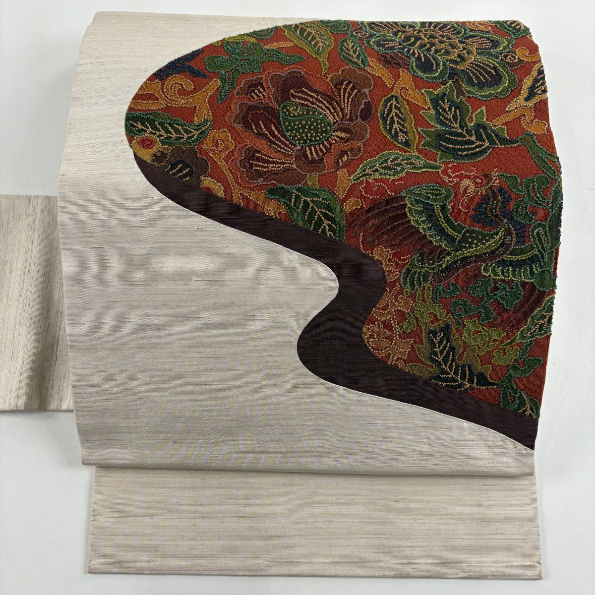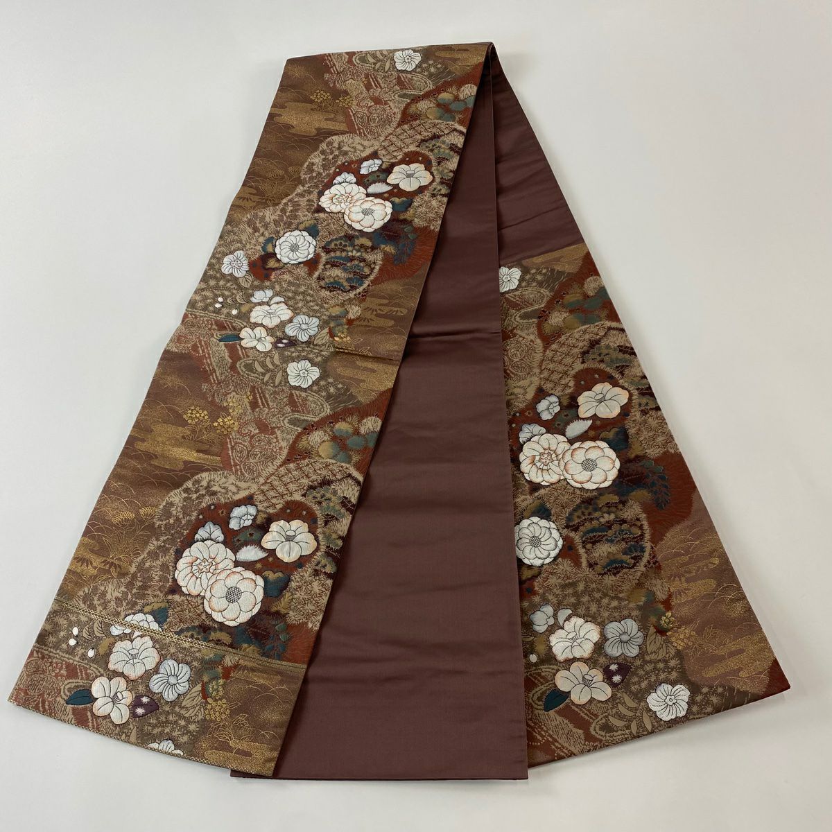 【在庫一掃】 【美品】 袋帯 秀品 龍 草花 茶色 全通 正絹