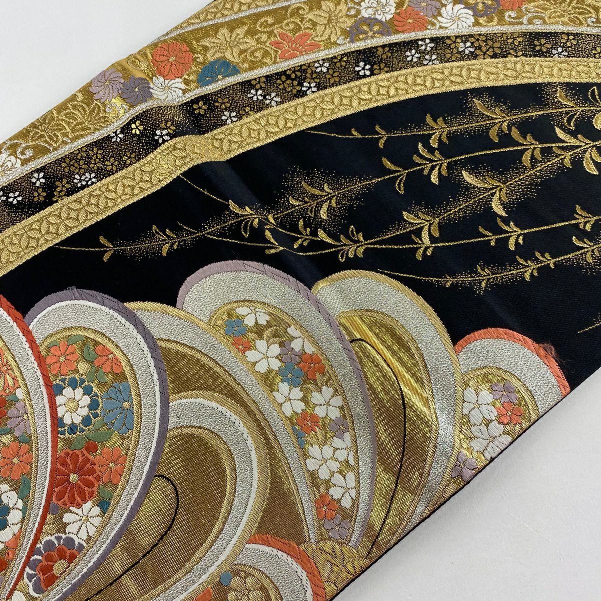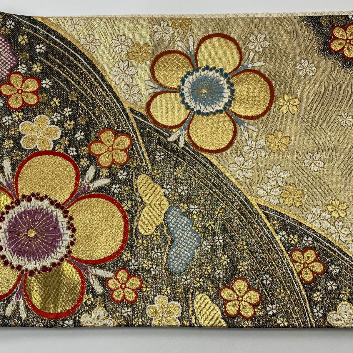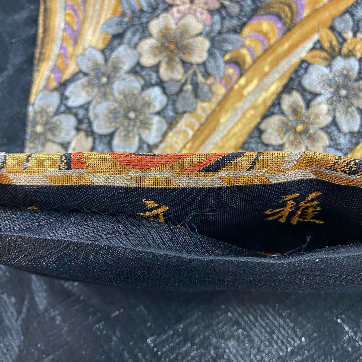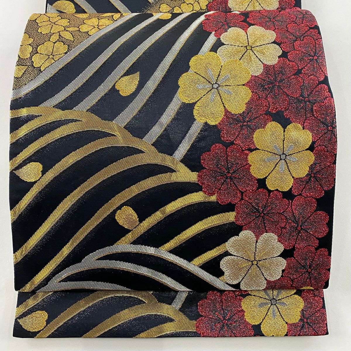 【在庫一掃】 袋帯 秀品 桜 波 金銀糸 箔 黒 六通 正絹