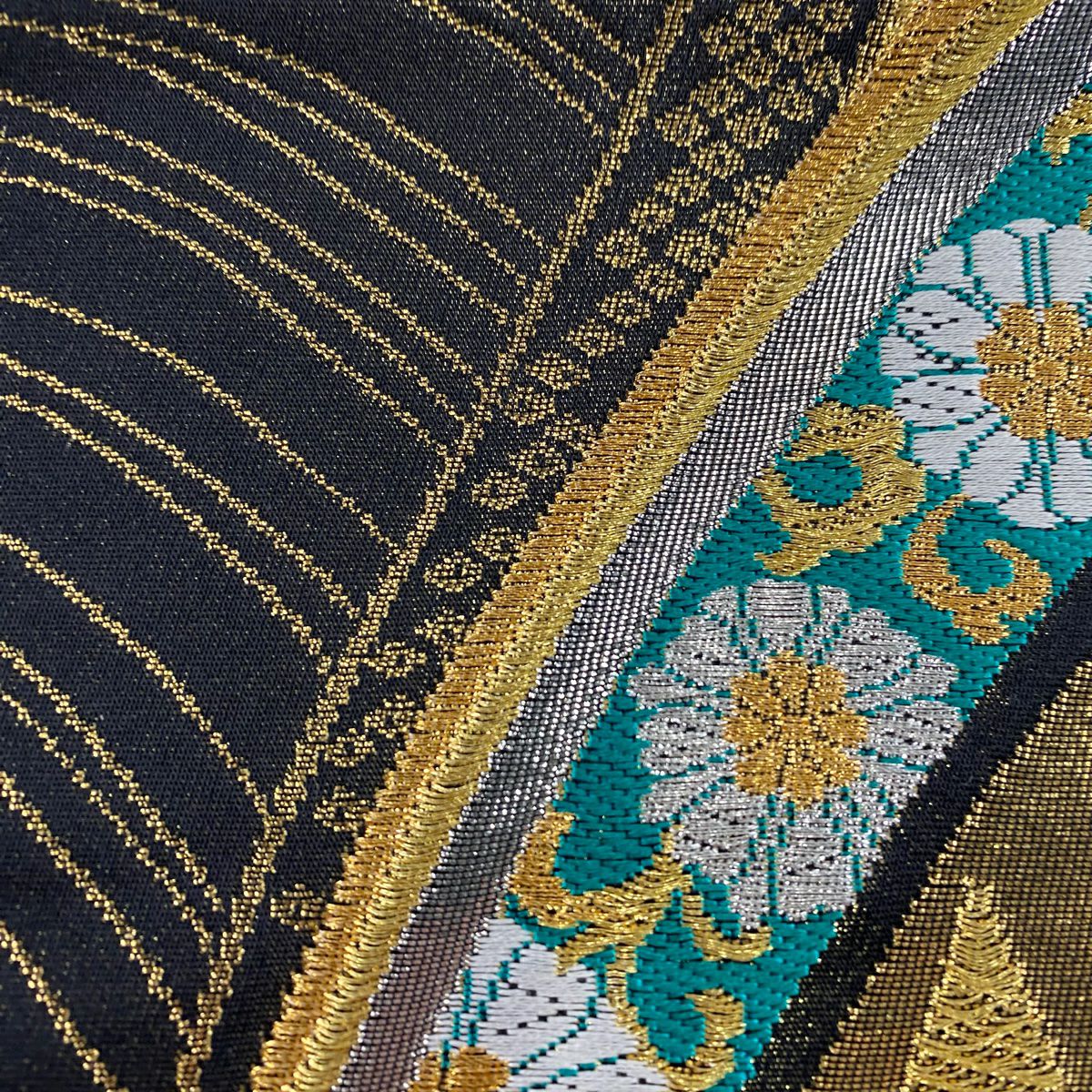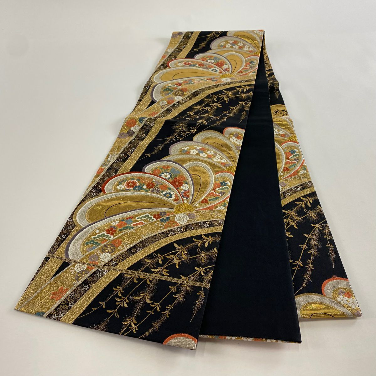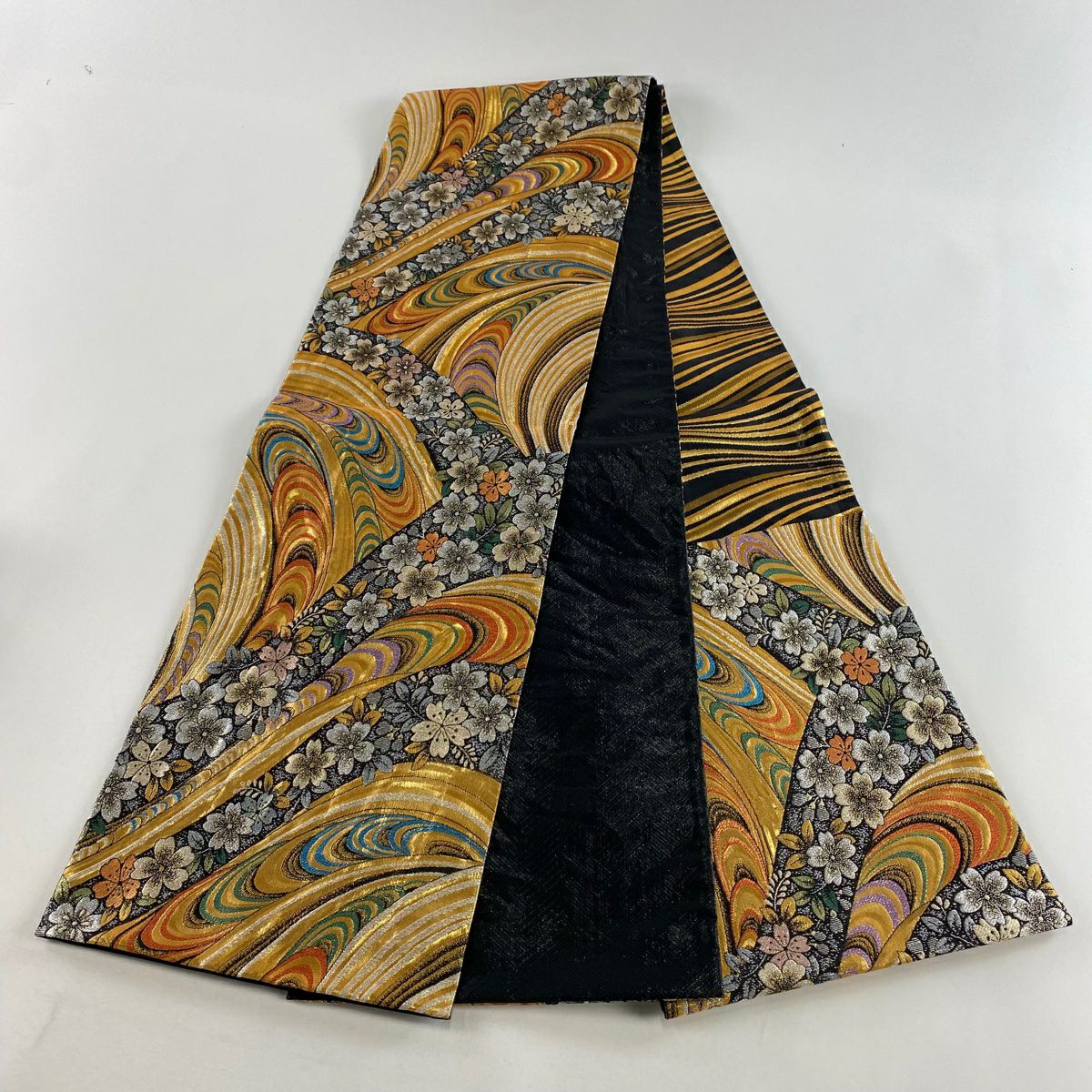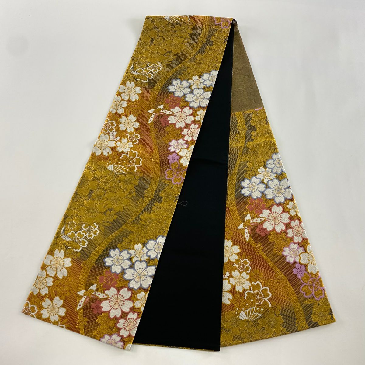 【在庫一掃】 袋帯 秀品 桜 波 金銀糸 箔 黒 六通 正絹