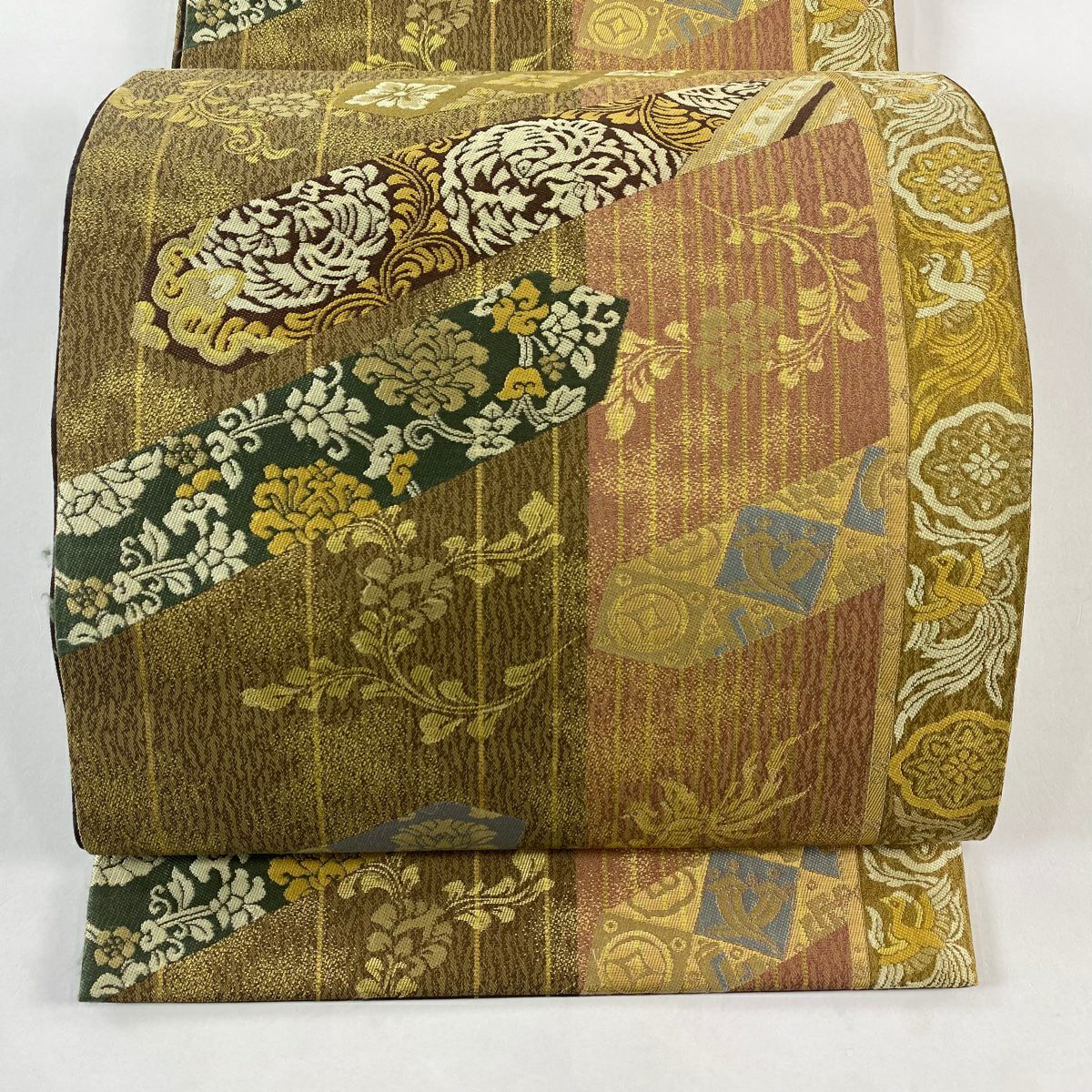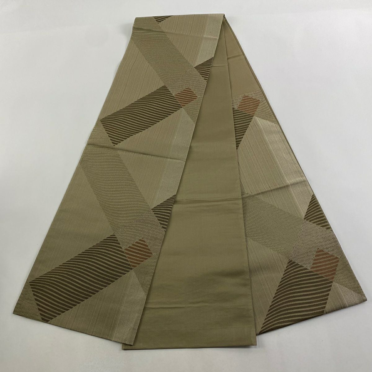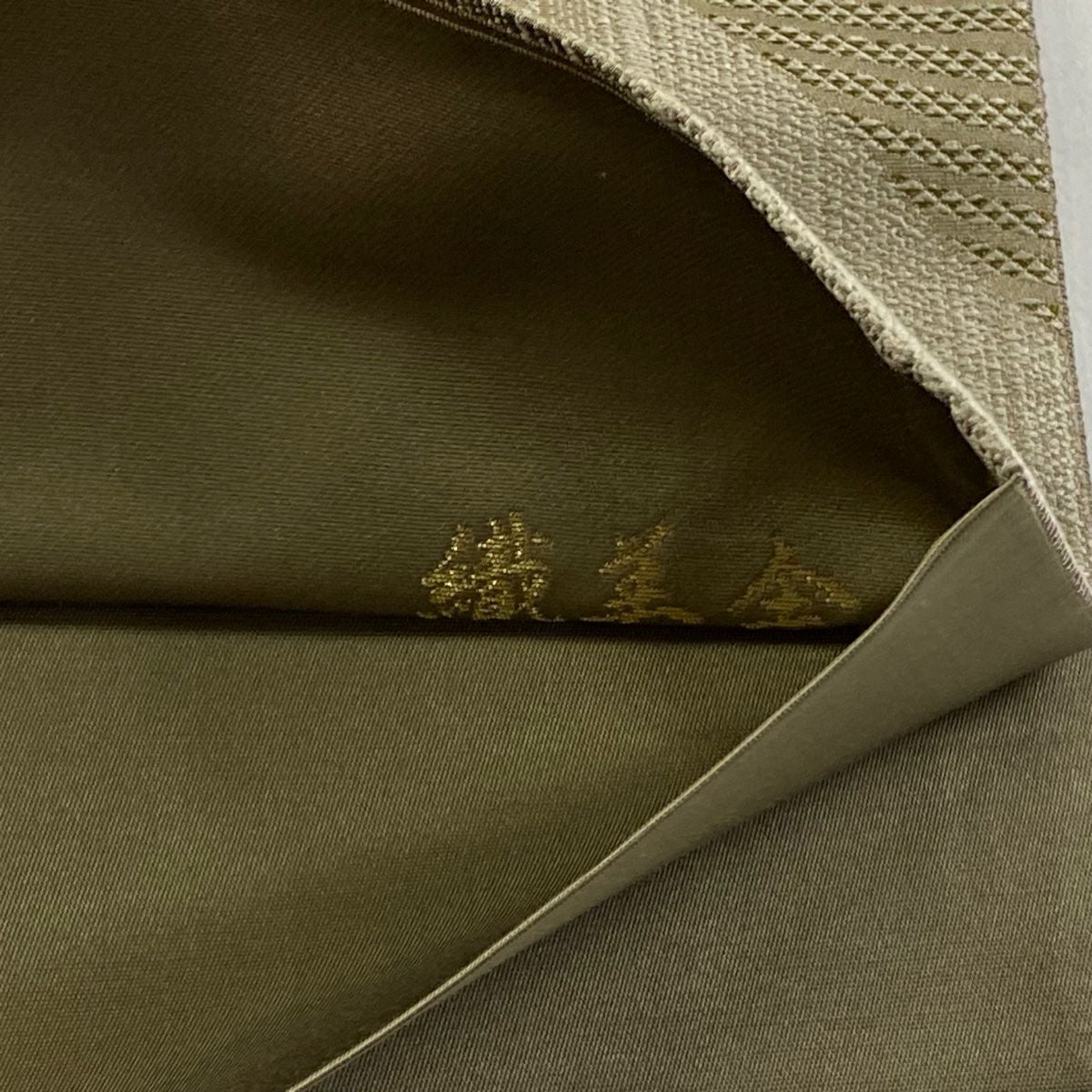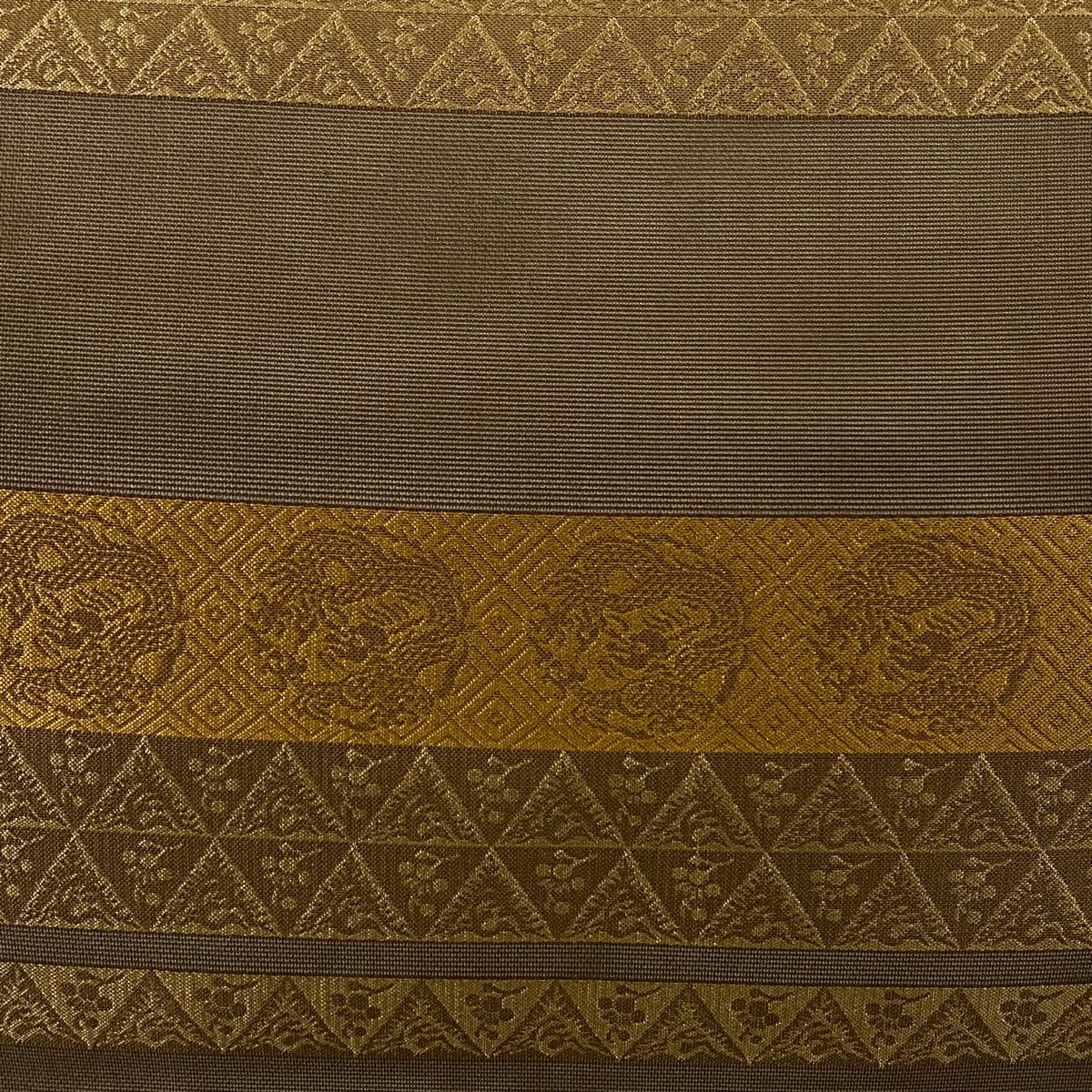 【在庫一掃】 袋帯 秀品 幾何学模様 箔 茶緑色 全通 正絹