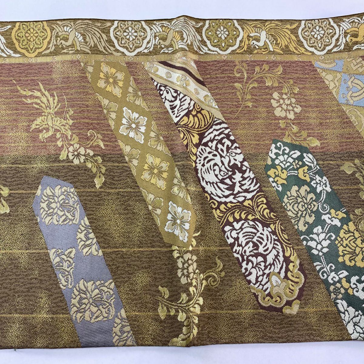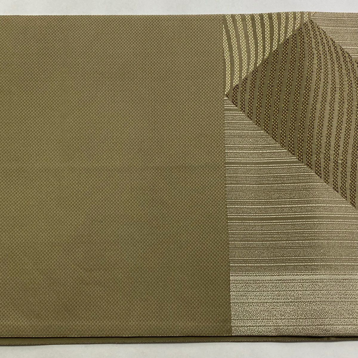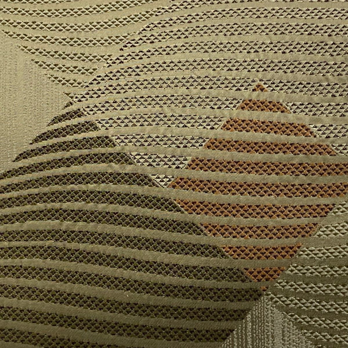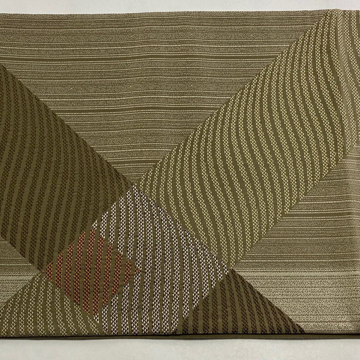 【在庫一掃】 袋帯 秀品 幾何学模様 箔 茶緑色 全通 正絹