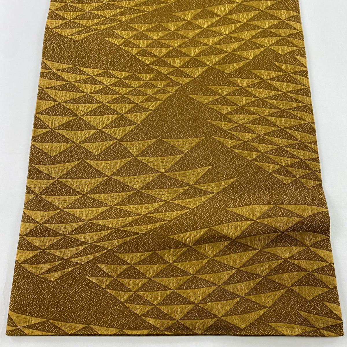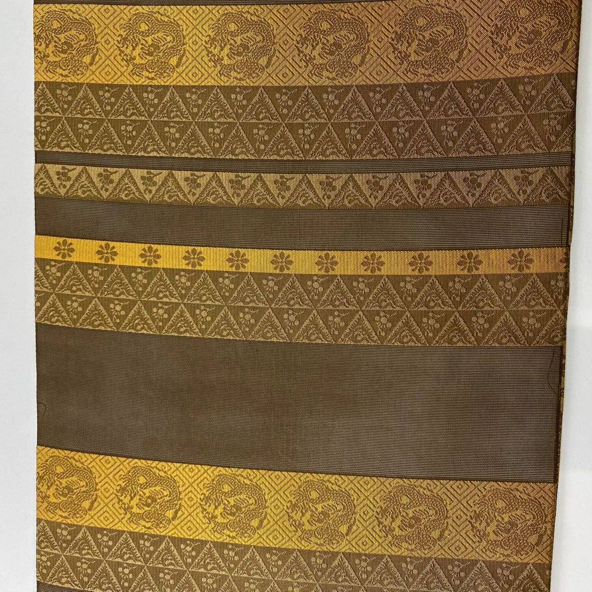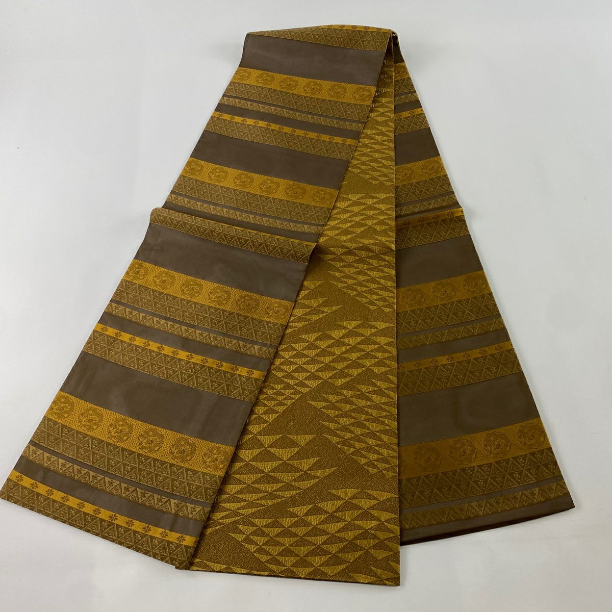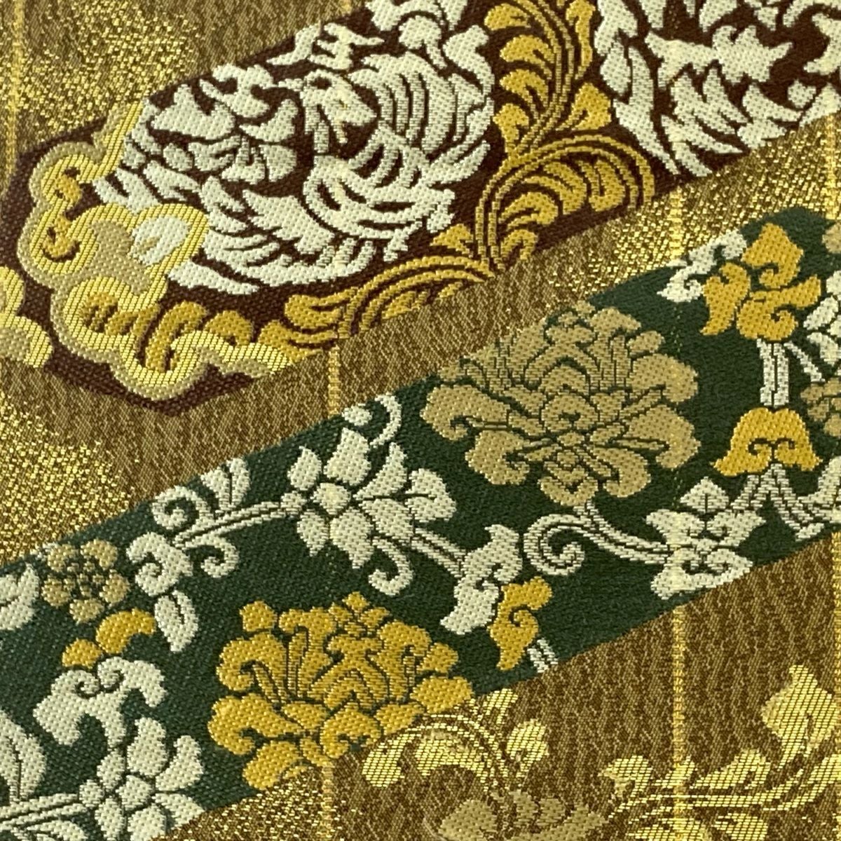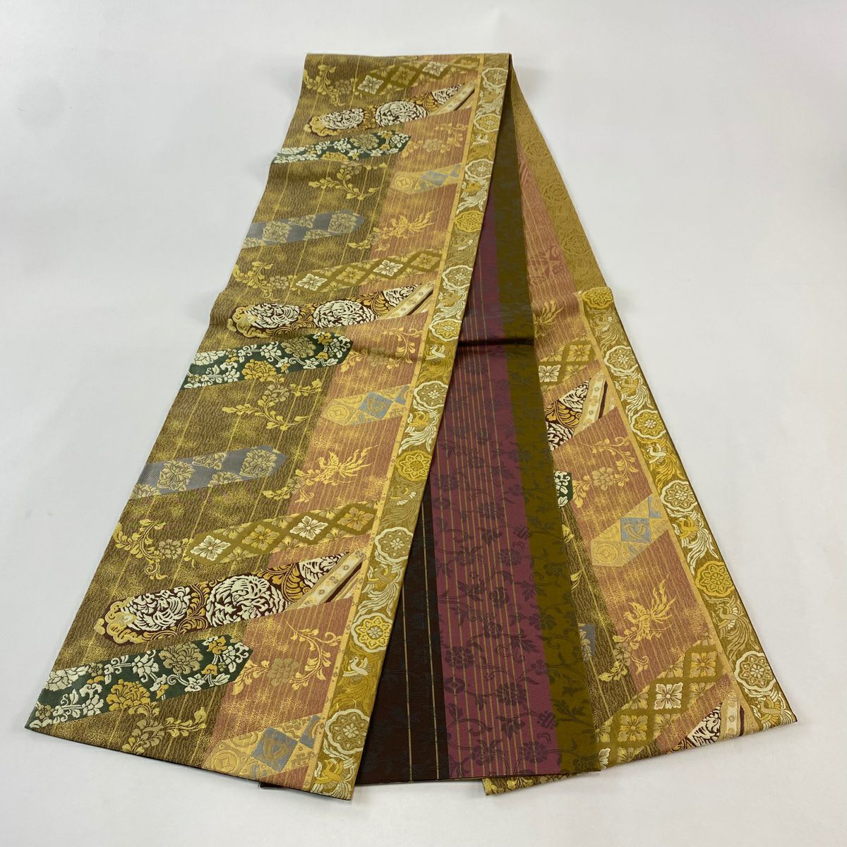 【在庫一掃】 袋帯 秀品 幾何学模様 箔 茶緑色 全通 正絹