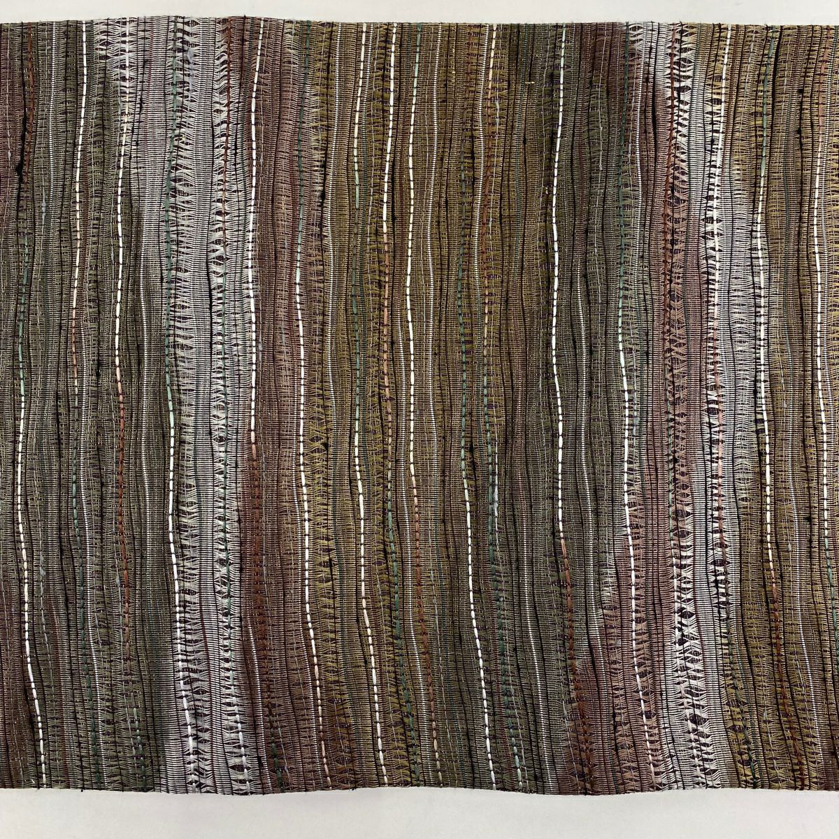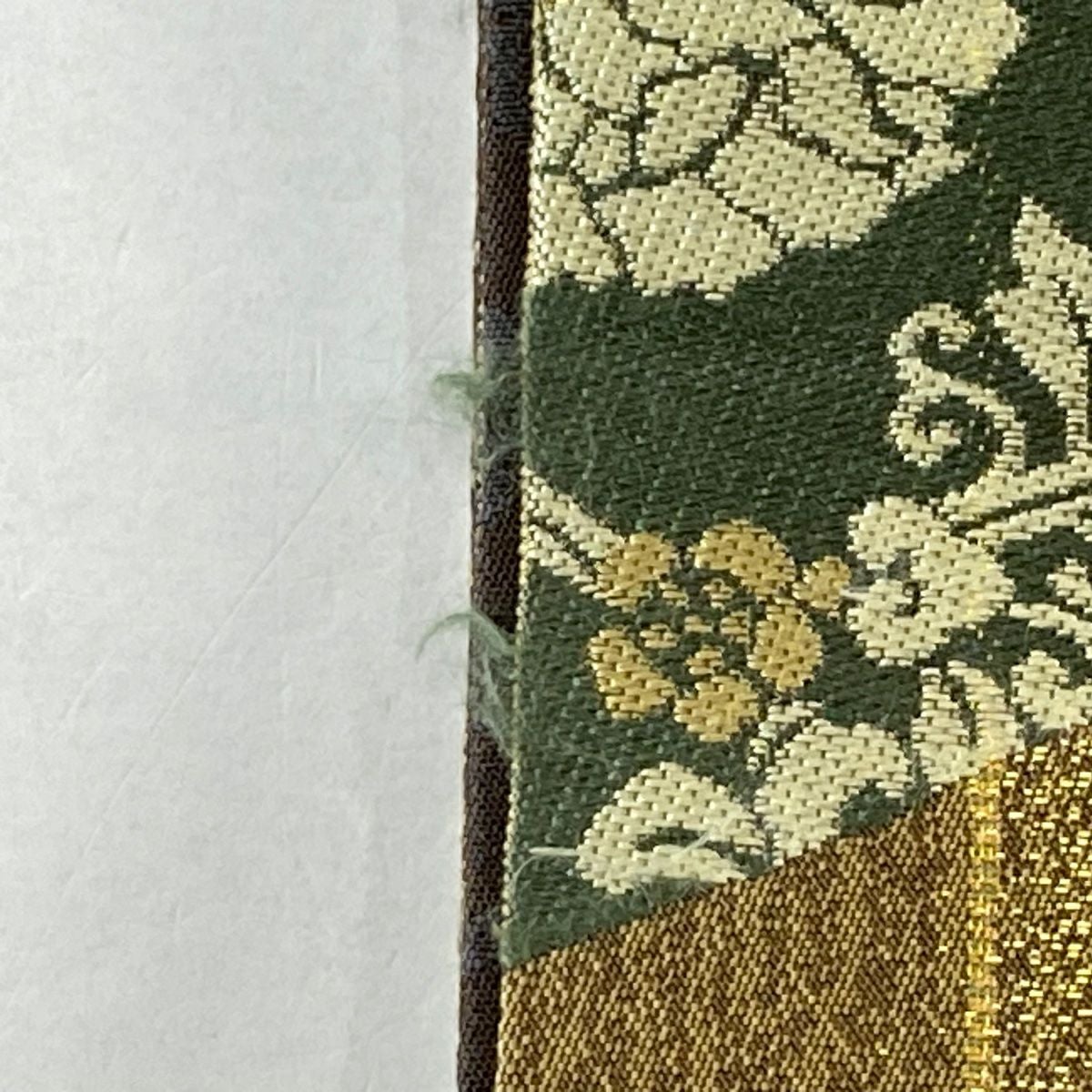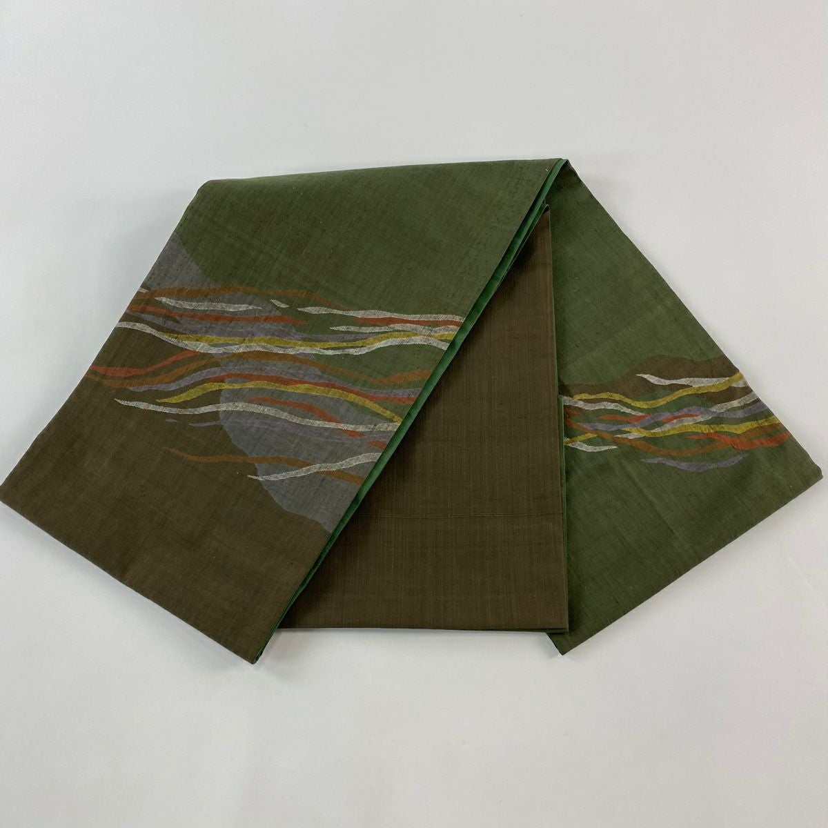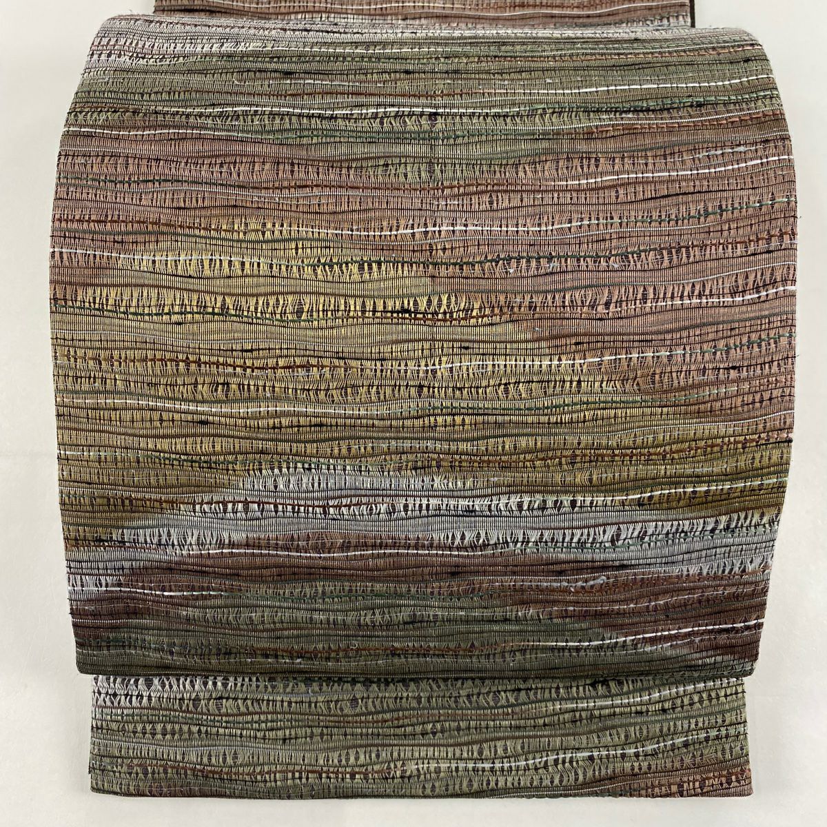 【在庫一掃】 袋帯 秀品 幾何学模様 箔 茶緑色 全通 正絹