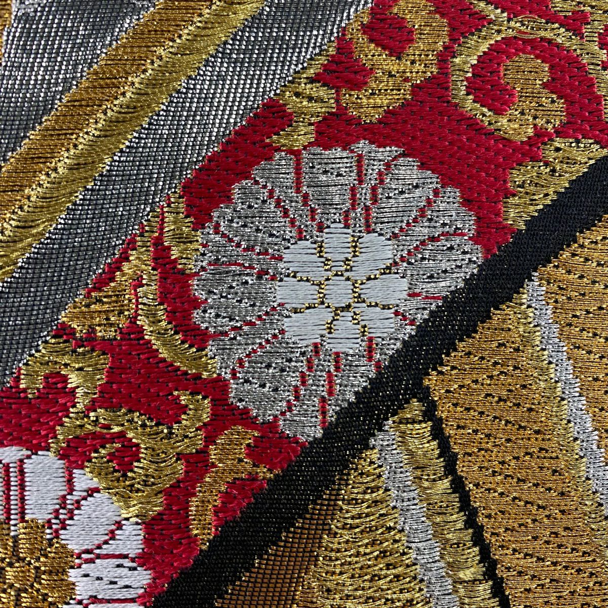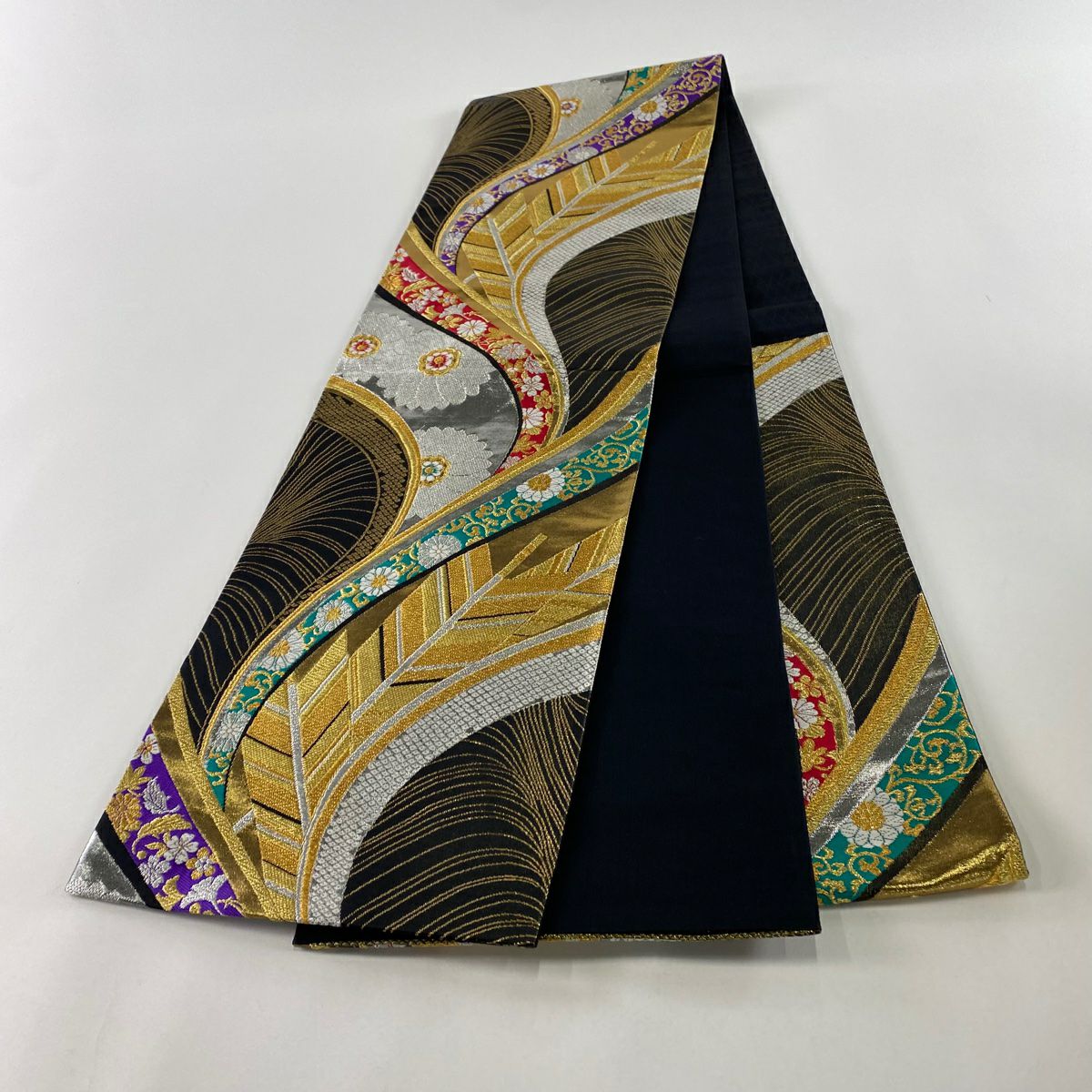 【美品】 袋帯 秀品 菊 矢羽 金銀糸 唐織 黒 六通 正絹