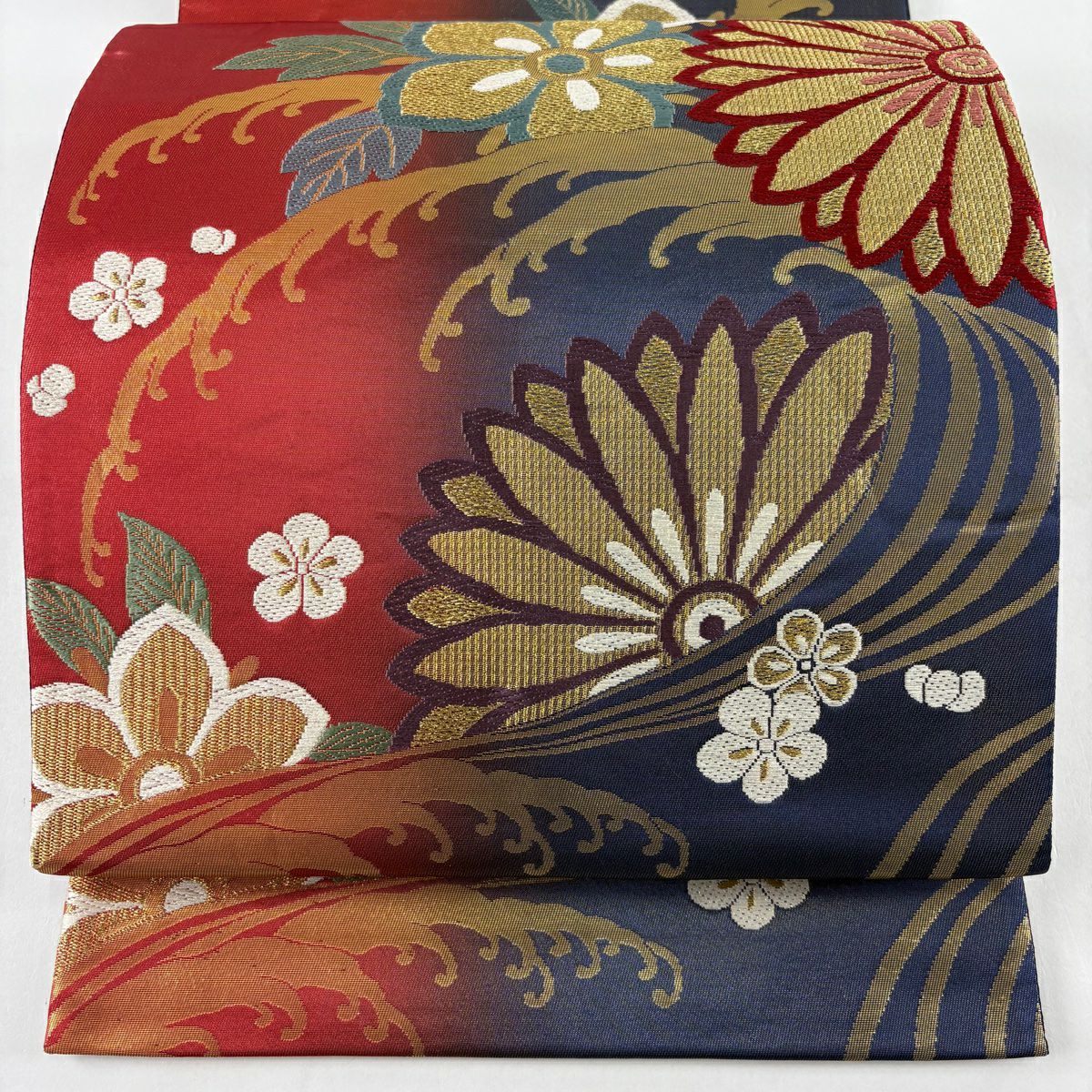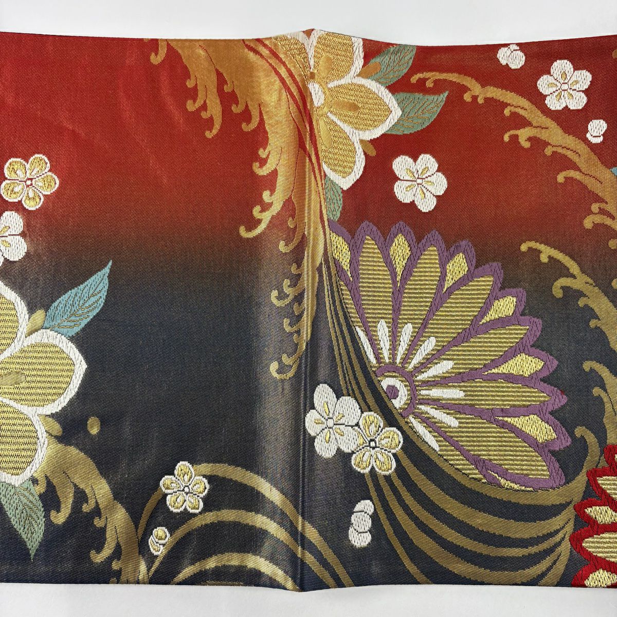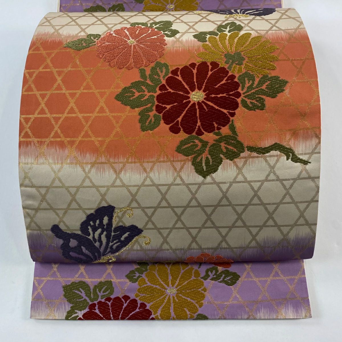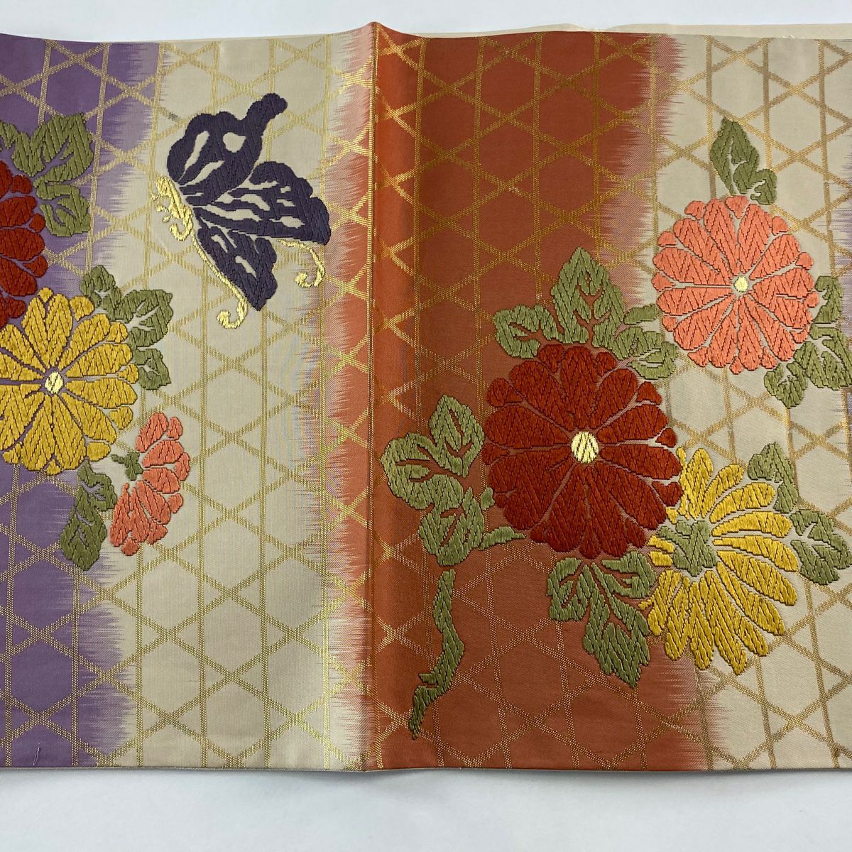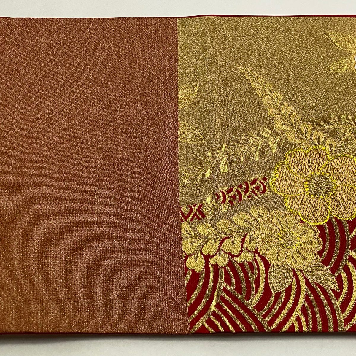 【在庫一掃】 袋帯 秀品 菊 蝶 唐織 箔 朱色 六通 正絹