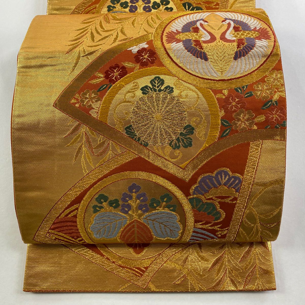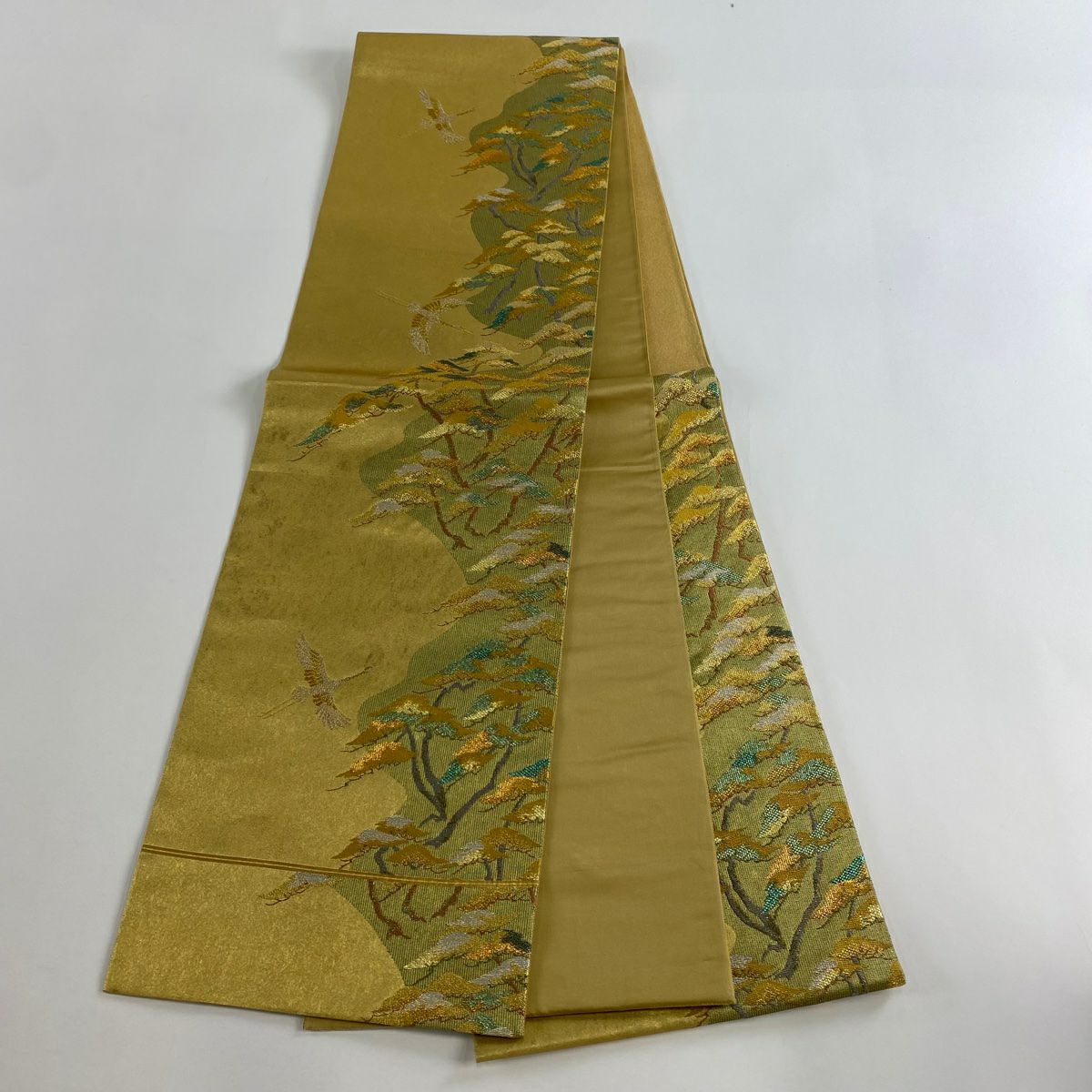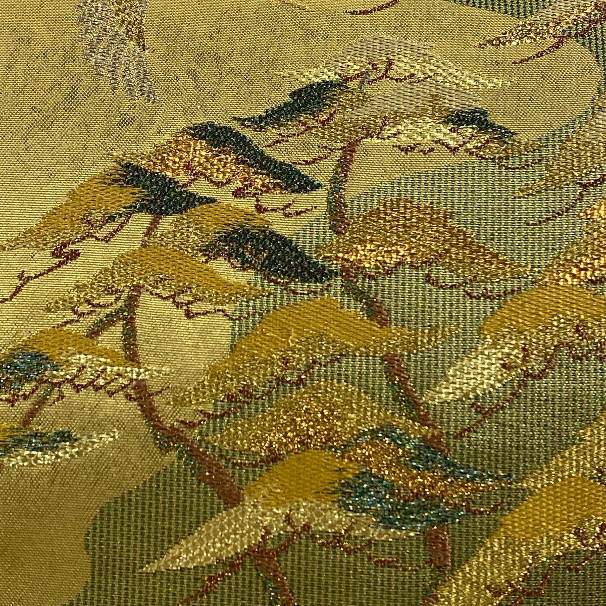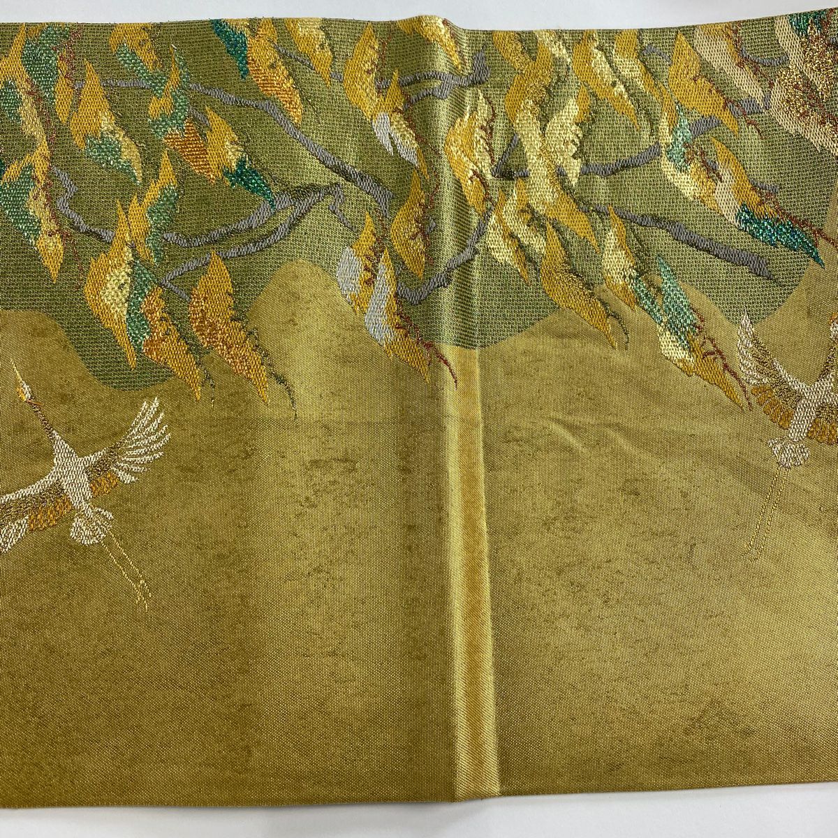 【在庫一掃】 袋帯 秀品 鶴 桐 金糸 刺繍 金色 六通 正絹