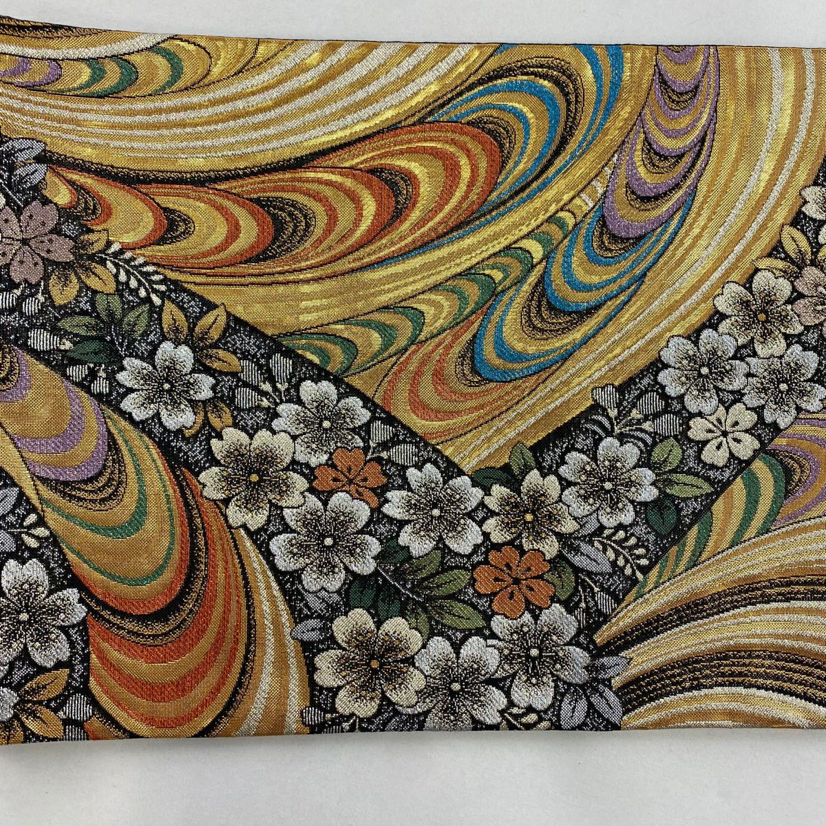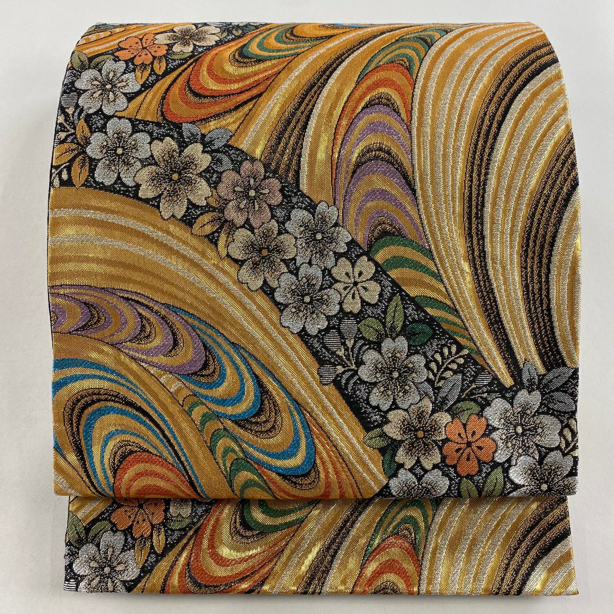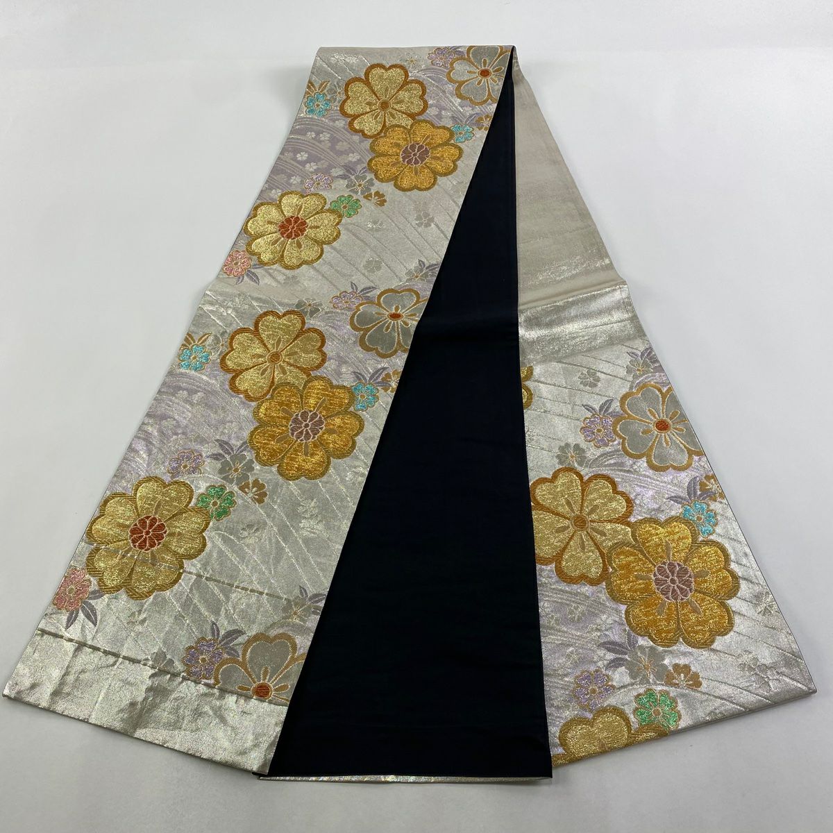 【在庫一掃】 袋帯 秀品 桜 波 唐織 箔 銀色 六通 正絹