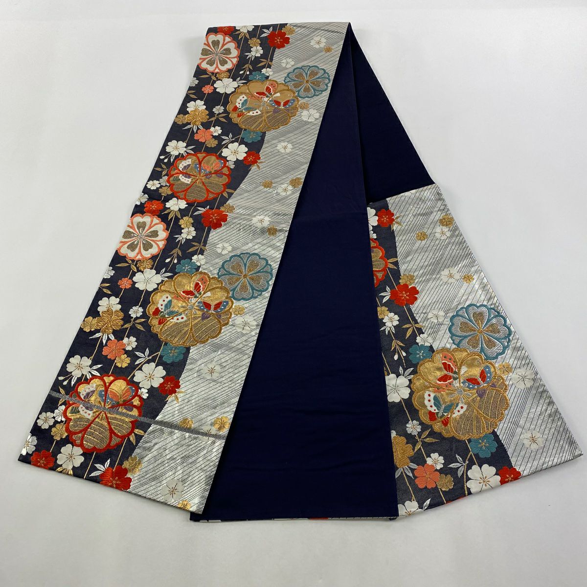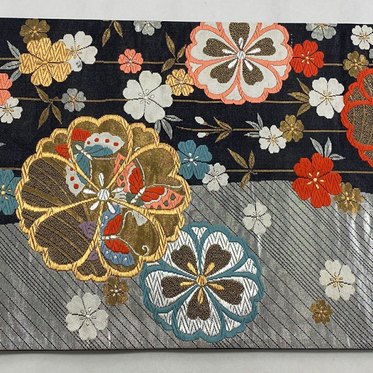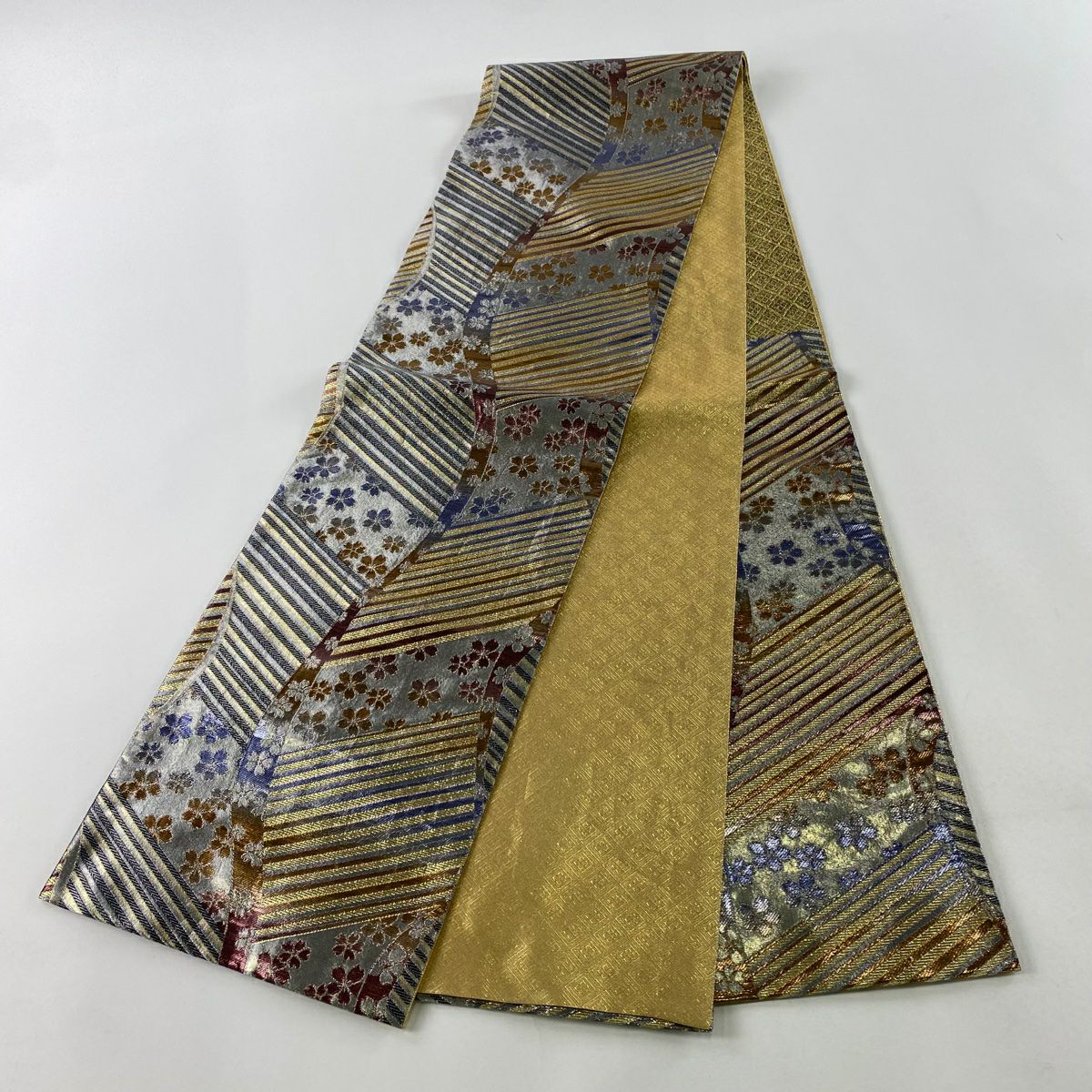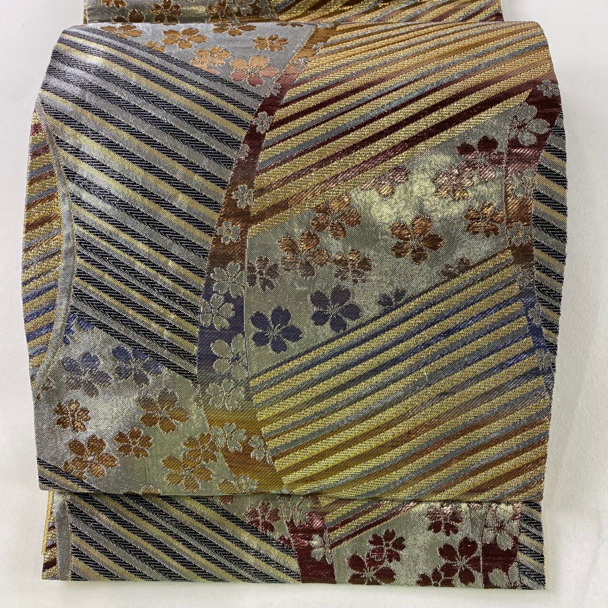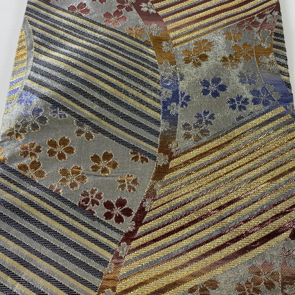 【在庫一掃】 袋帯 秀品 桜 斜縞 箔 銀糸 銀色 六通 正絹