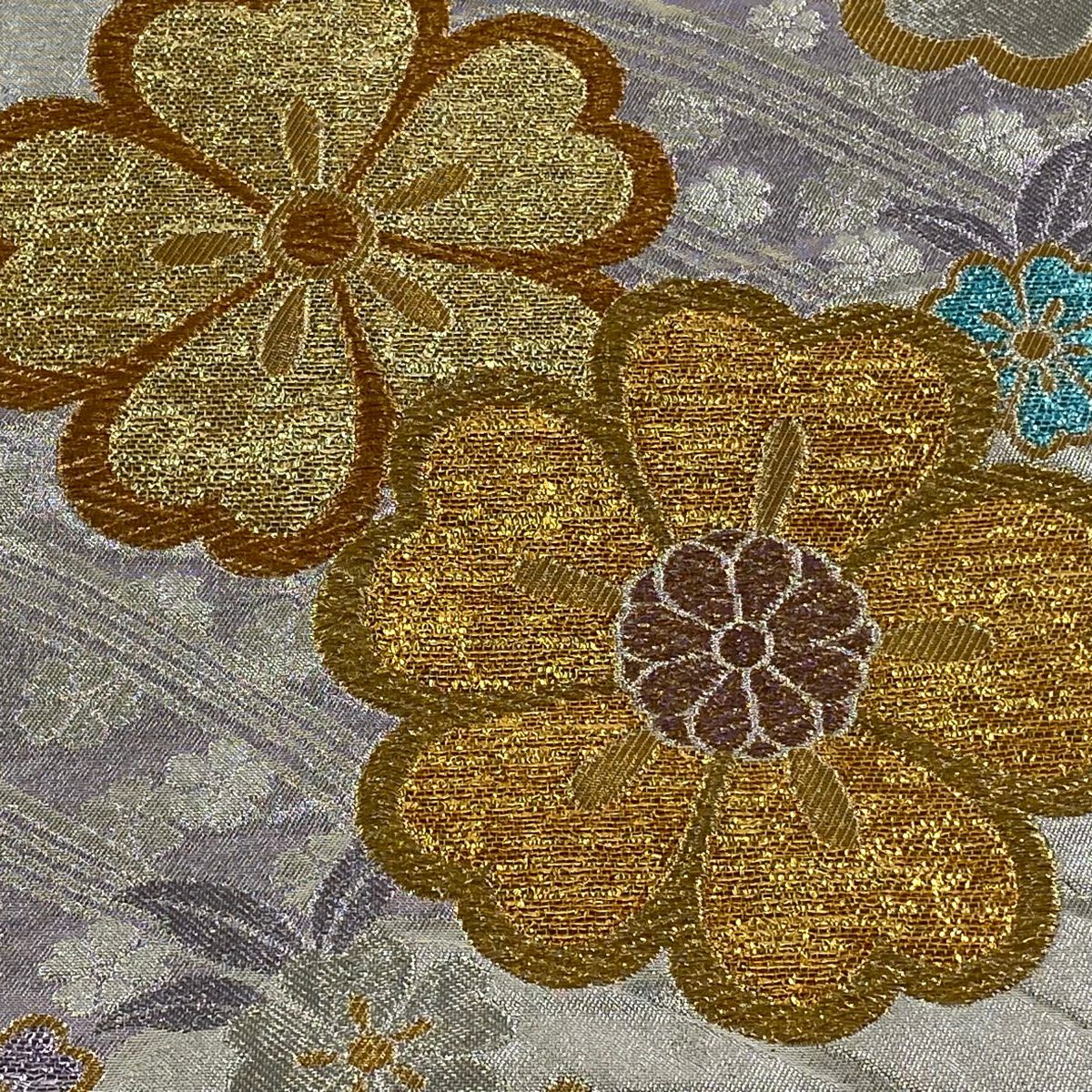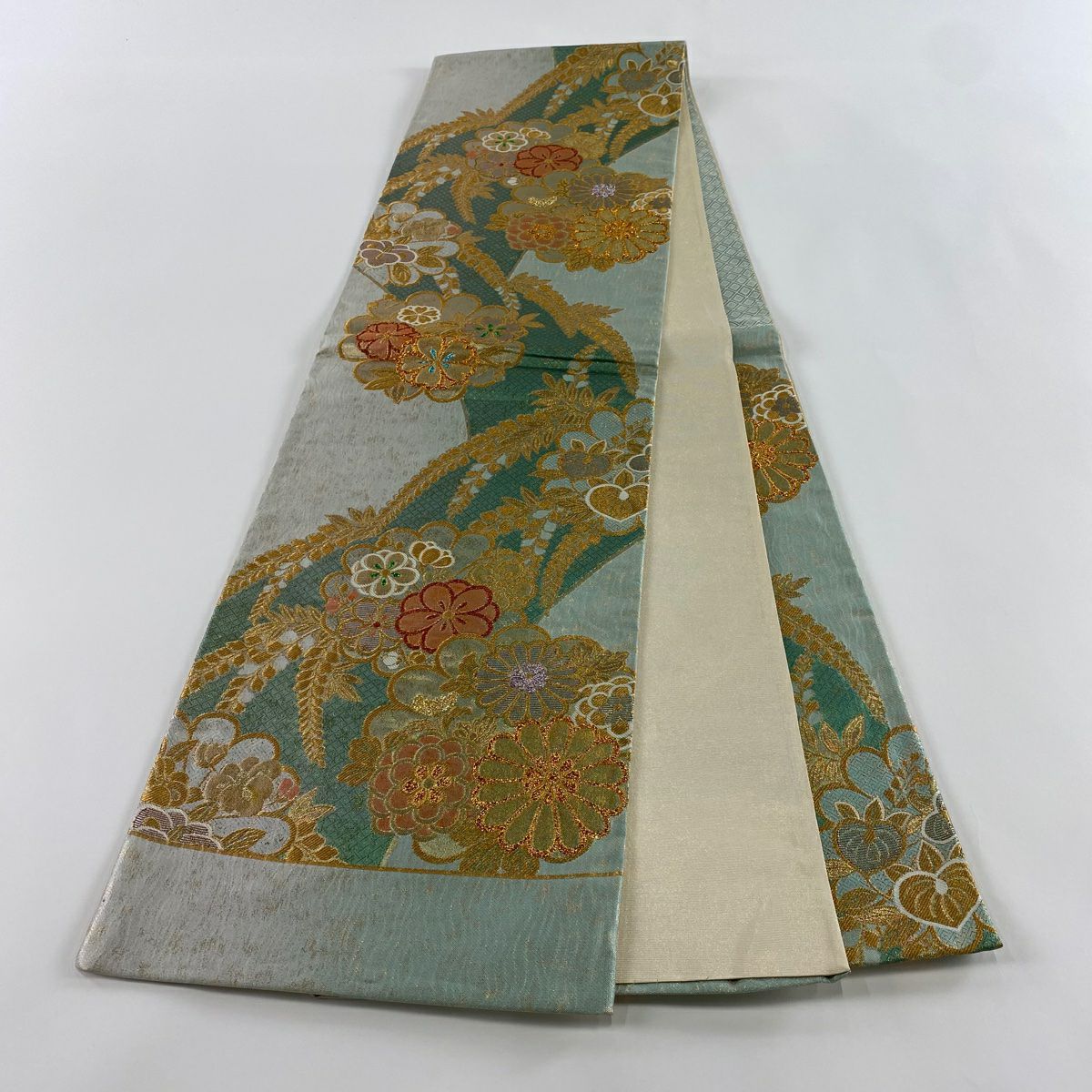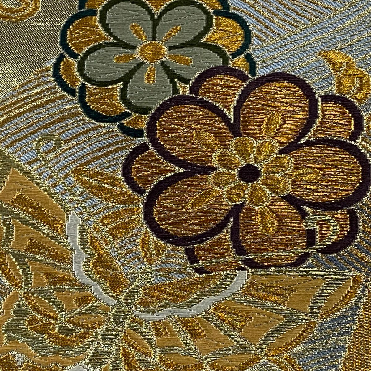 【在庫一掃】 袋帯 秀品 菊 桜 金糸 箔 水色 六通 正絹