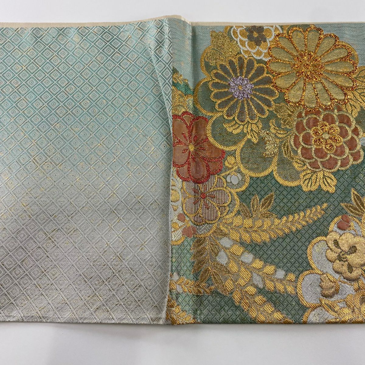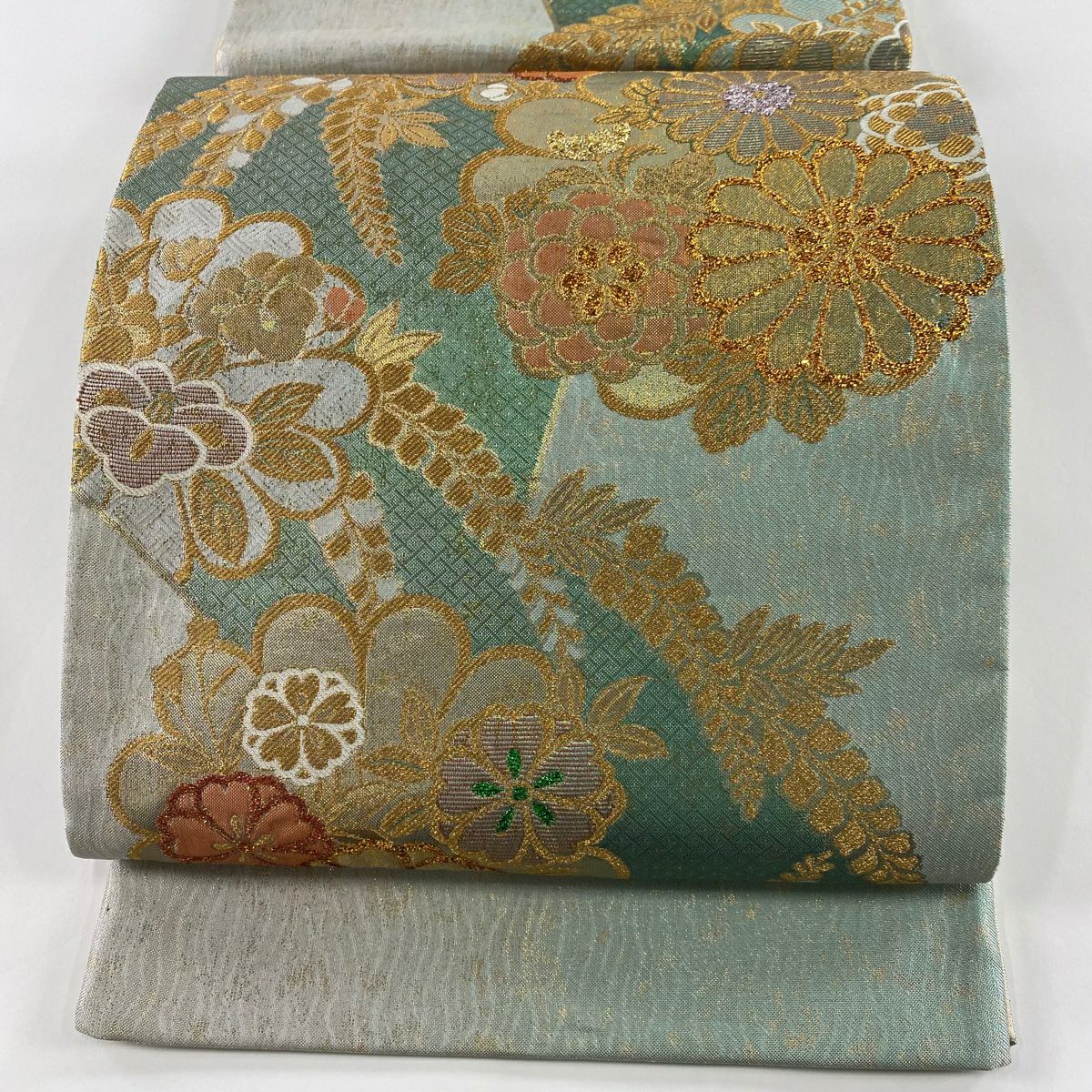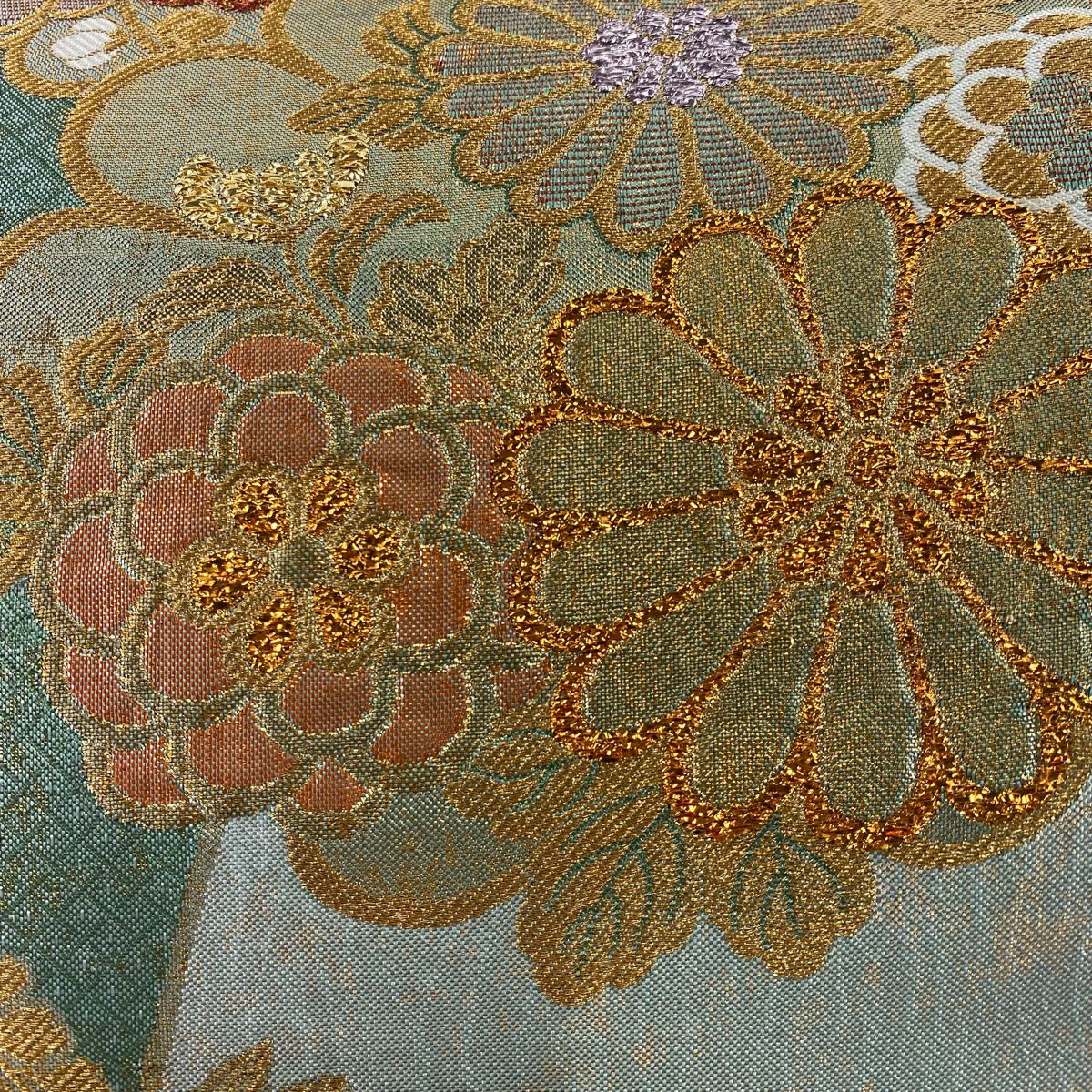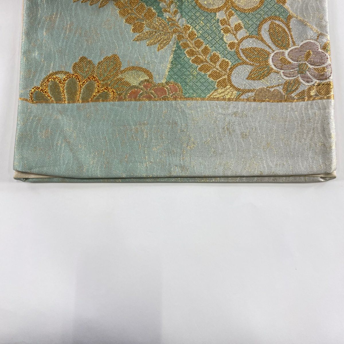 【在庫一掃】 袋帯 秀品 菊 桜 金糸 箔 水色 六通 正絹