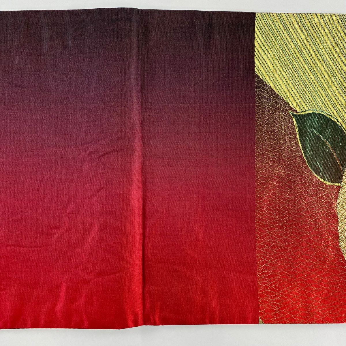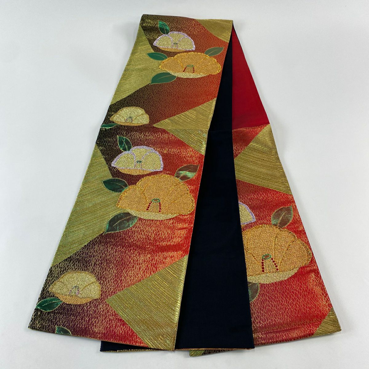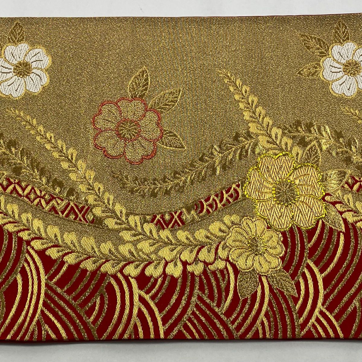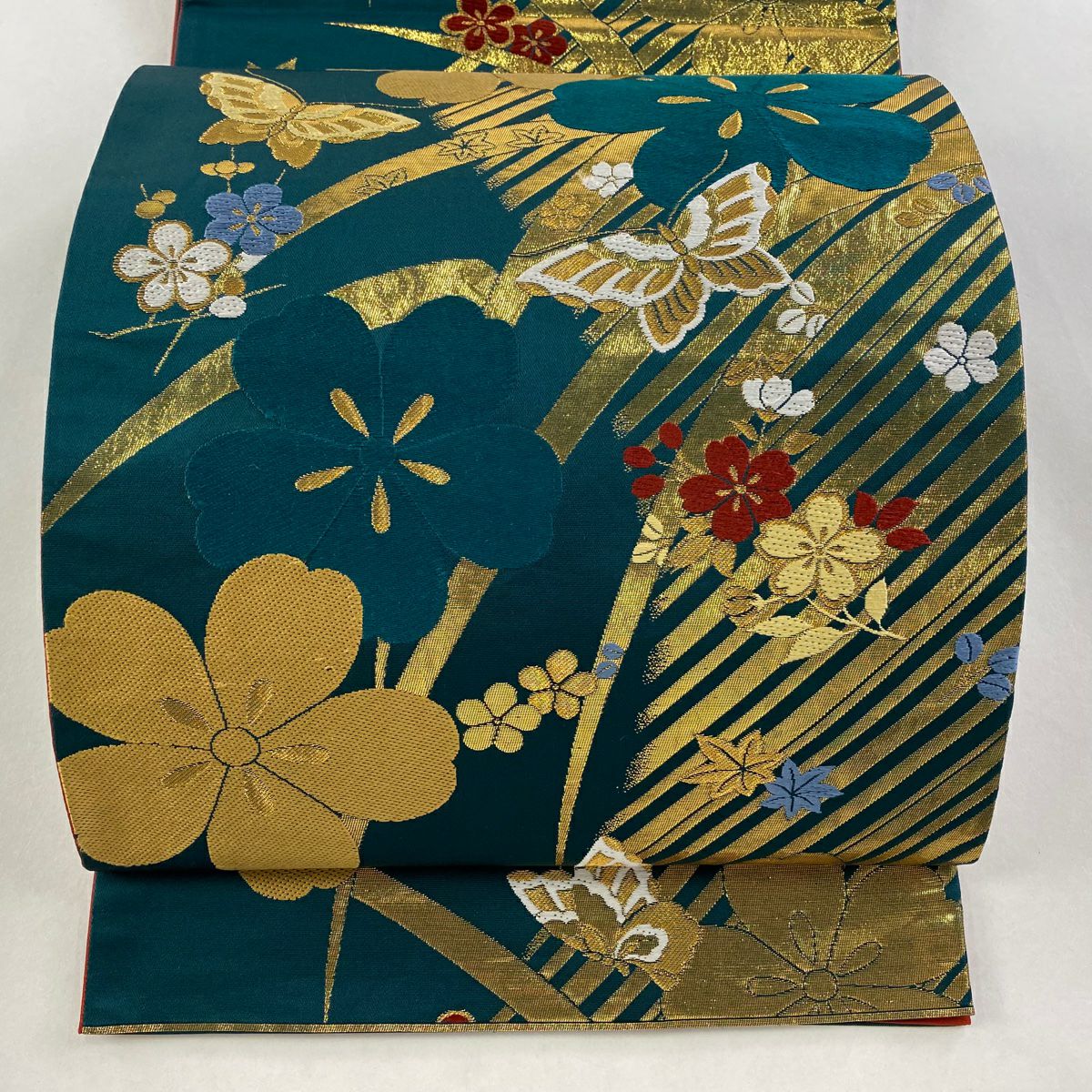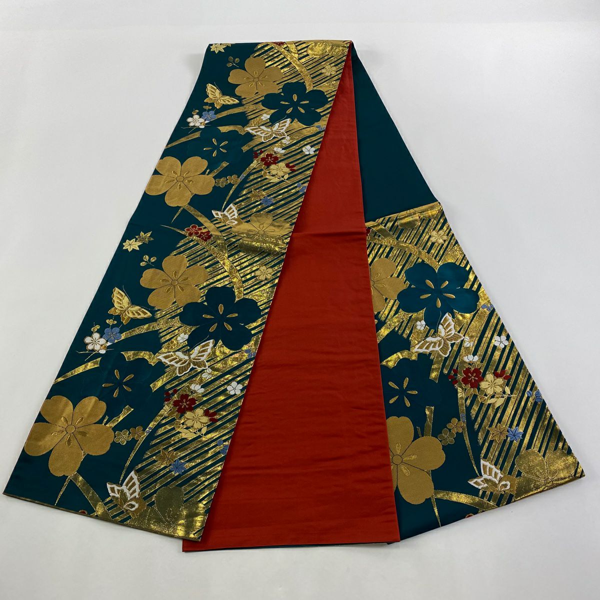 【在庫一掃】 袋帯 秀品 椿 斜縞 金糸 箔 赤 六通 正絹