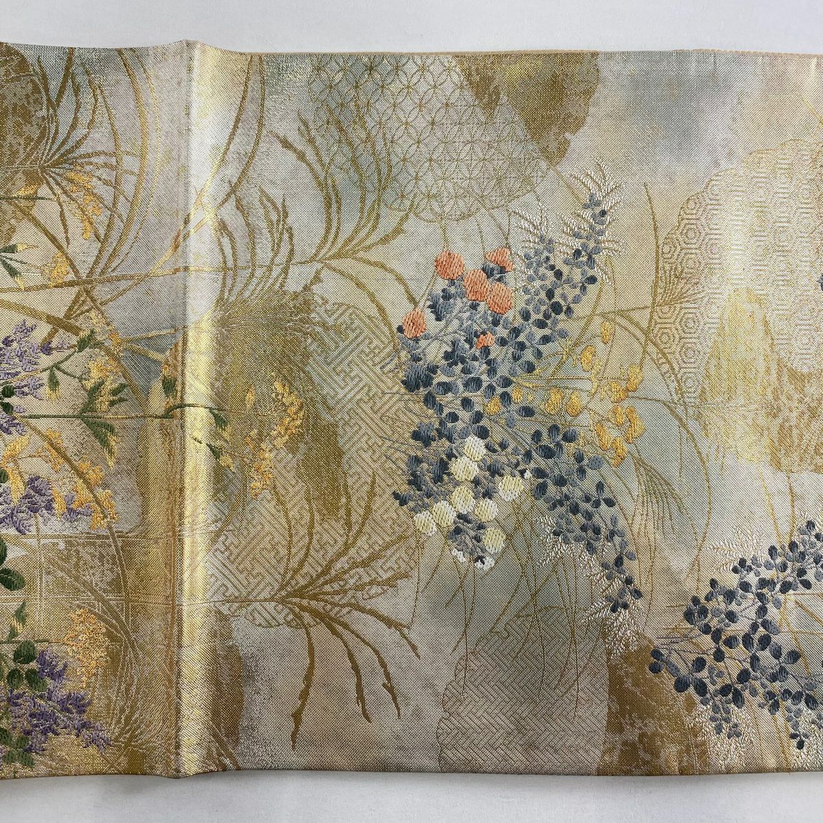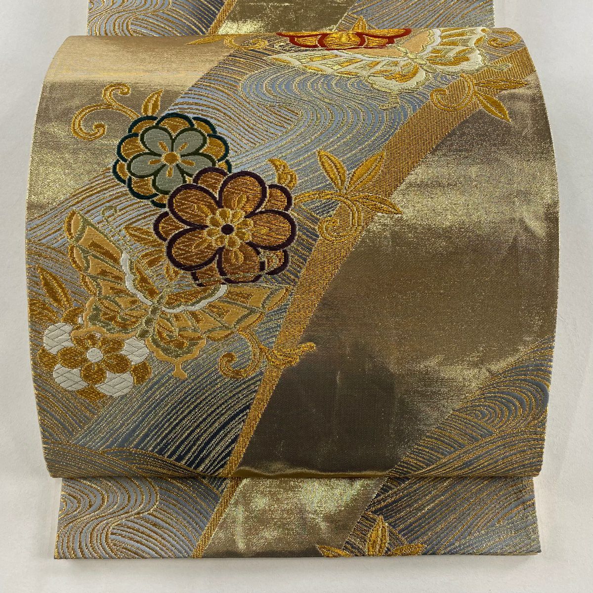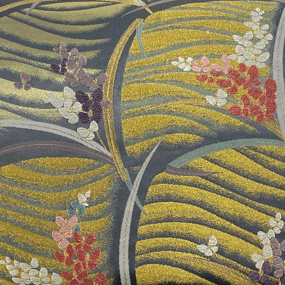 【在庫一掃】 袋帯 秀品 草花 波 金糸 箔 金色 六通 正絹