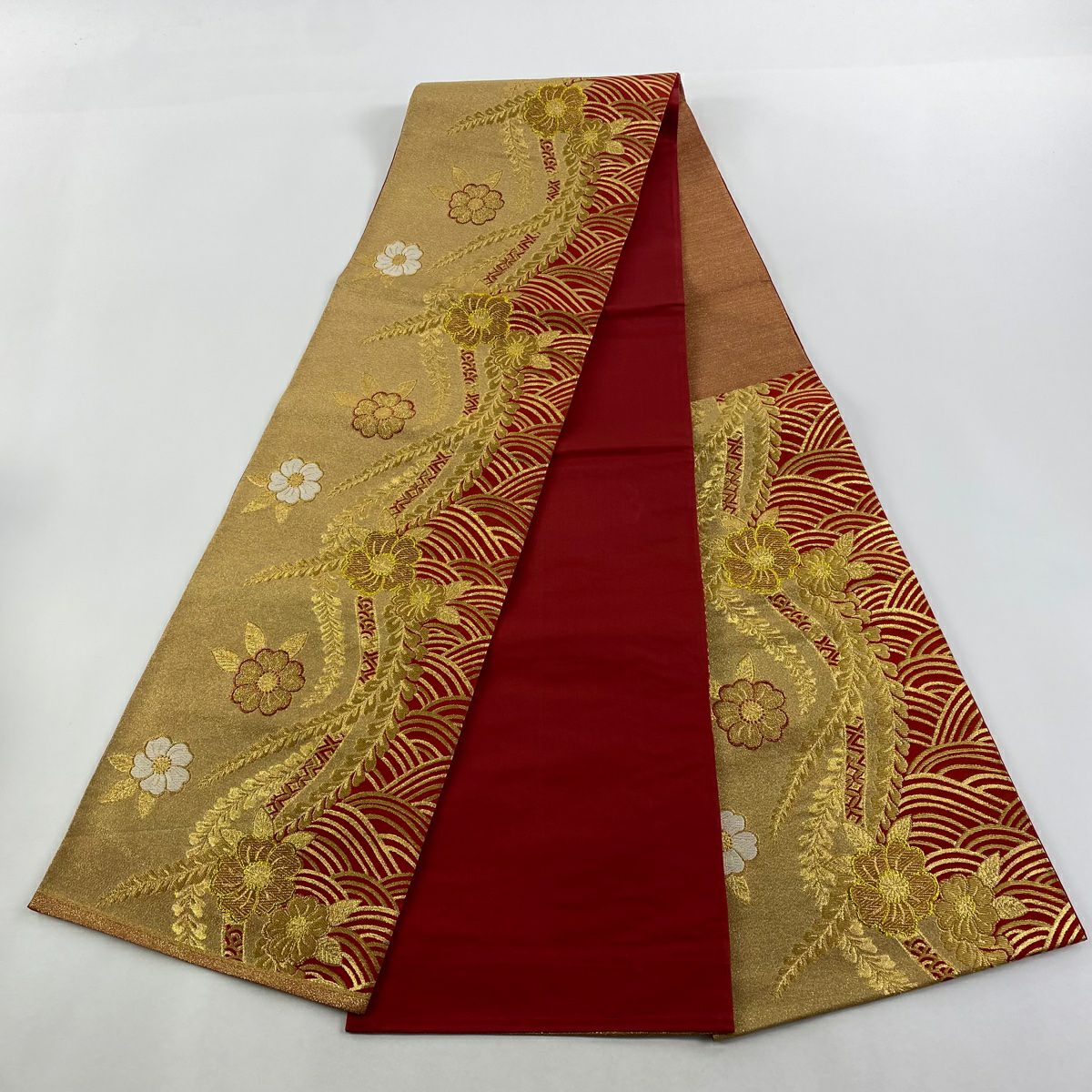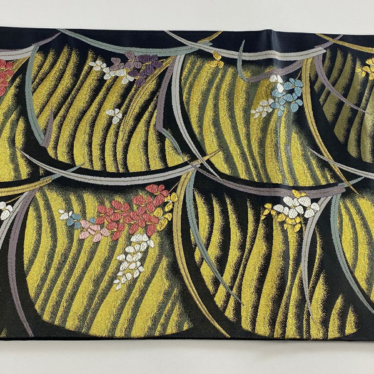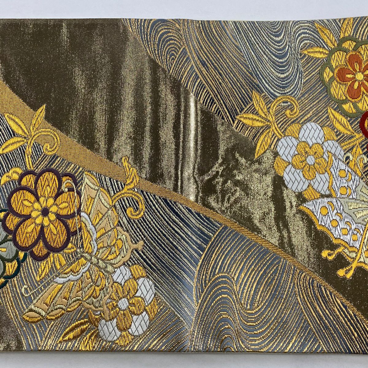 【在庫一掃】 袋帯 秀品 草花 波 金糸 箔 金色 六通 正絹