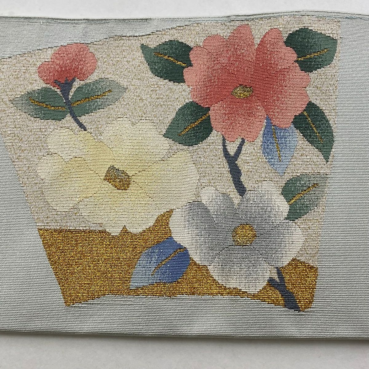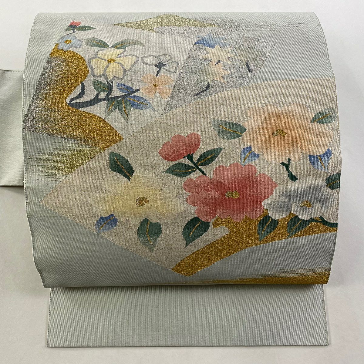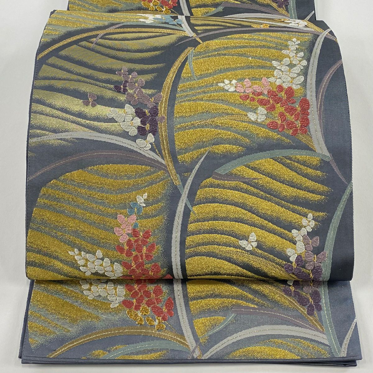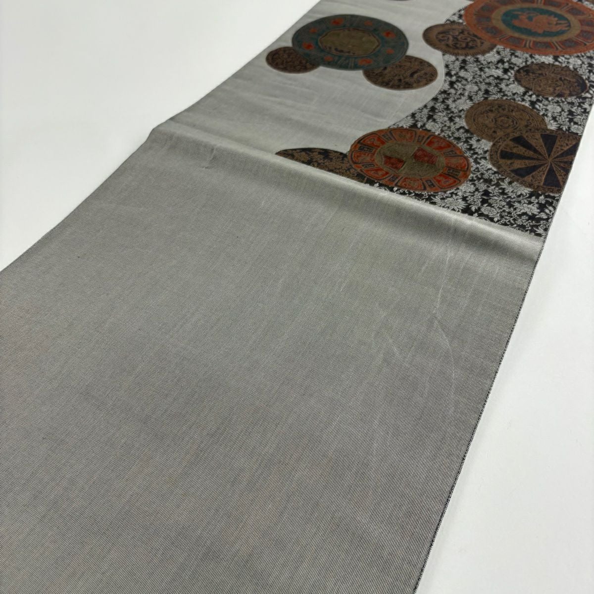 【在庫一掃】 名古屋帯 秀品 扇面 草花 金銀糸 灰色 正絹