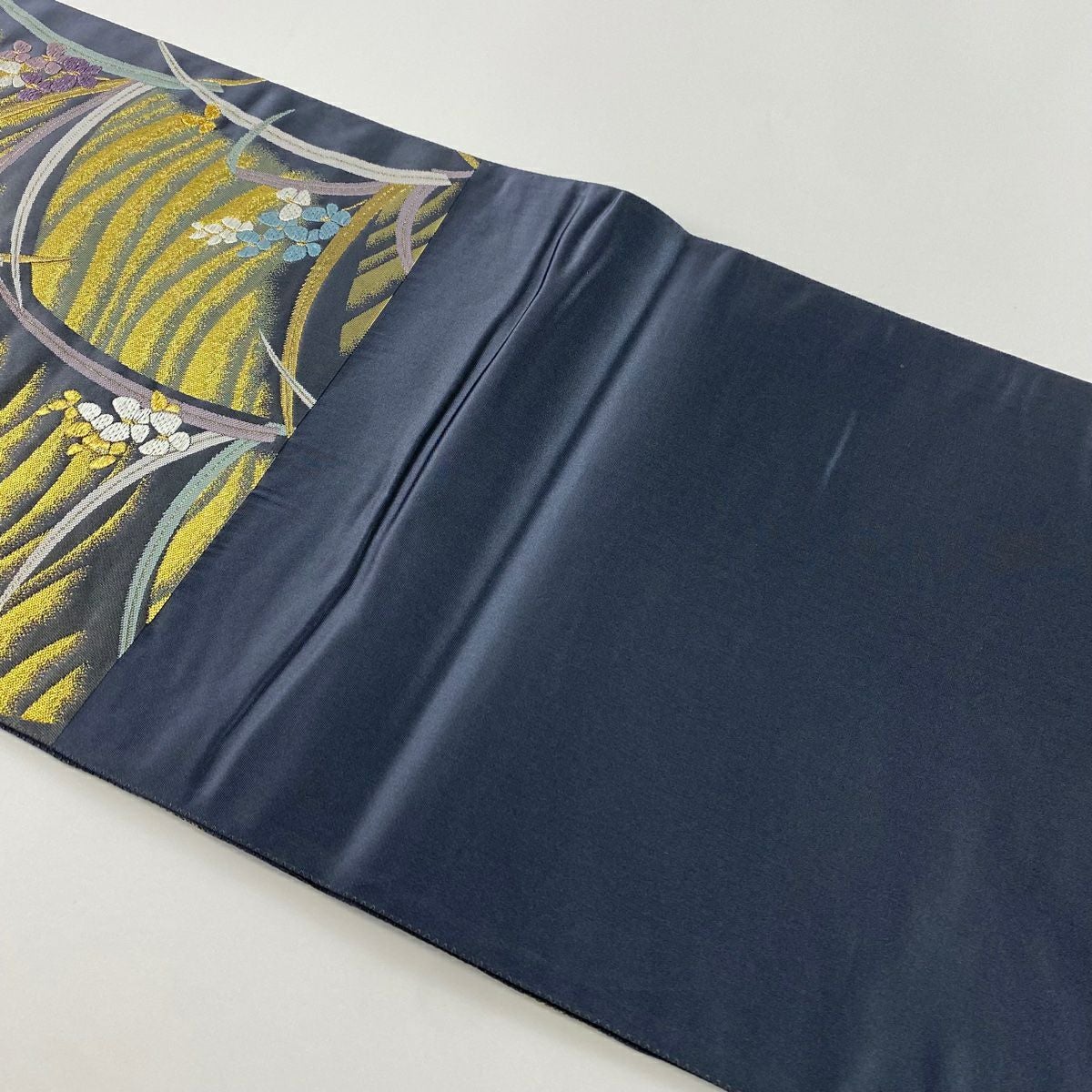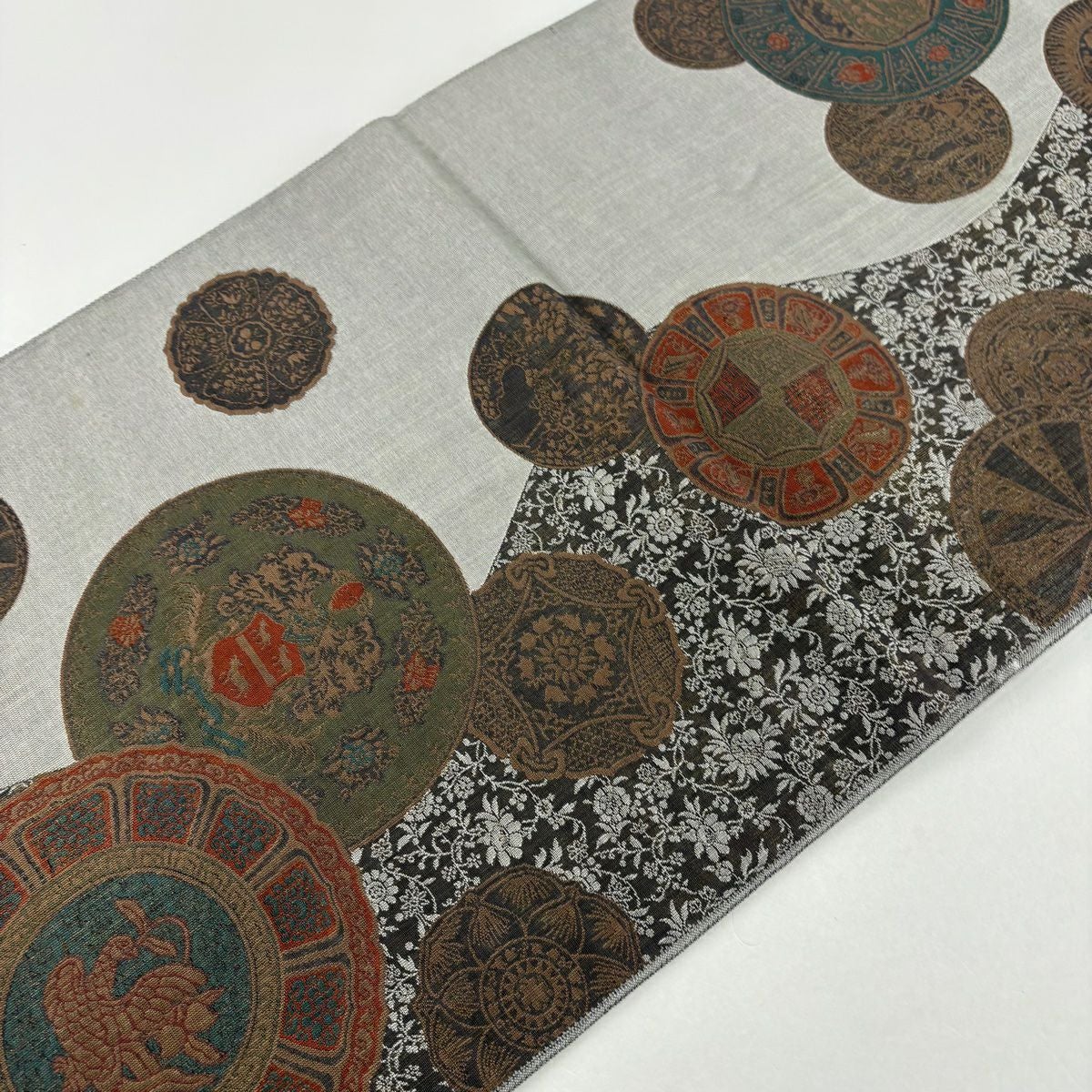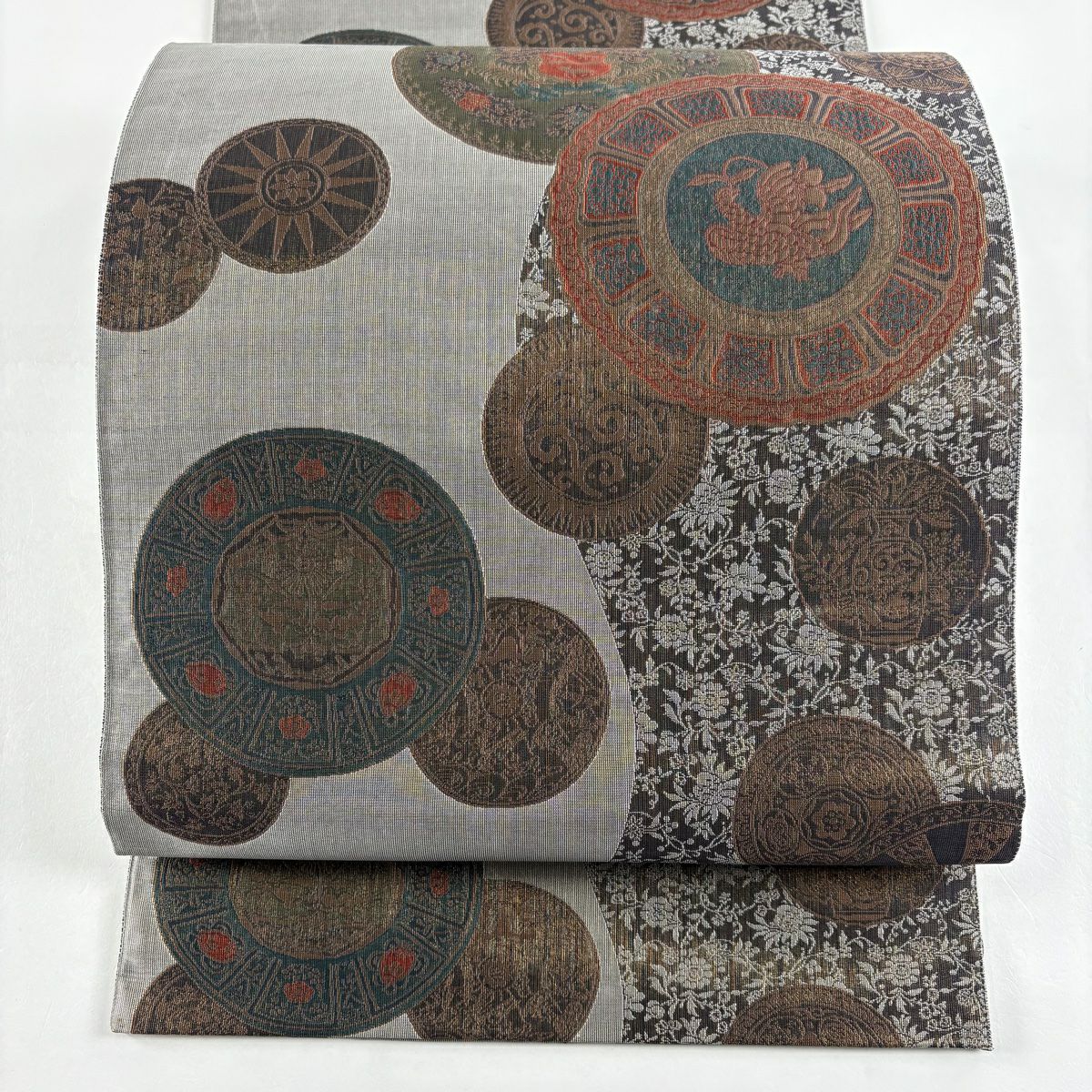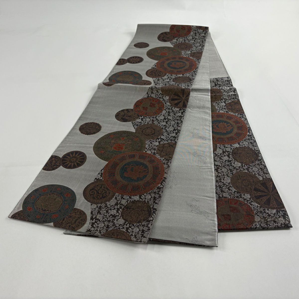 【在庫一掃】 名古屋帯 秀品 扇面 草花 金銀糸 灰色 正絹