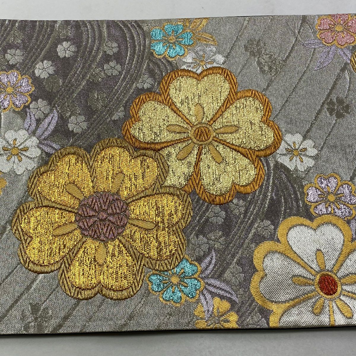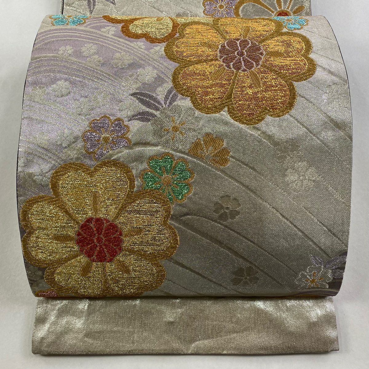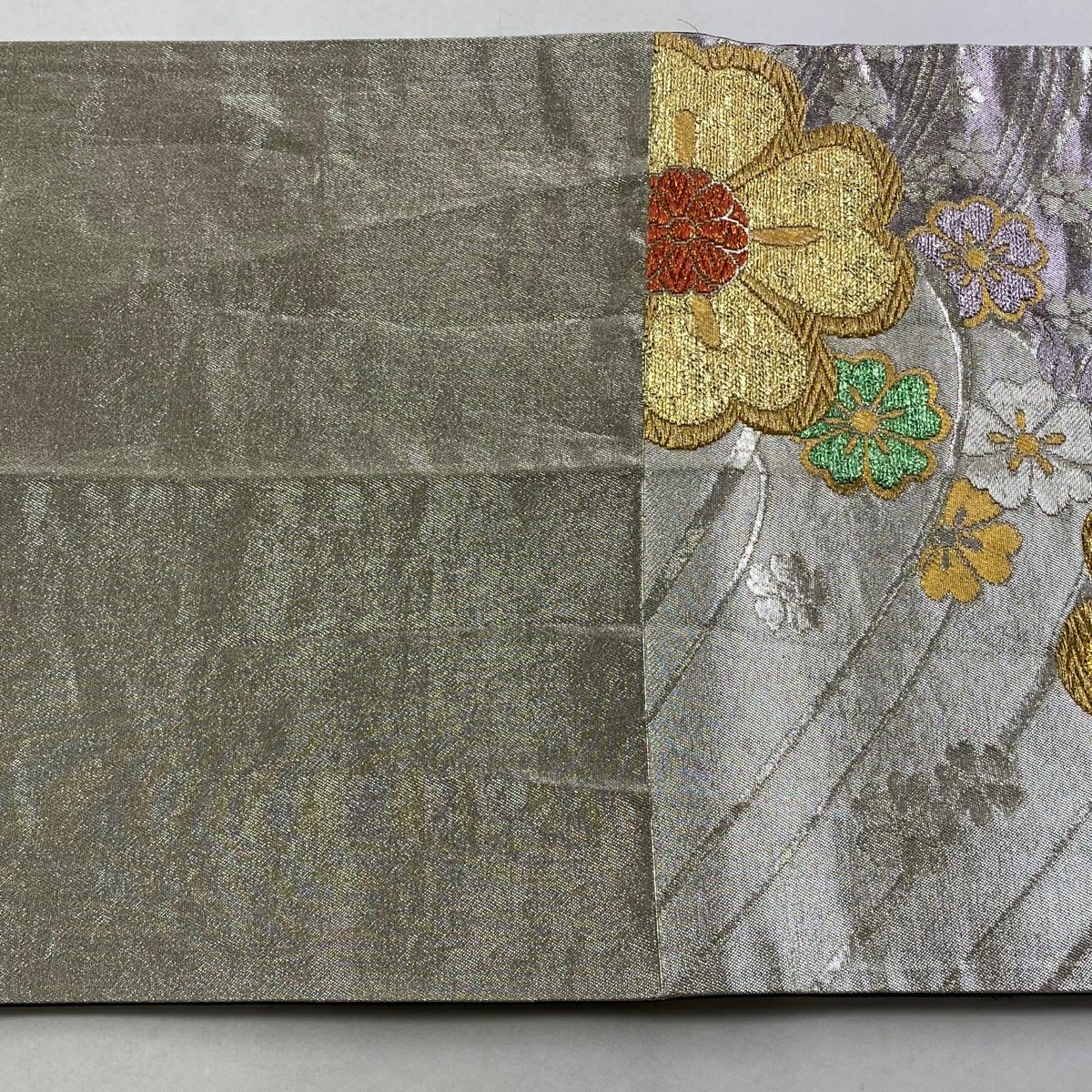 【在庫一掃】 袋帯 秀品 草花 箔 金銀糸 灰色 六通 正絹