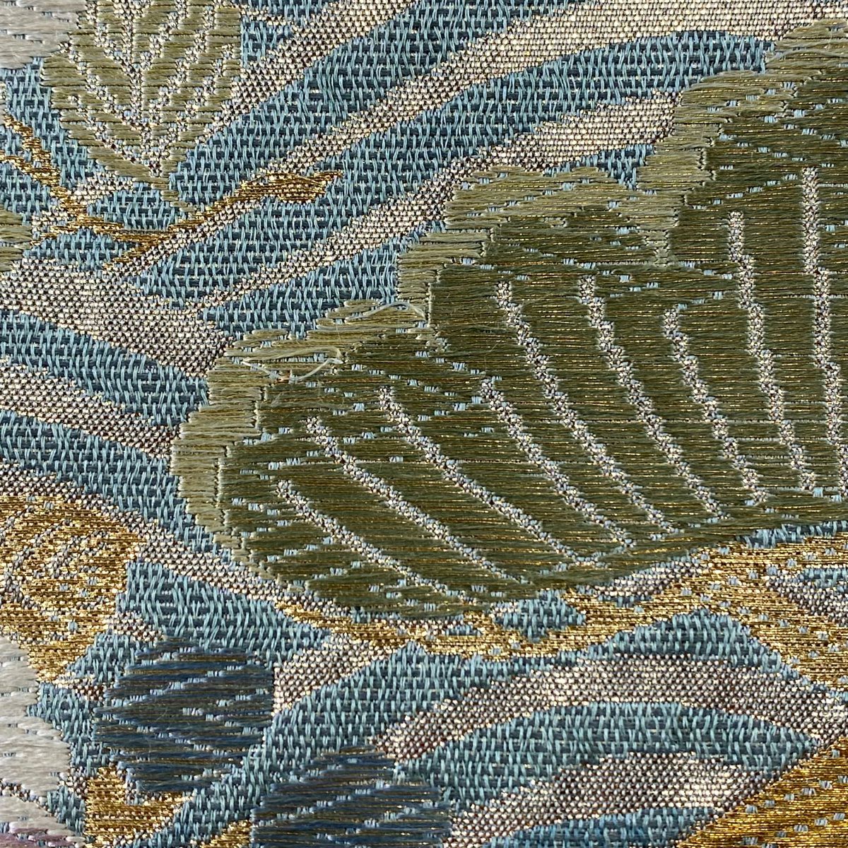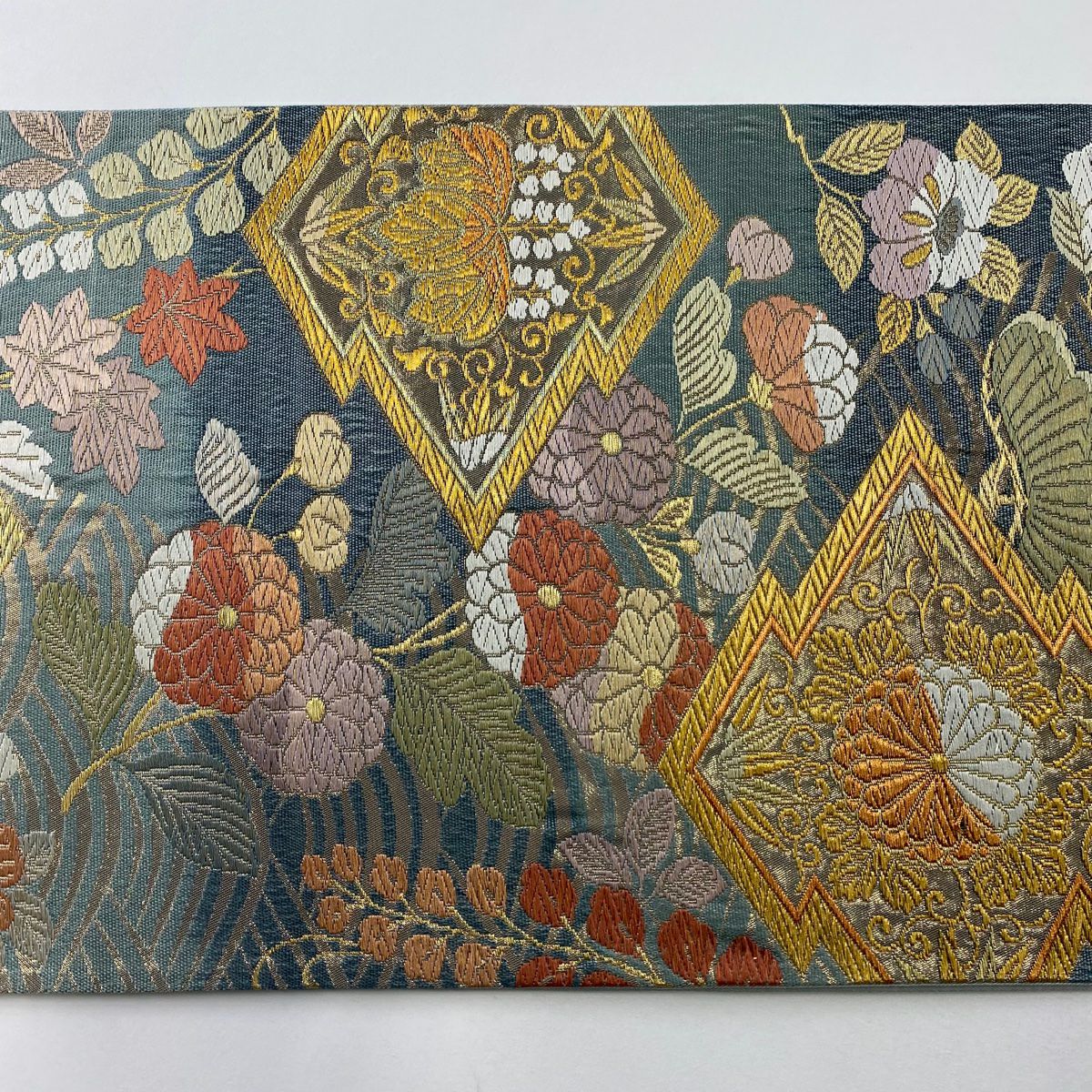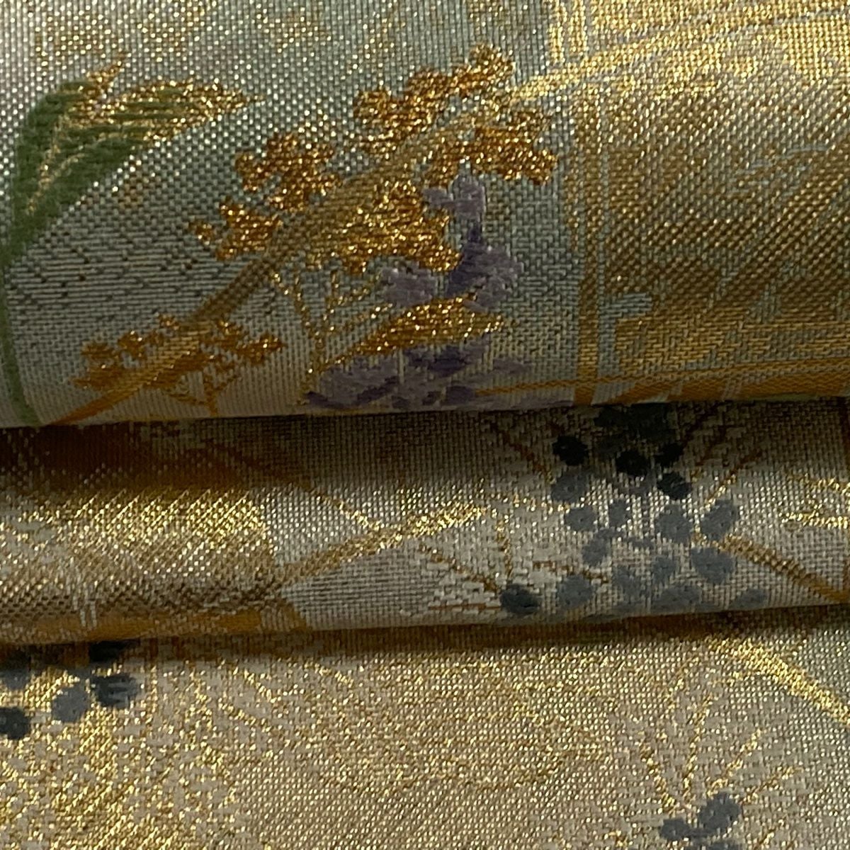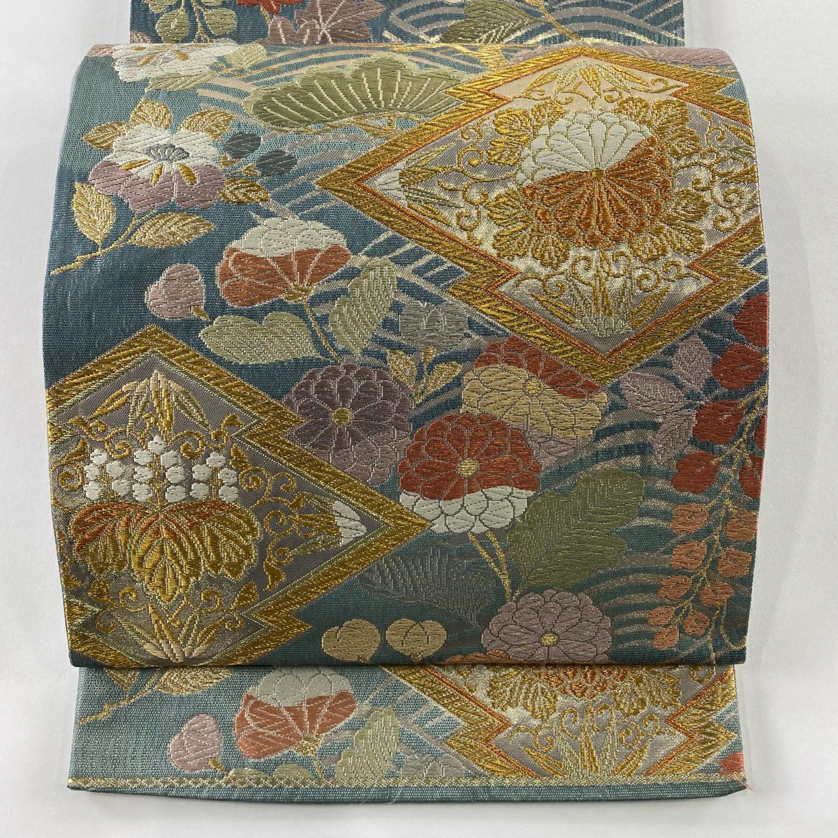【在庫一掃】 袋帯 秀品 幾何学模様 金糸 灰緑 全通 正絹