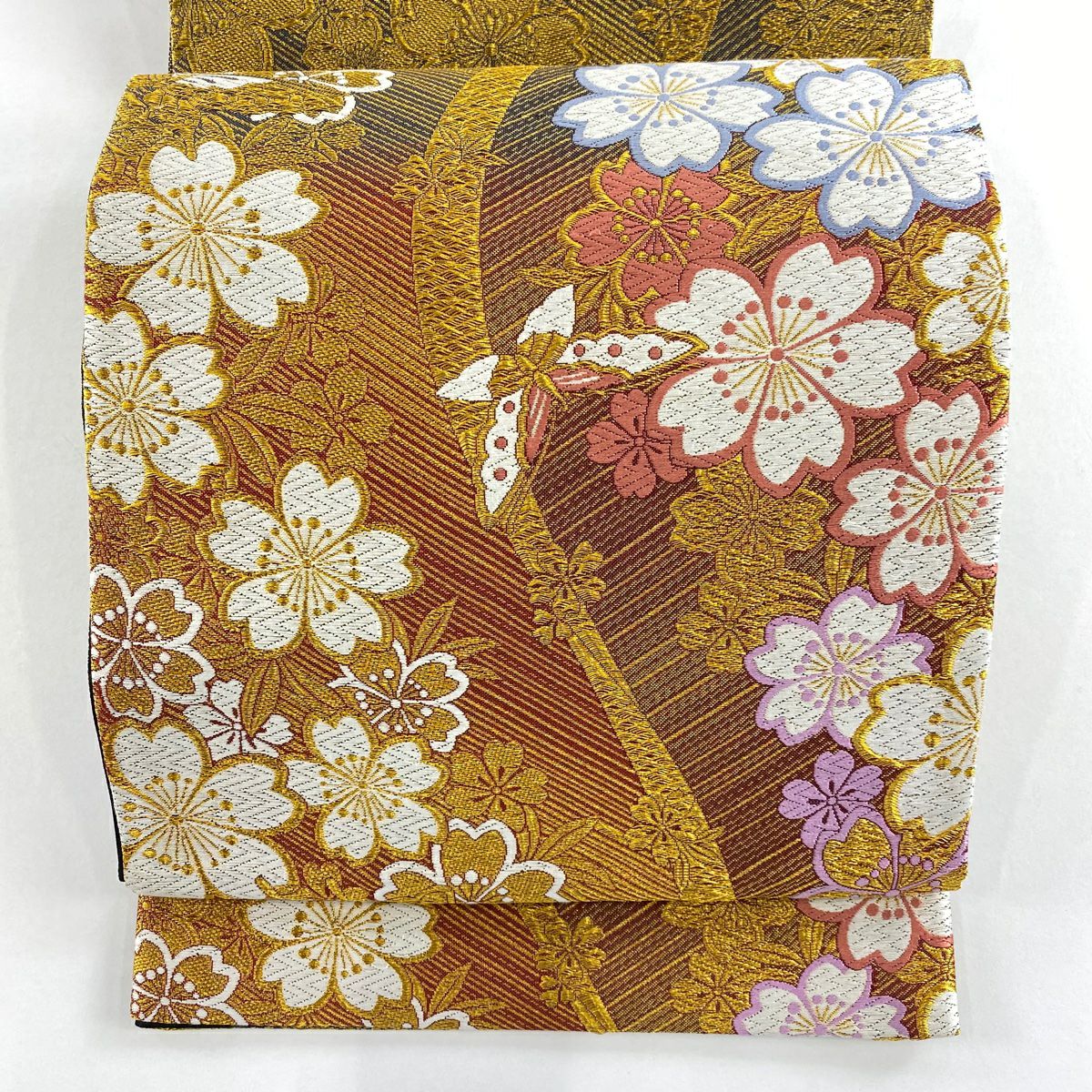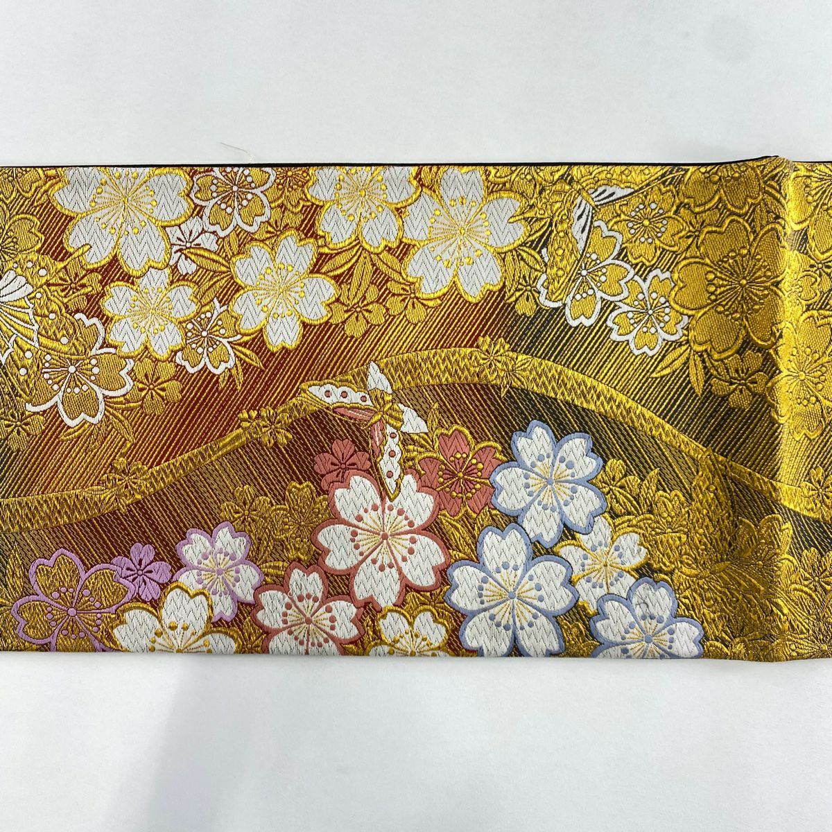 【在庫一掃】 袋帯 秀品 桜 梅 金銀糸 箔 金色 六通 正絹