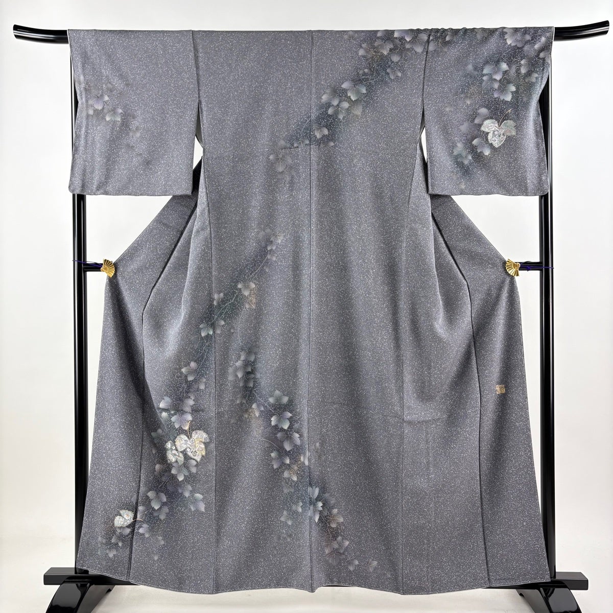 【美品】 付下げ 身丈163.5cm 裄丈64.5cm M 袷 箔屋清兵衛 紬地 落款あり 葉 草花 金糸 刺繍 灰緑 正絹 秀品