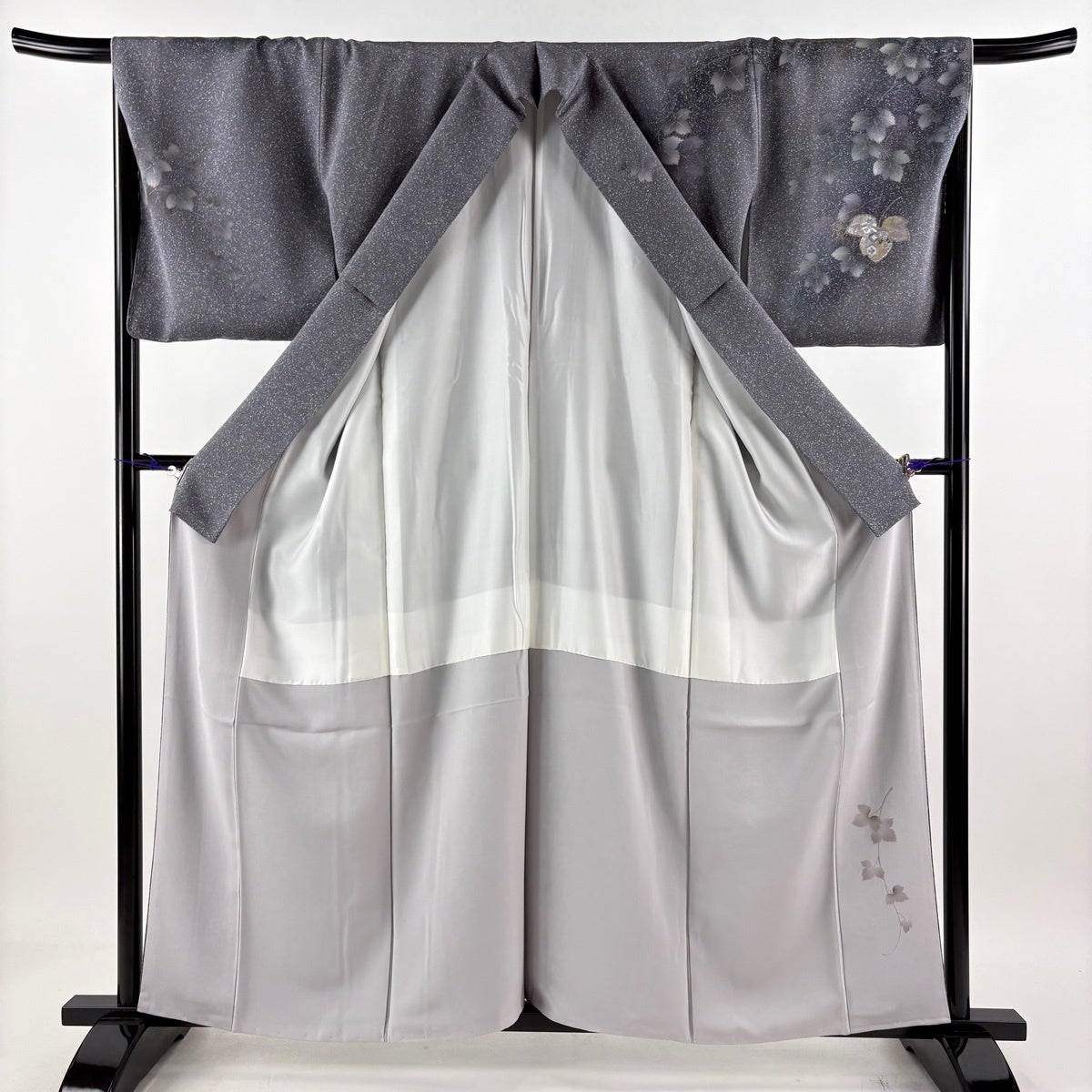 【美品】 小紋 身丈154cm 裄丈63.5cm S 袷 二代目 更甚 やまと 落款あり 草花 有職文様 縮緬 灰色 正絹 秀品
