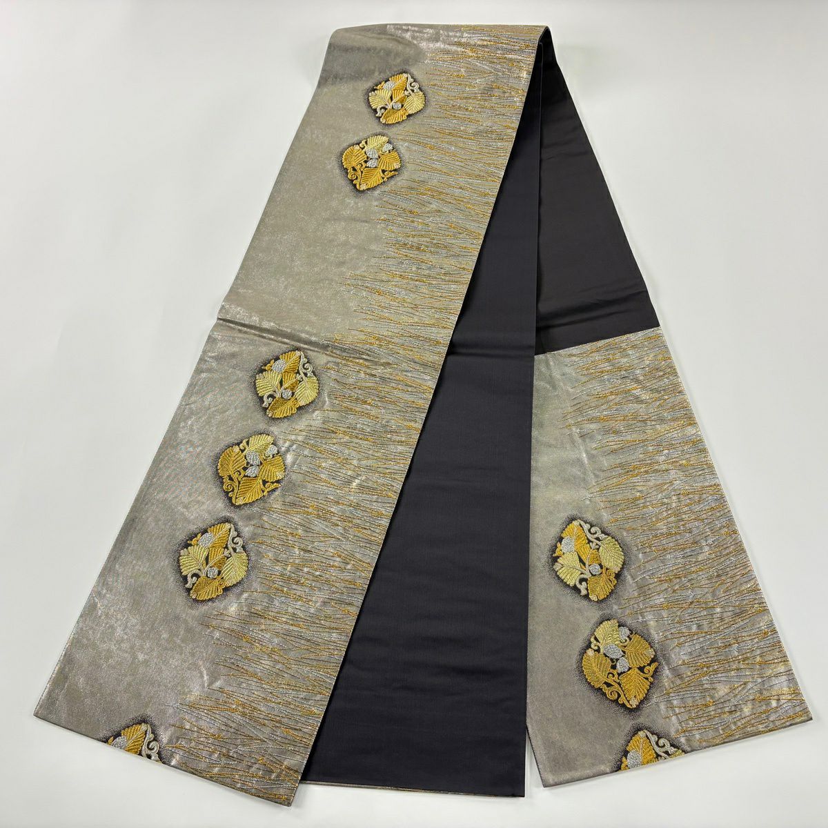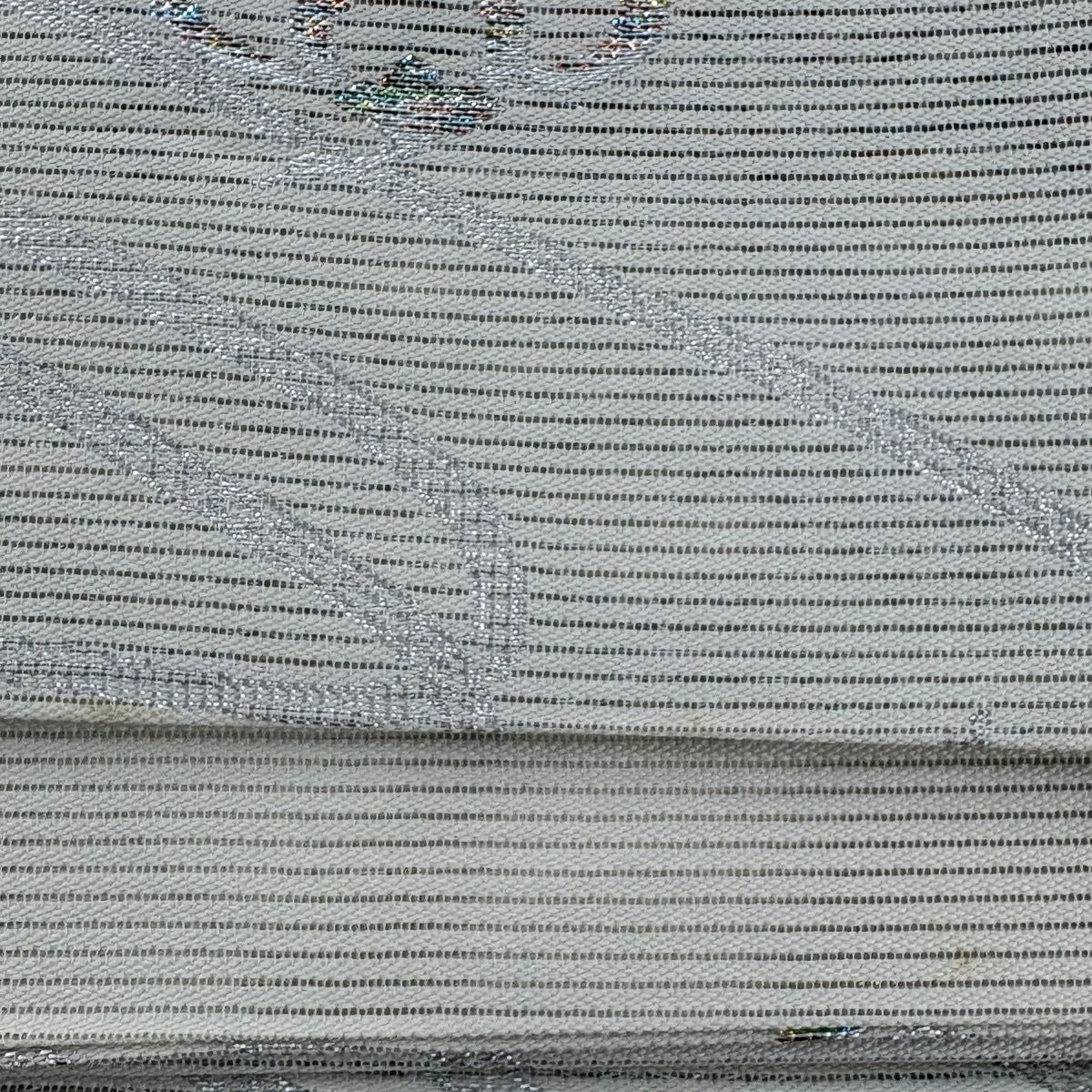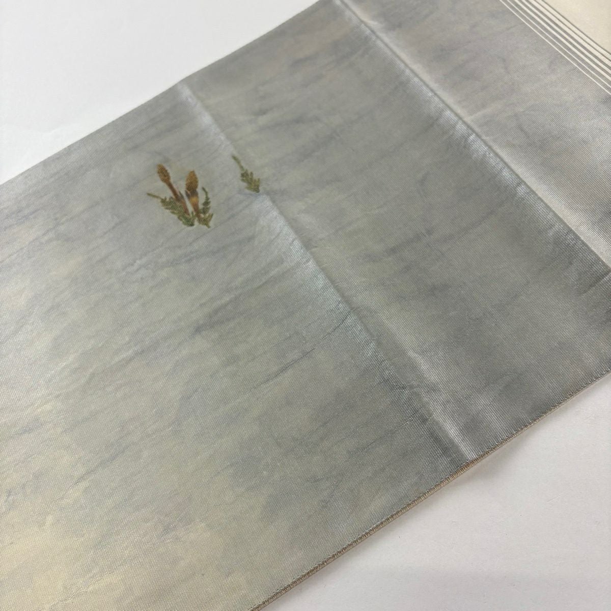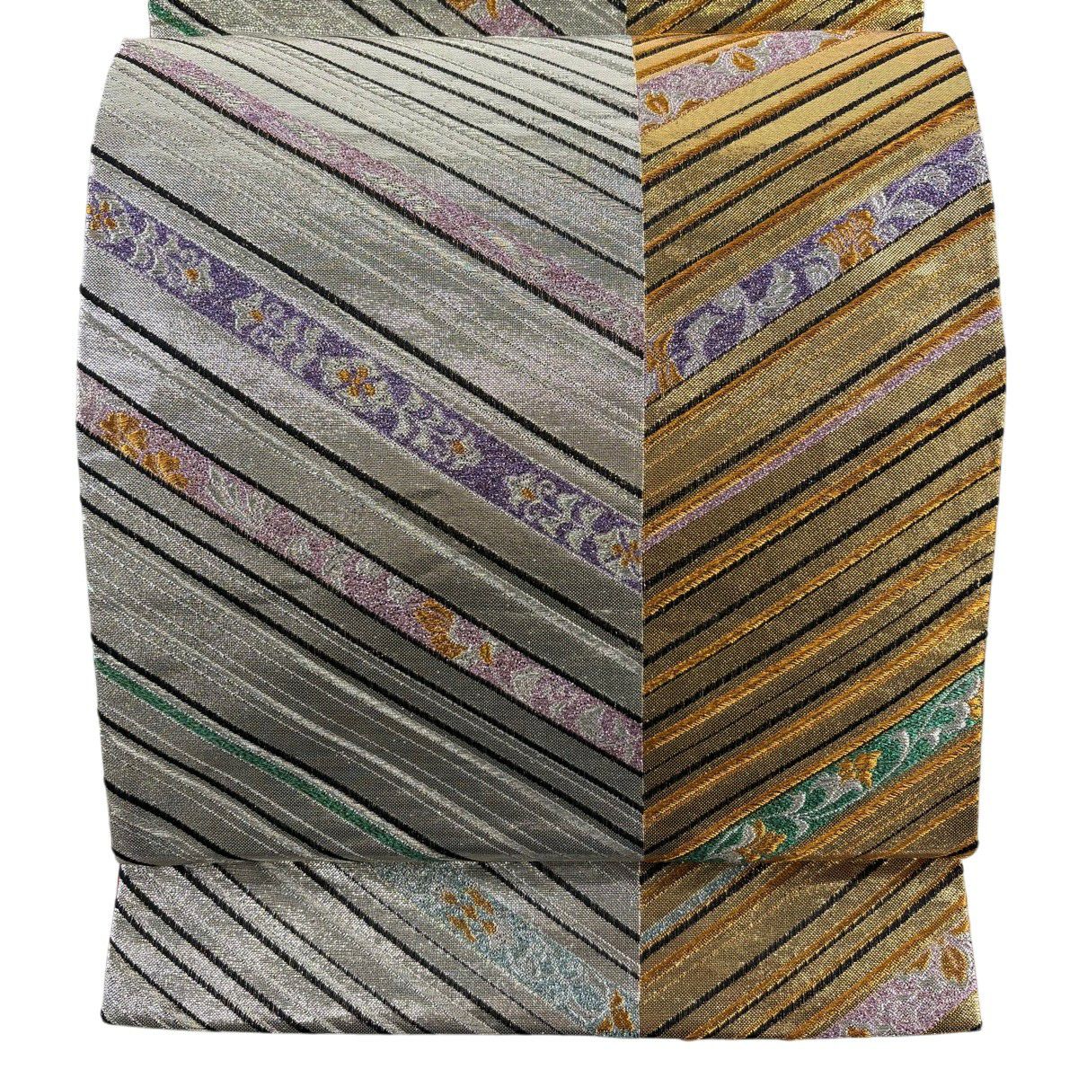 【美品】 袋帯 秀品 斜縞 草花 箔 金銀糸 銀色 六通 正絹