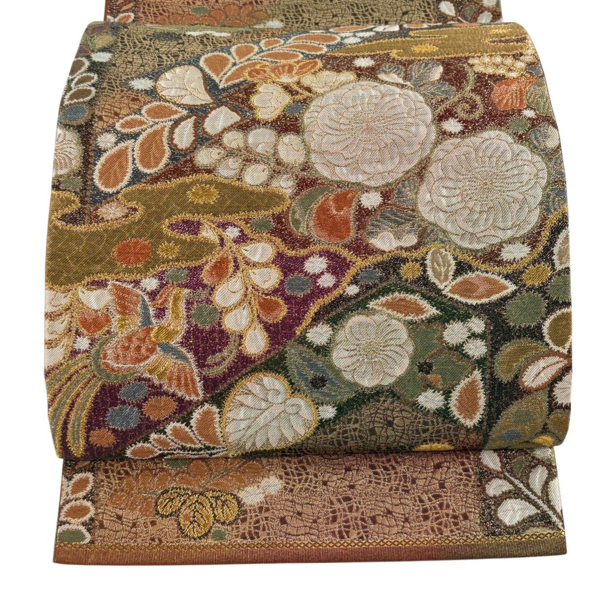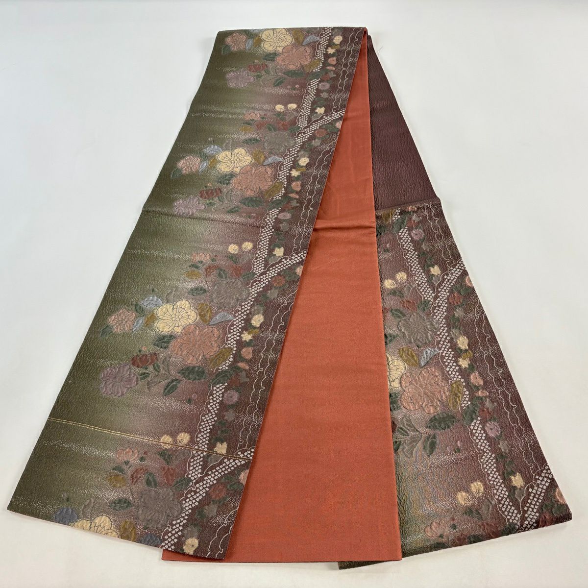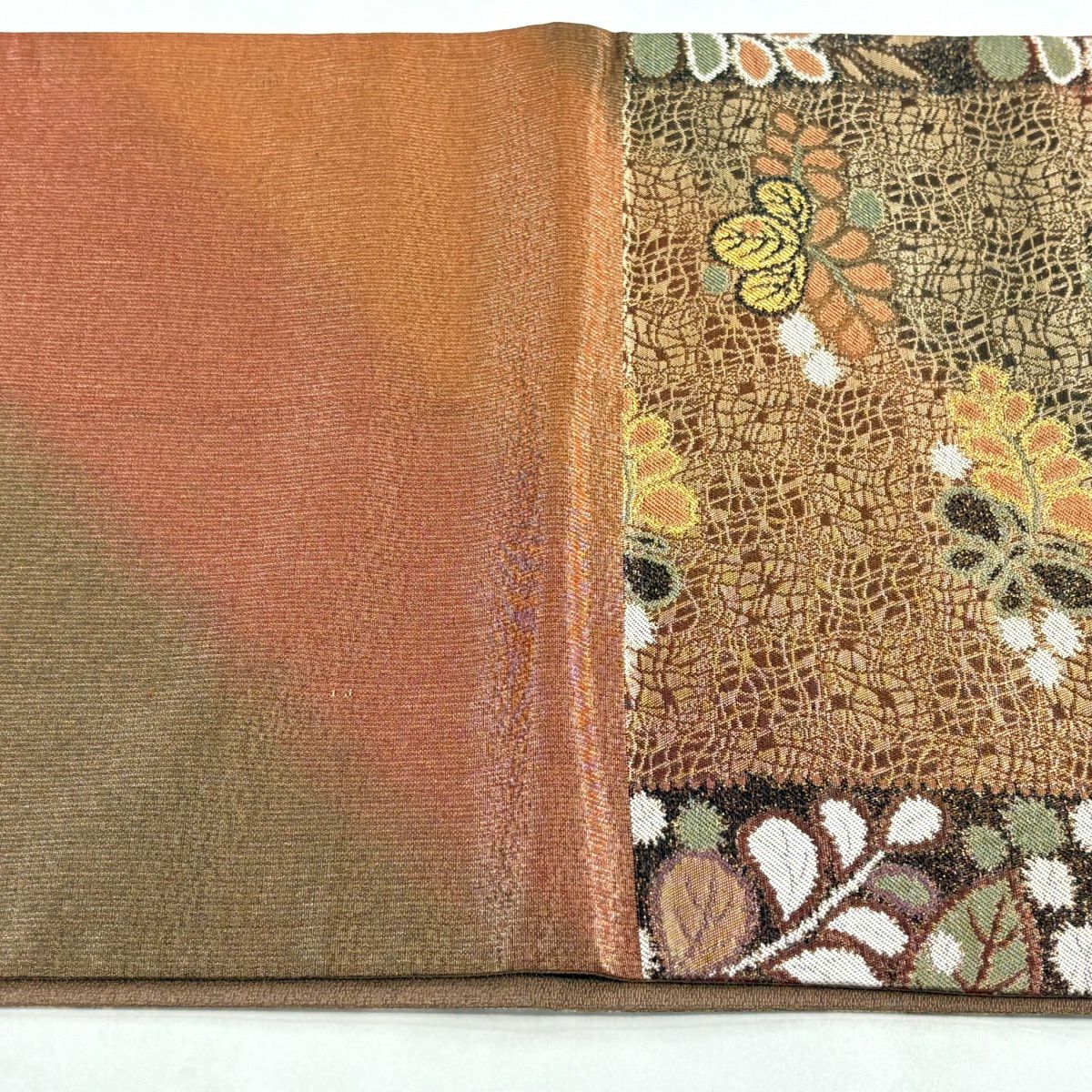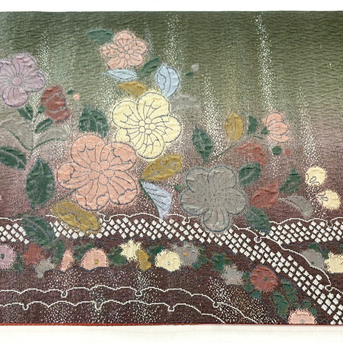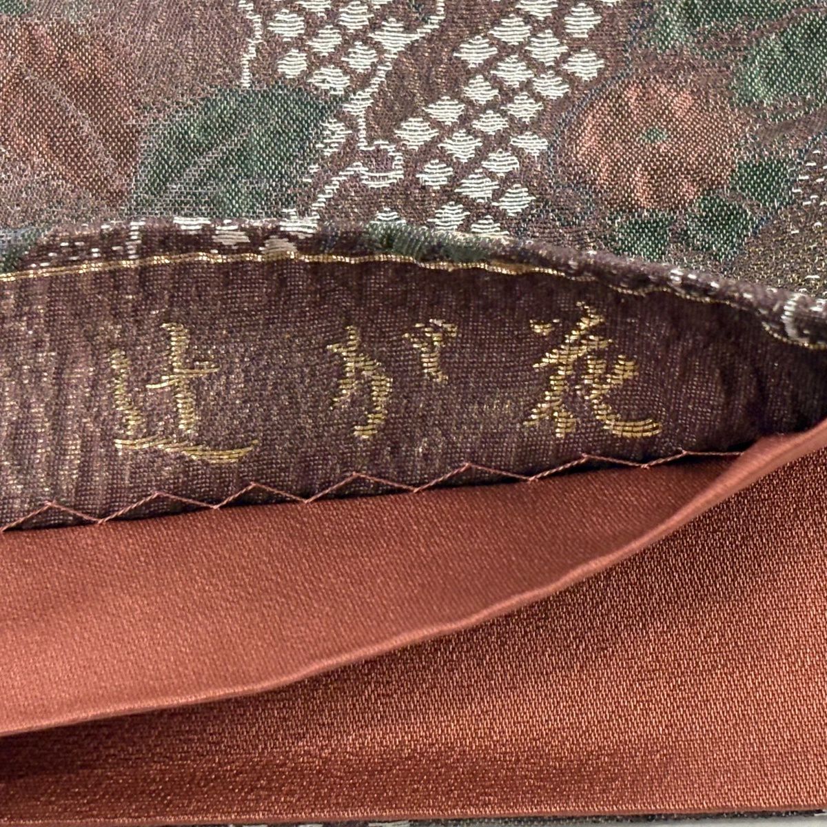 【美品】 袋帯 秀品 草花 幾何学 ぼかし 茶緑色 全通 正絹