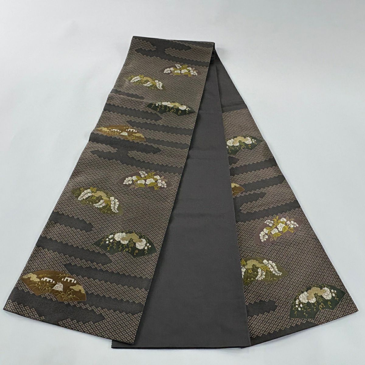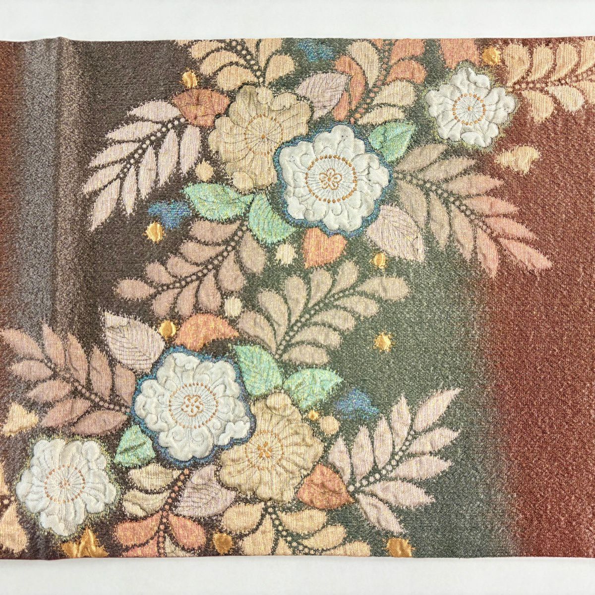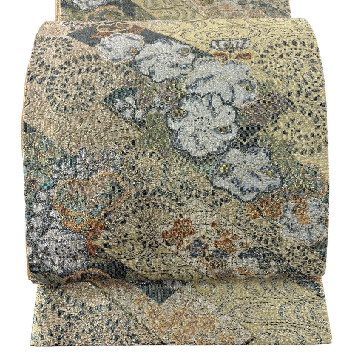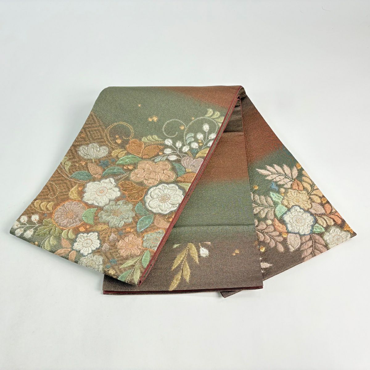 【美品】 袋帯 秀品 草花 幾何学 ぼかし 茶緑色 全通 正絹