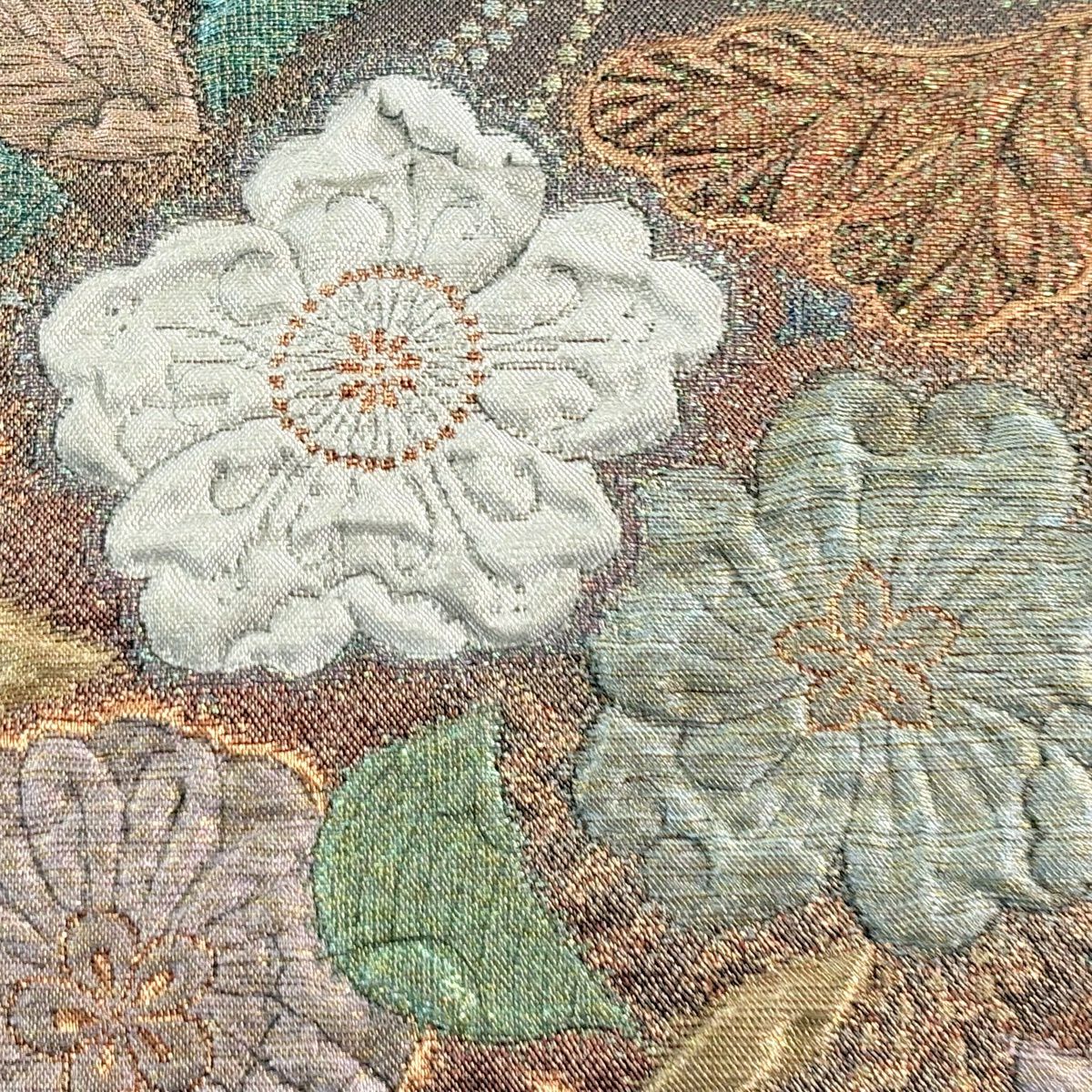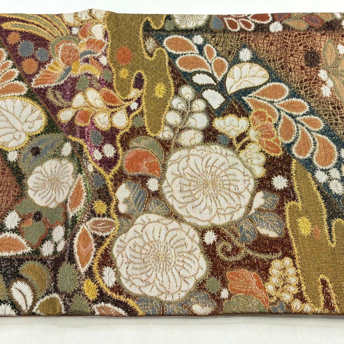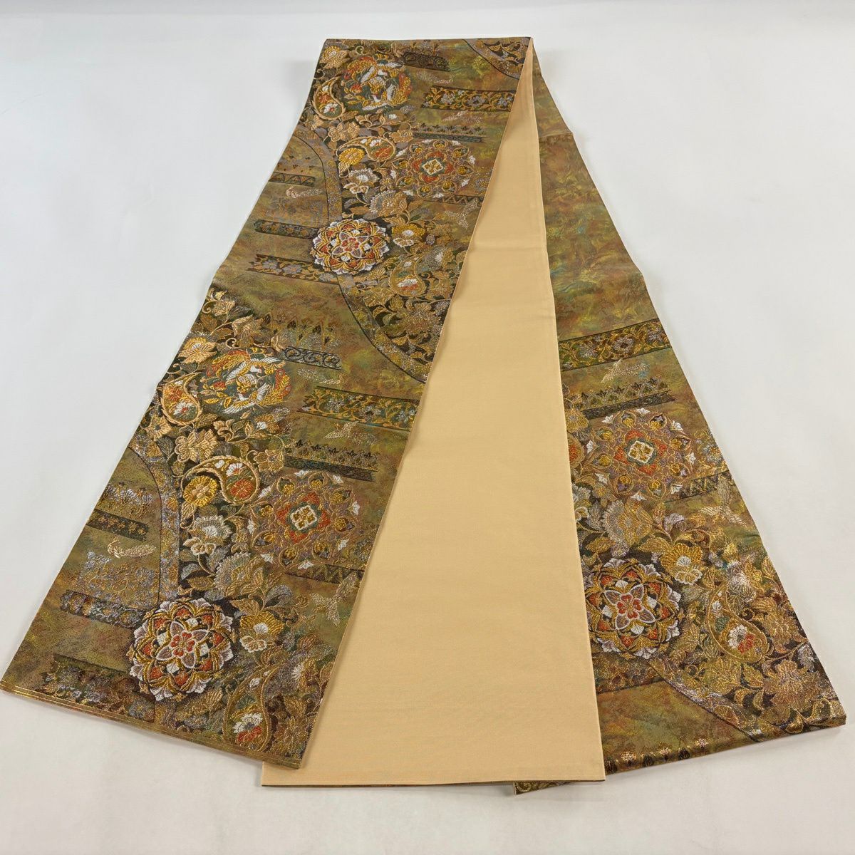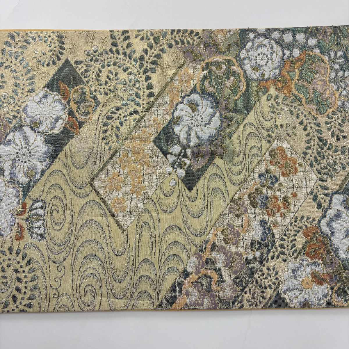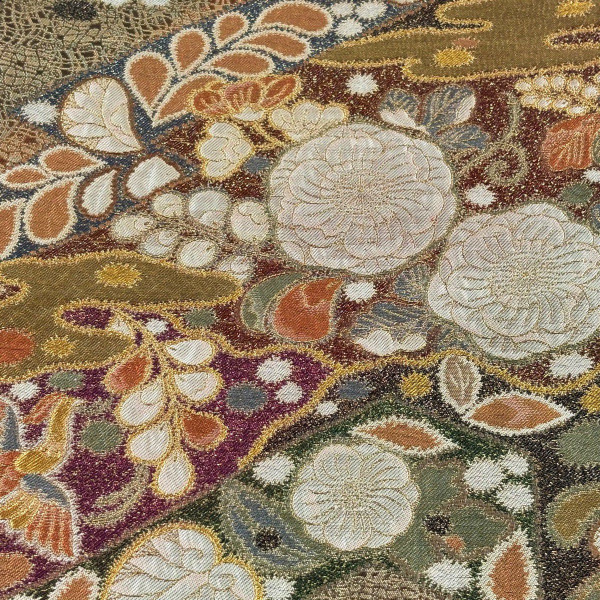 【美品】 袋帯 秀品 草花 幾何学 ぼかし 茶緑色 全通 正絹
