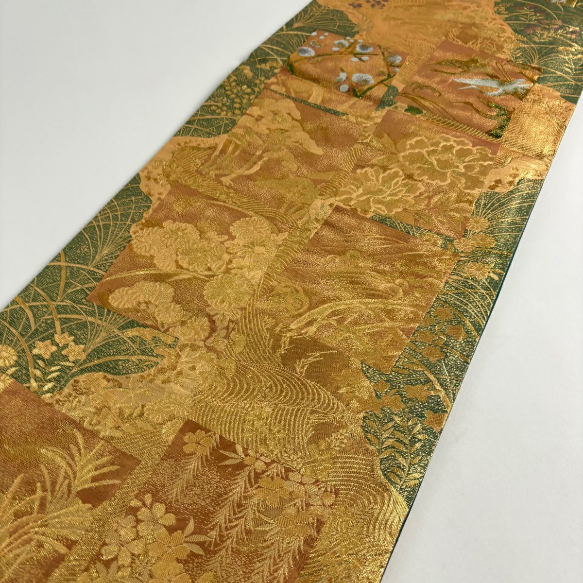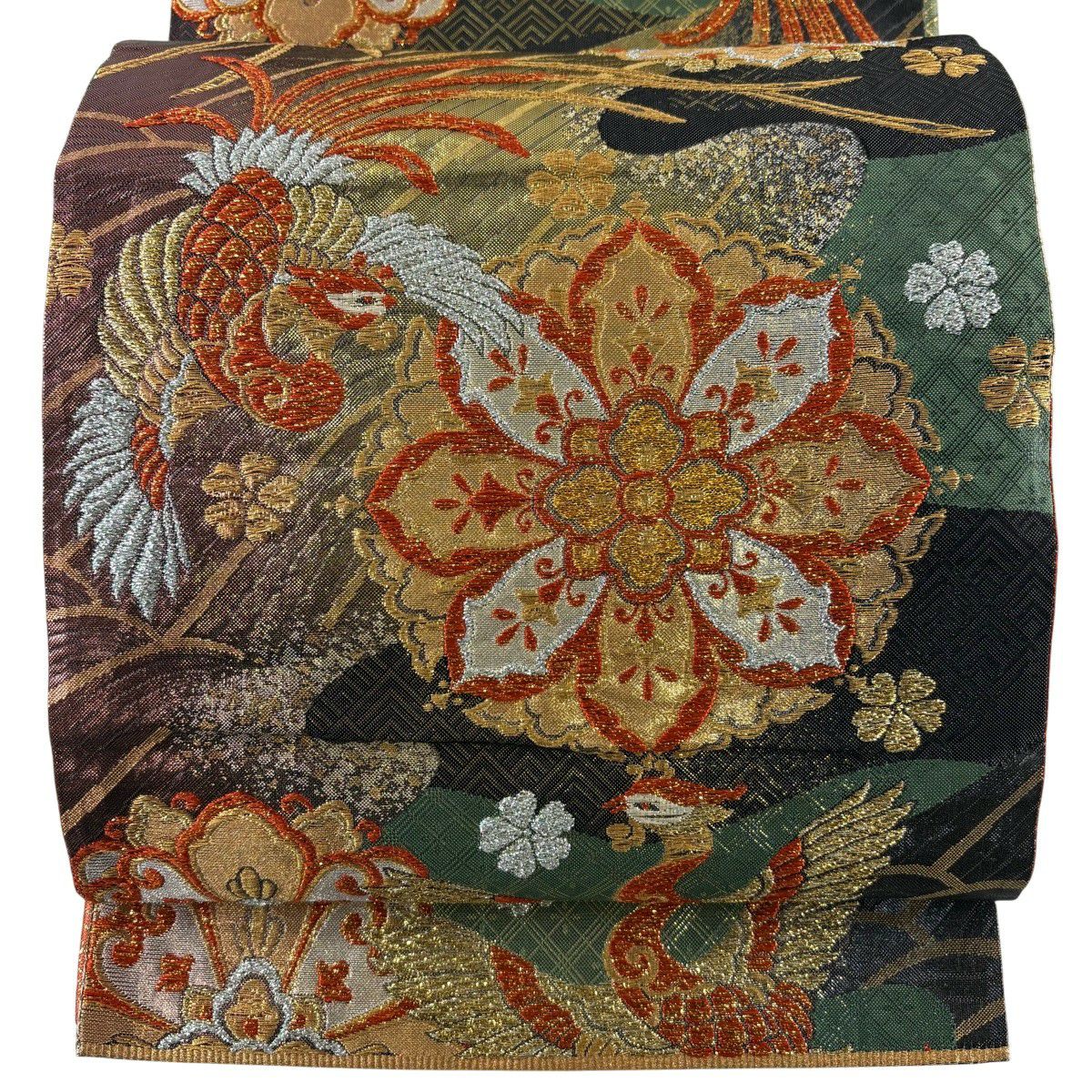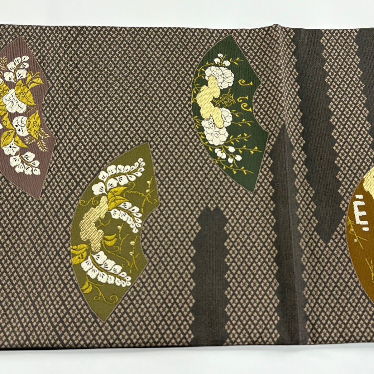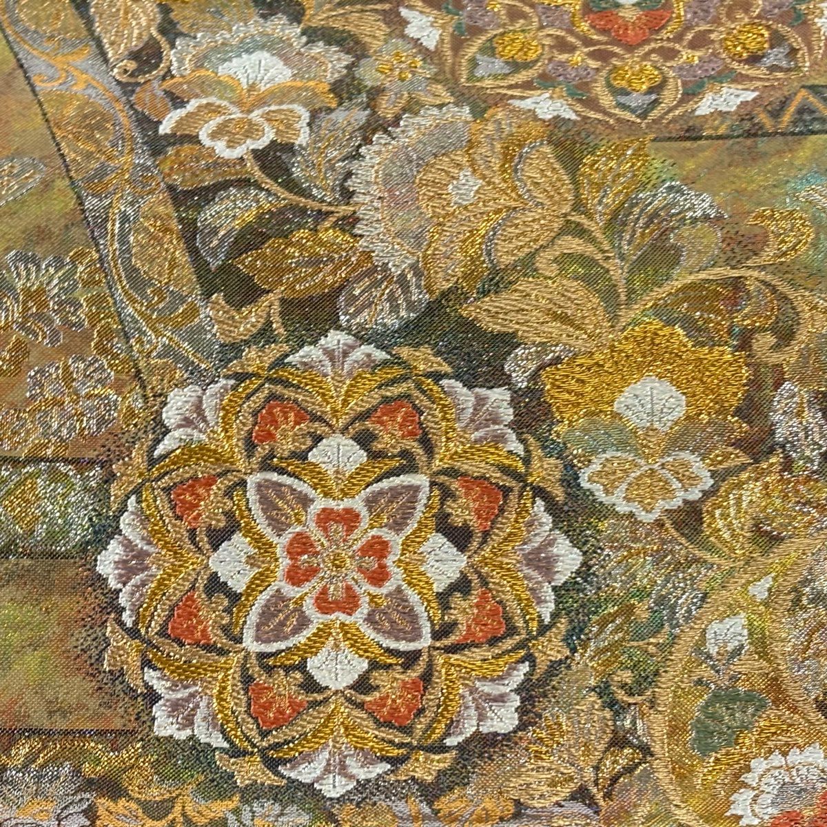 【美品】 袋帯 秀品 草花 幾何学 ぼかし 茶緑色 全通 正絹