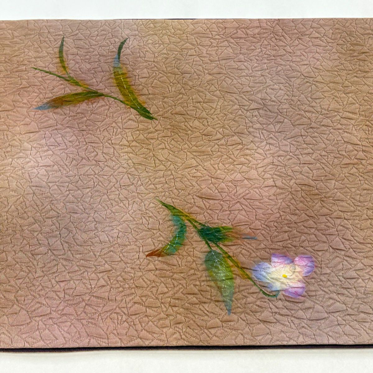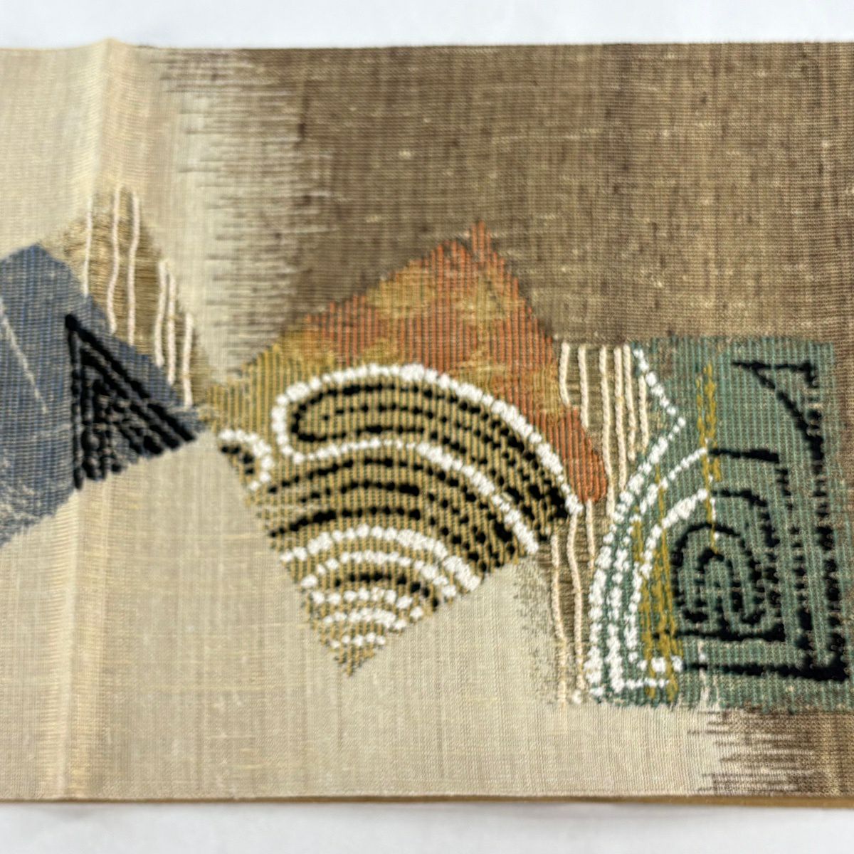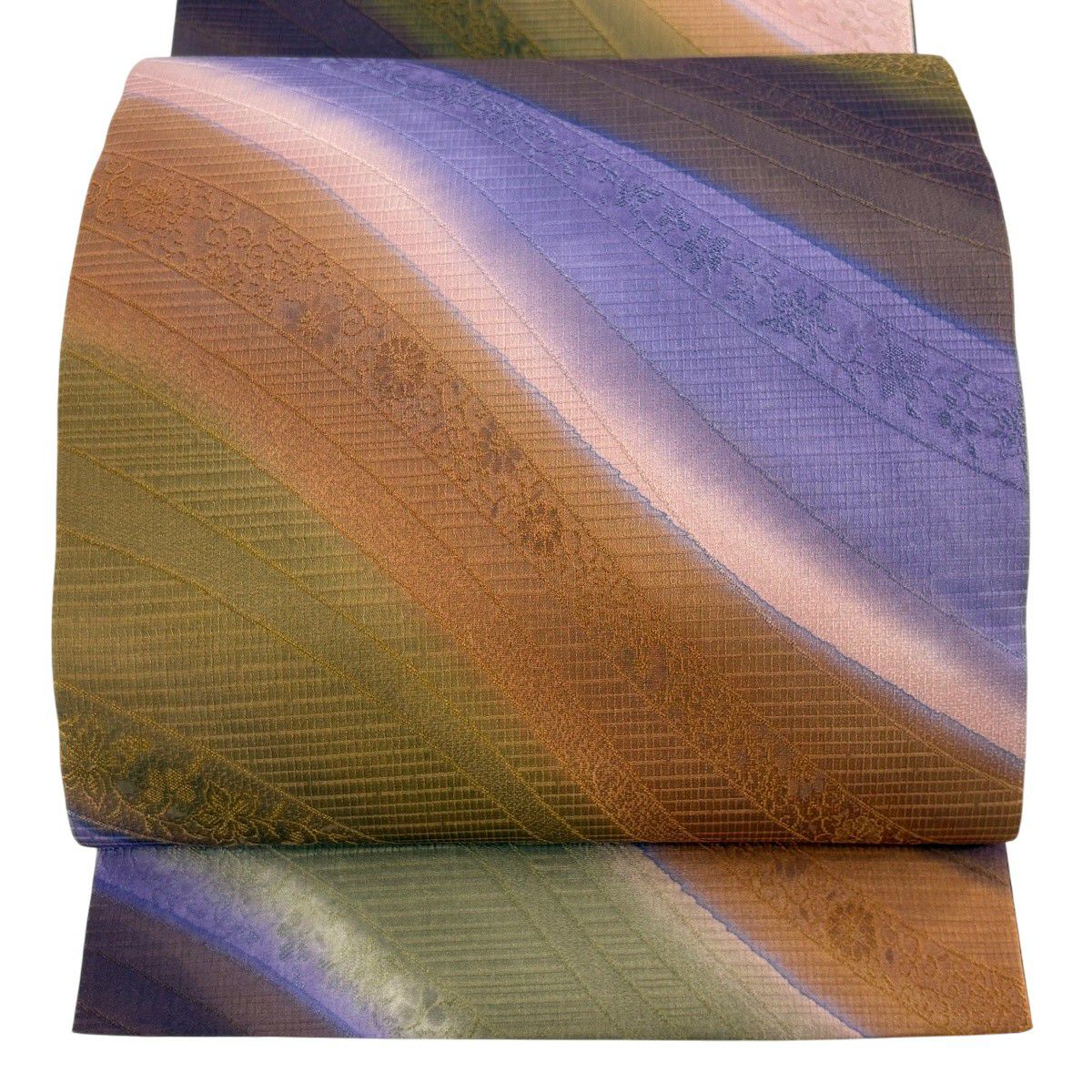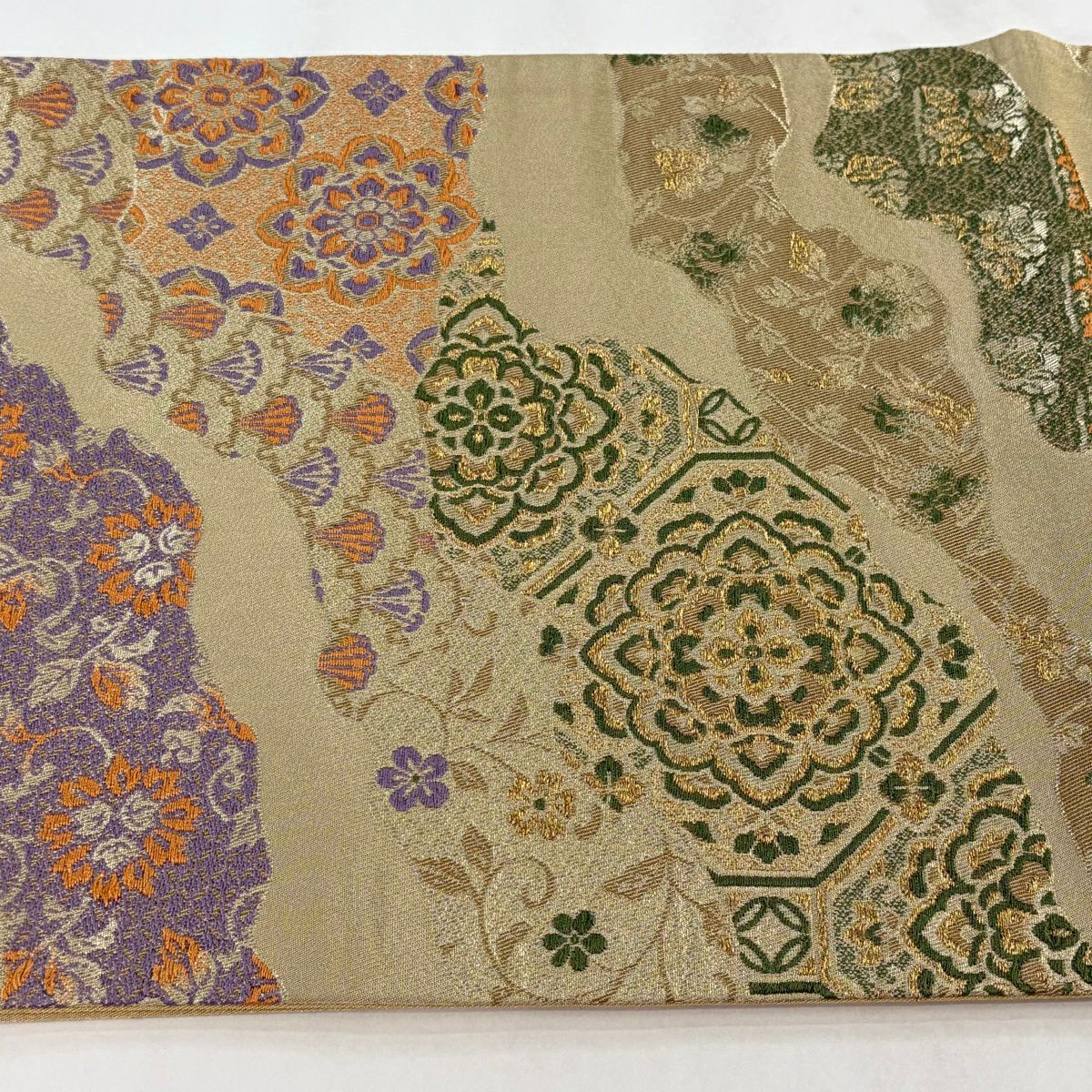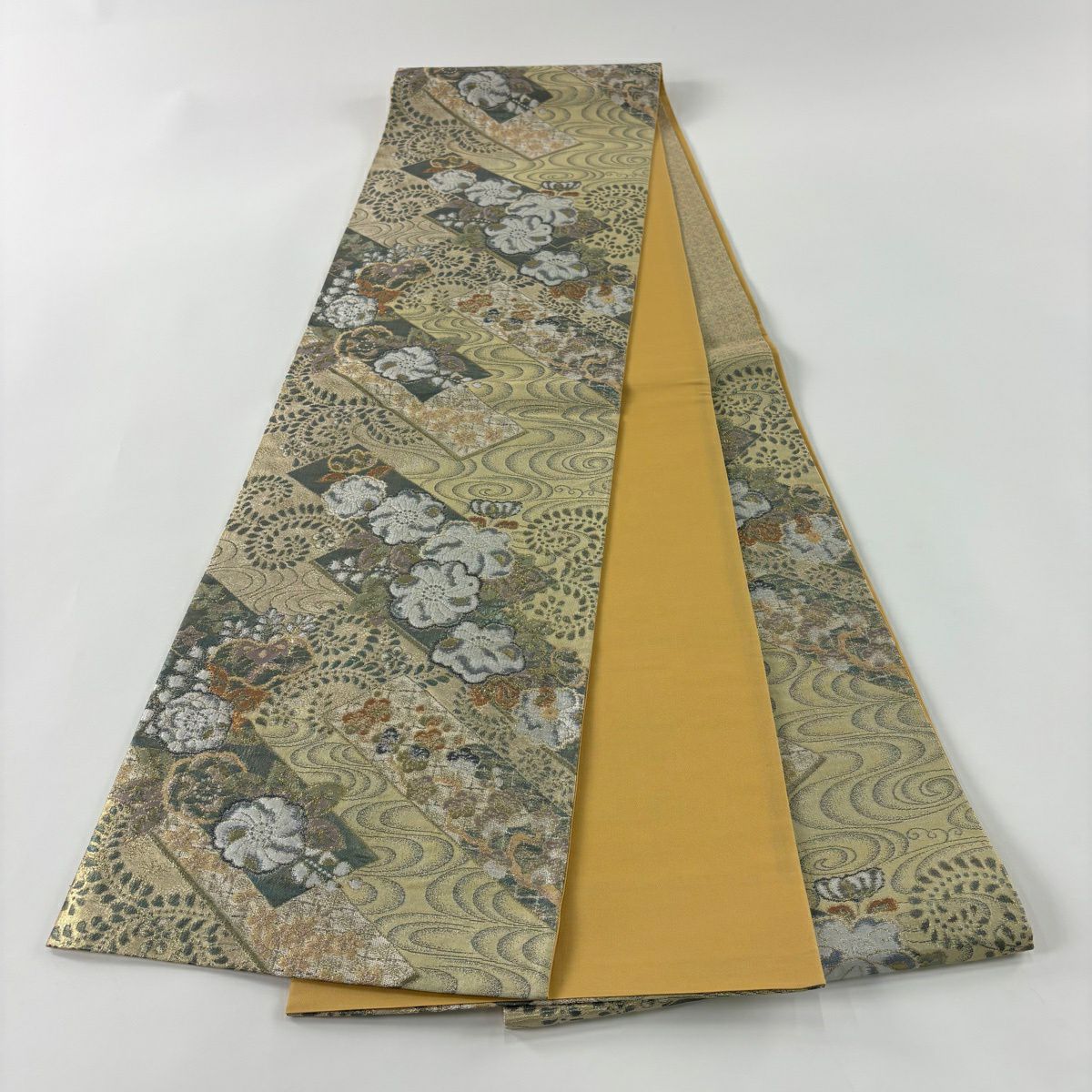 【美品】 袋帯 秀品 草花 幾何学 ぼかし 茶緑色 全通 正絹