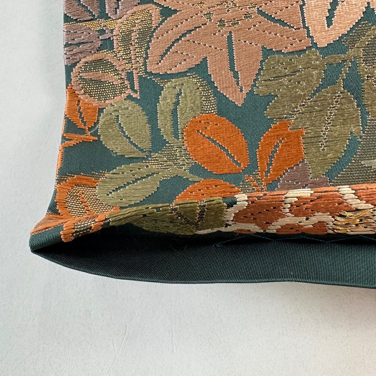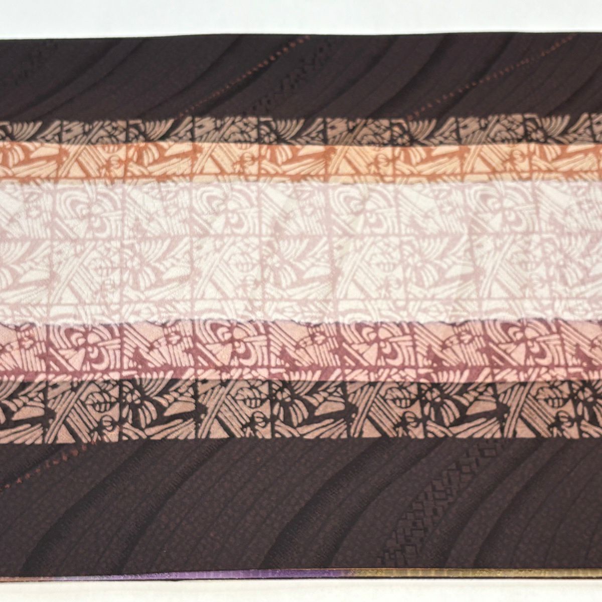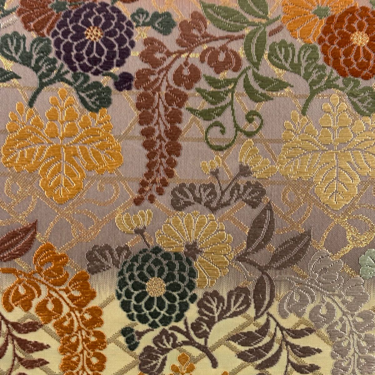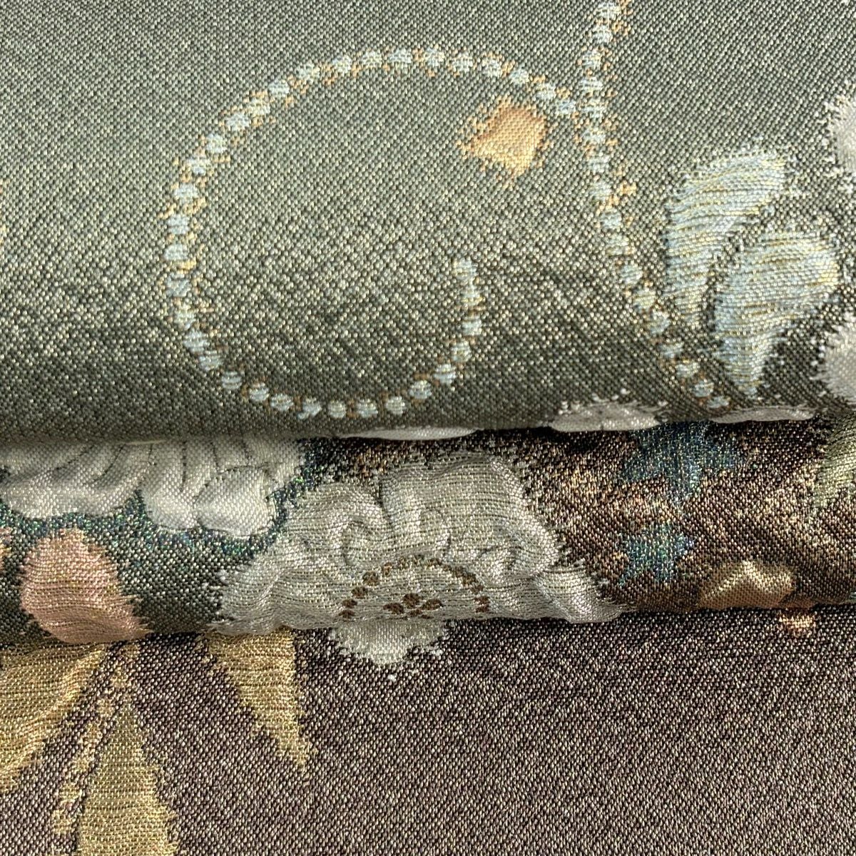 【美品】 袋帯 秀品 草花 幾何学 ぼかし 茶緑色 全通 正絹