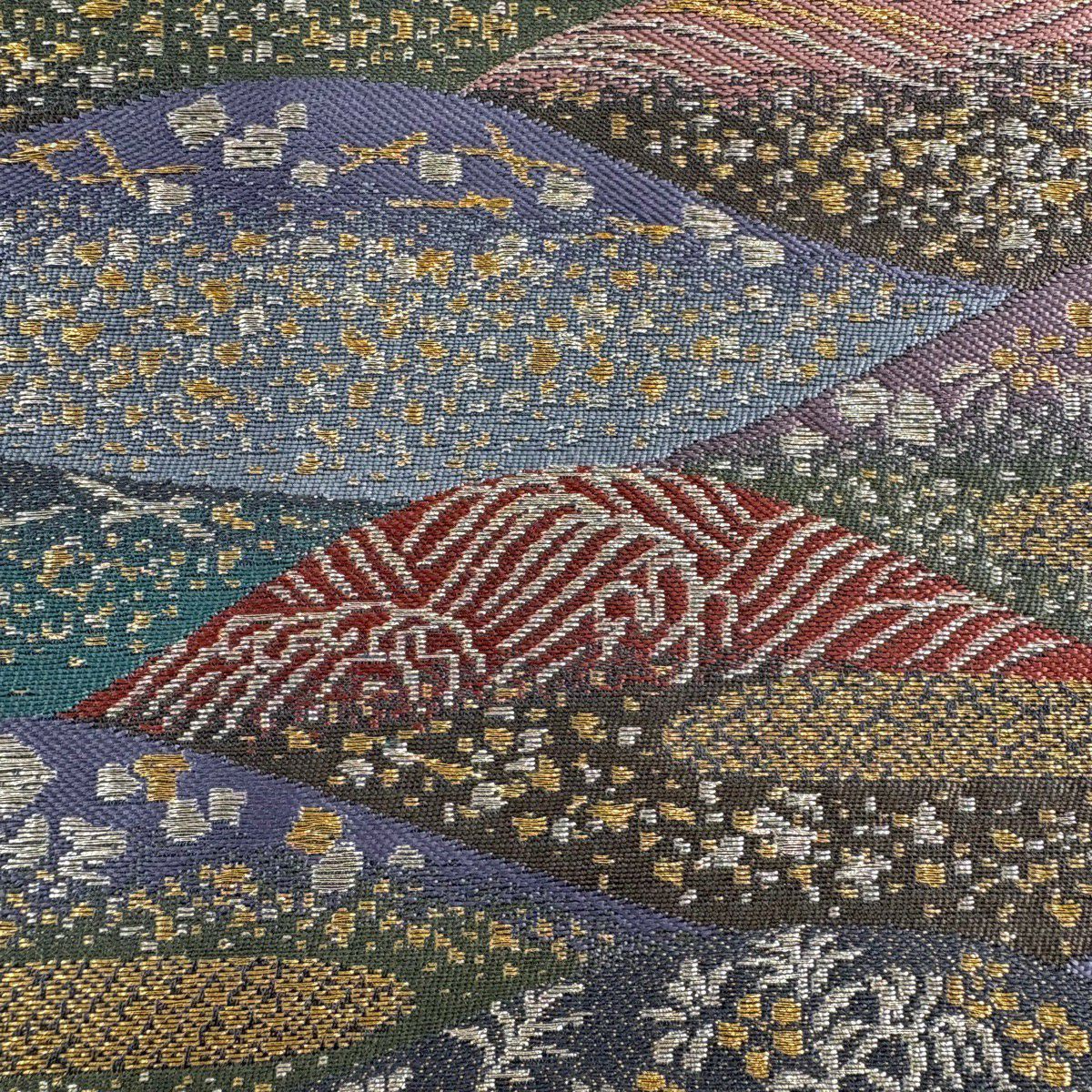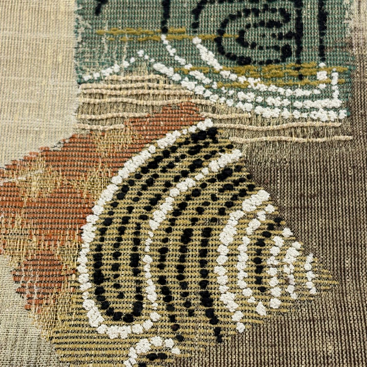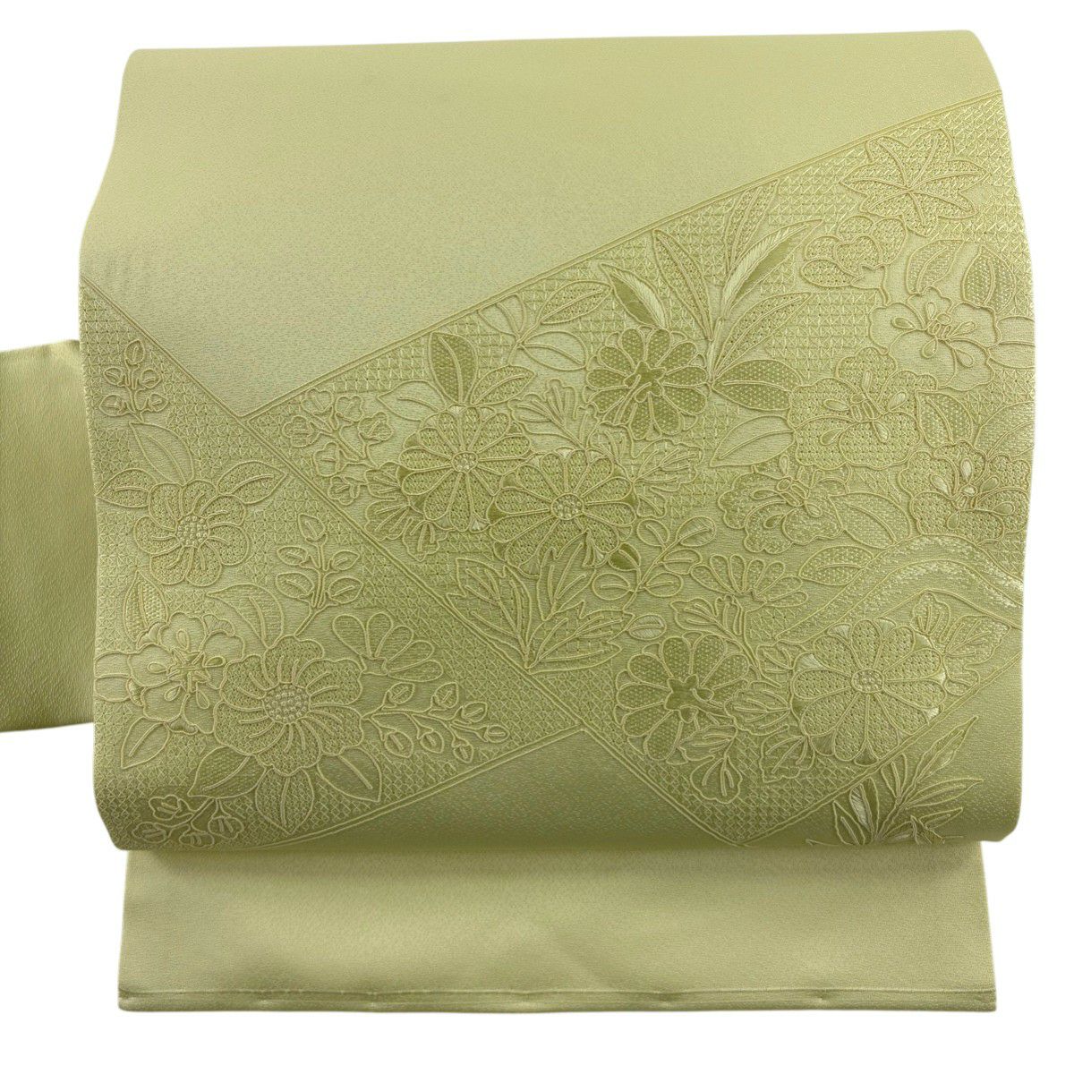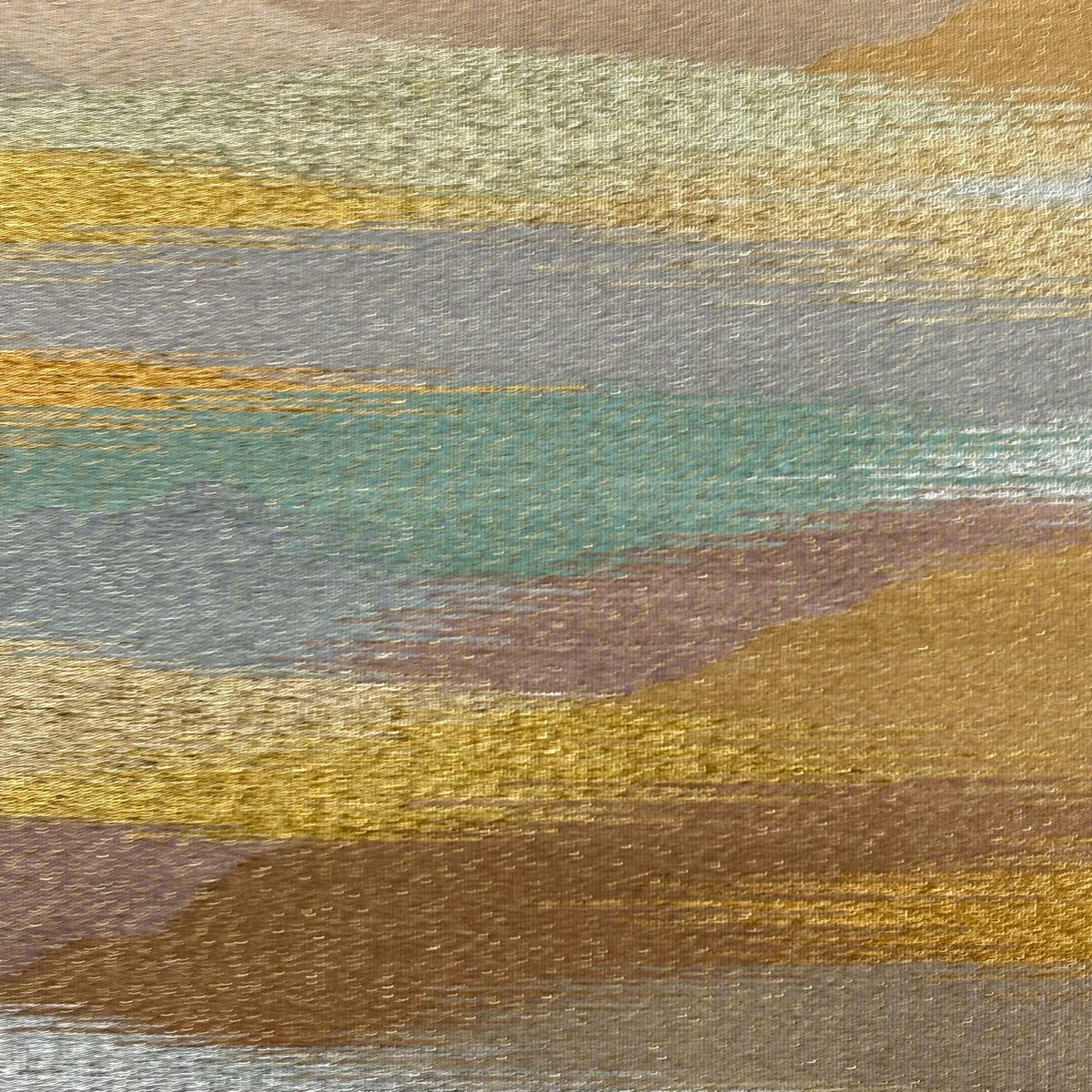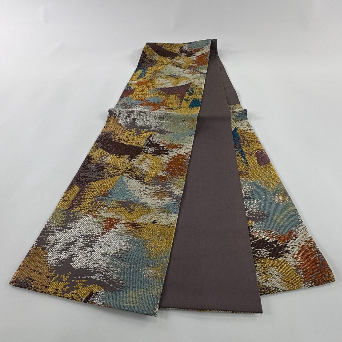 【美品】 袋帯 秀品 草花 幾何学 ぼかし 茶緑色 全通 正絹