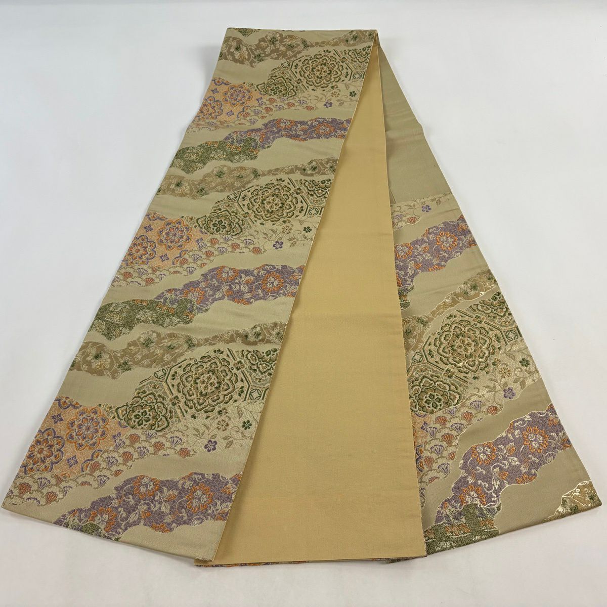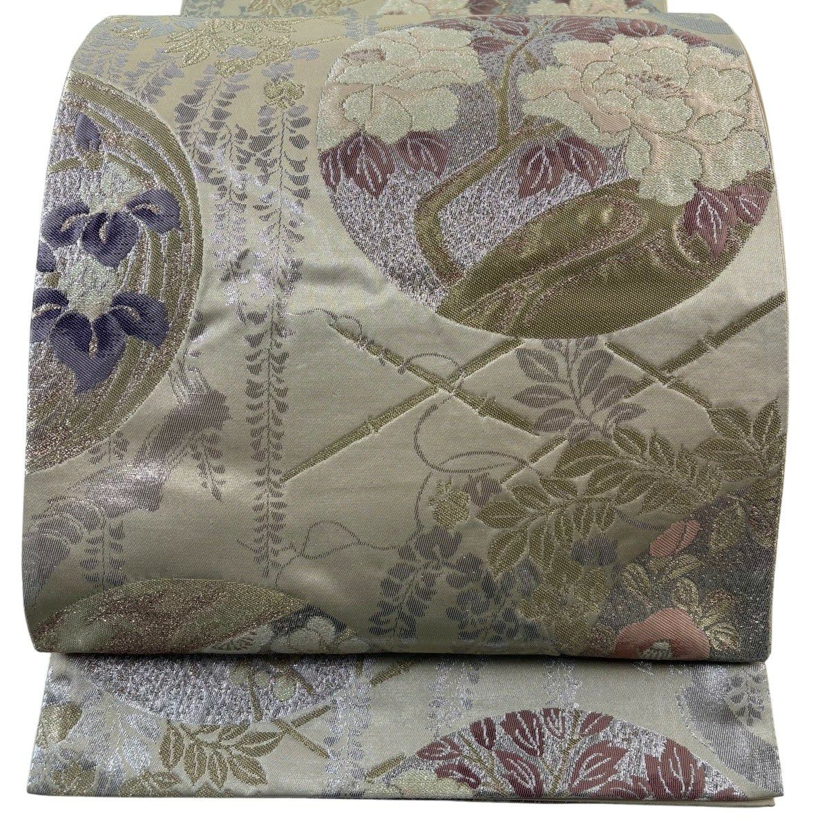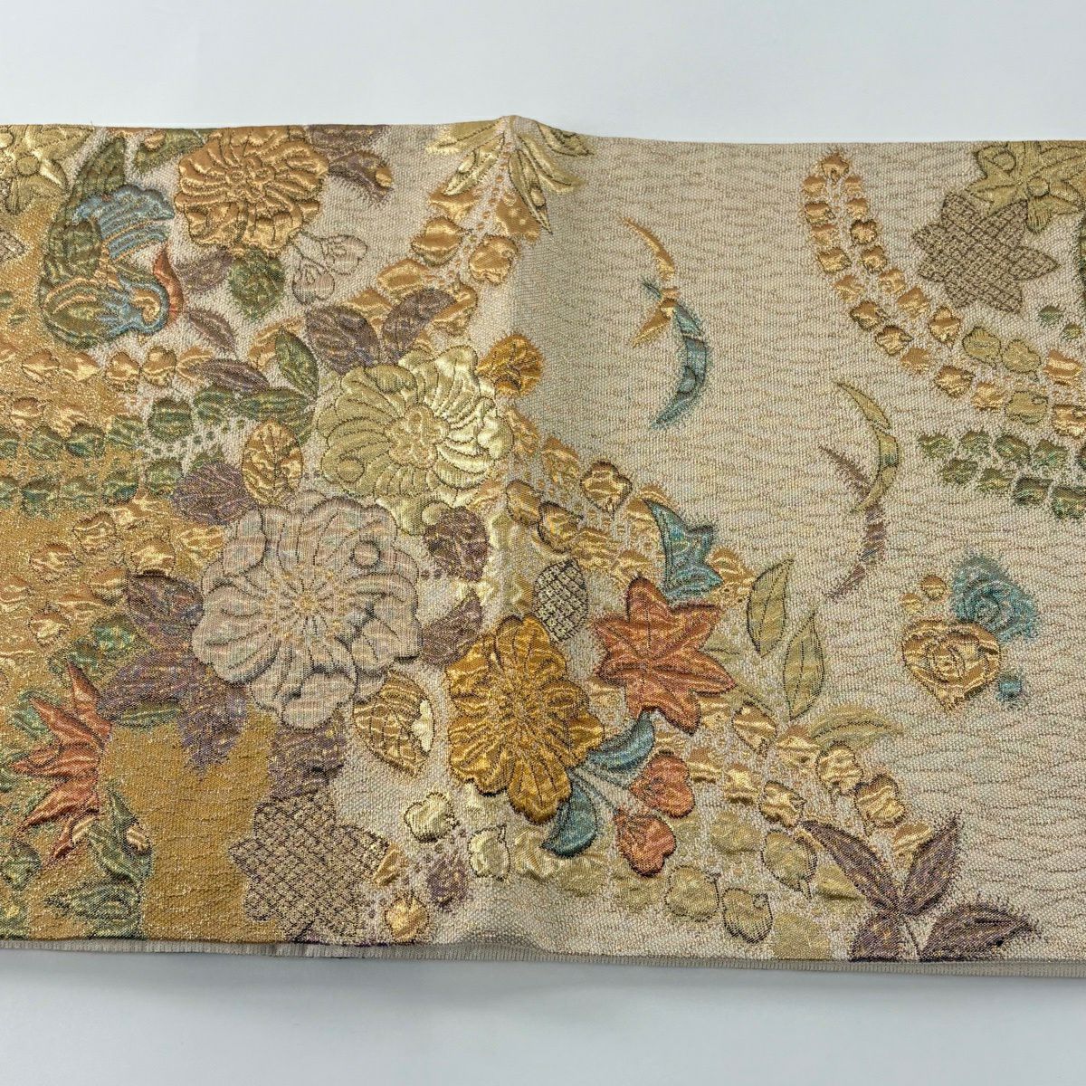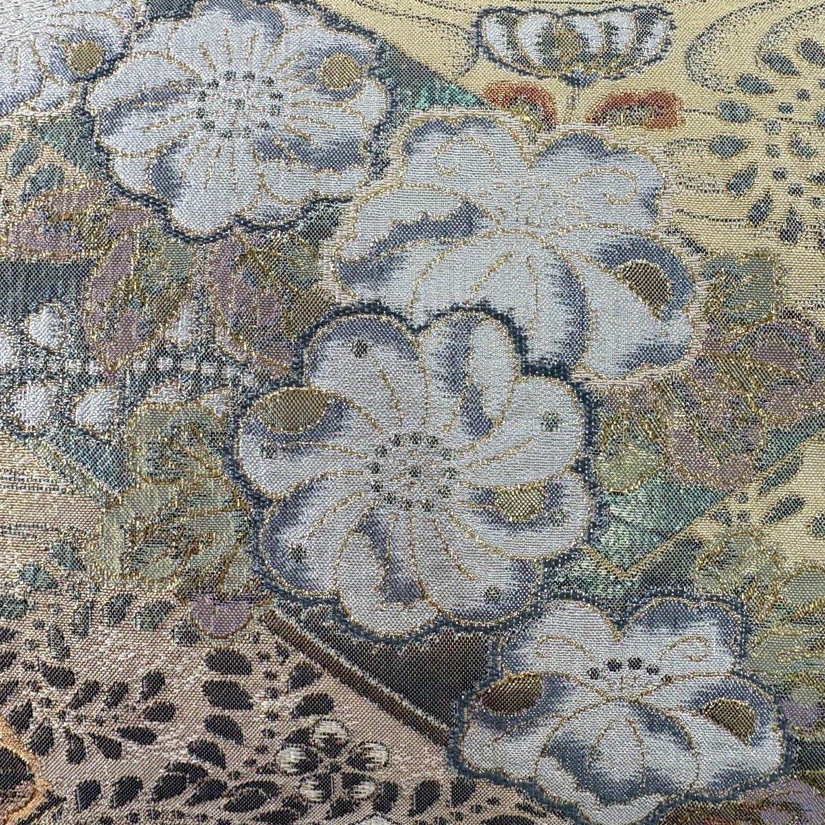 【美品】 袋帯 秀品 草花 流水 箔 ベージュ 六通 正絹