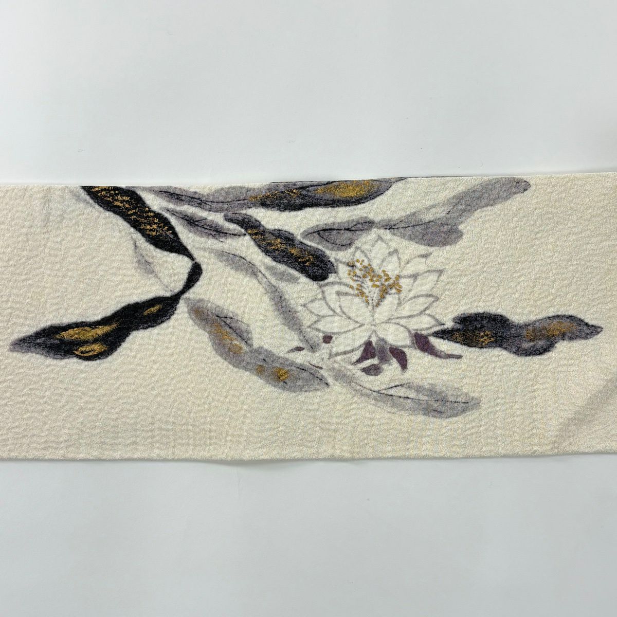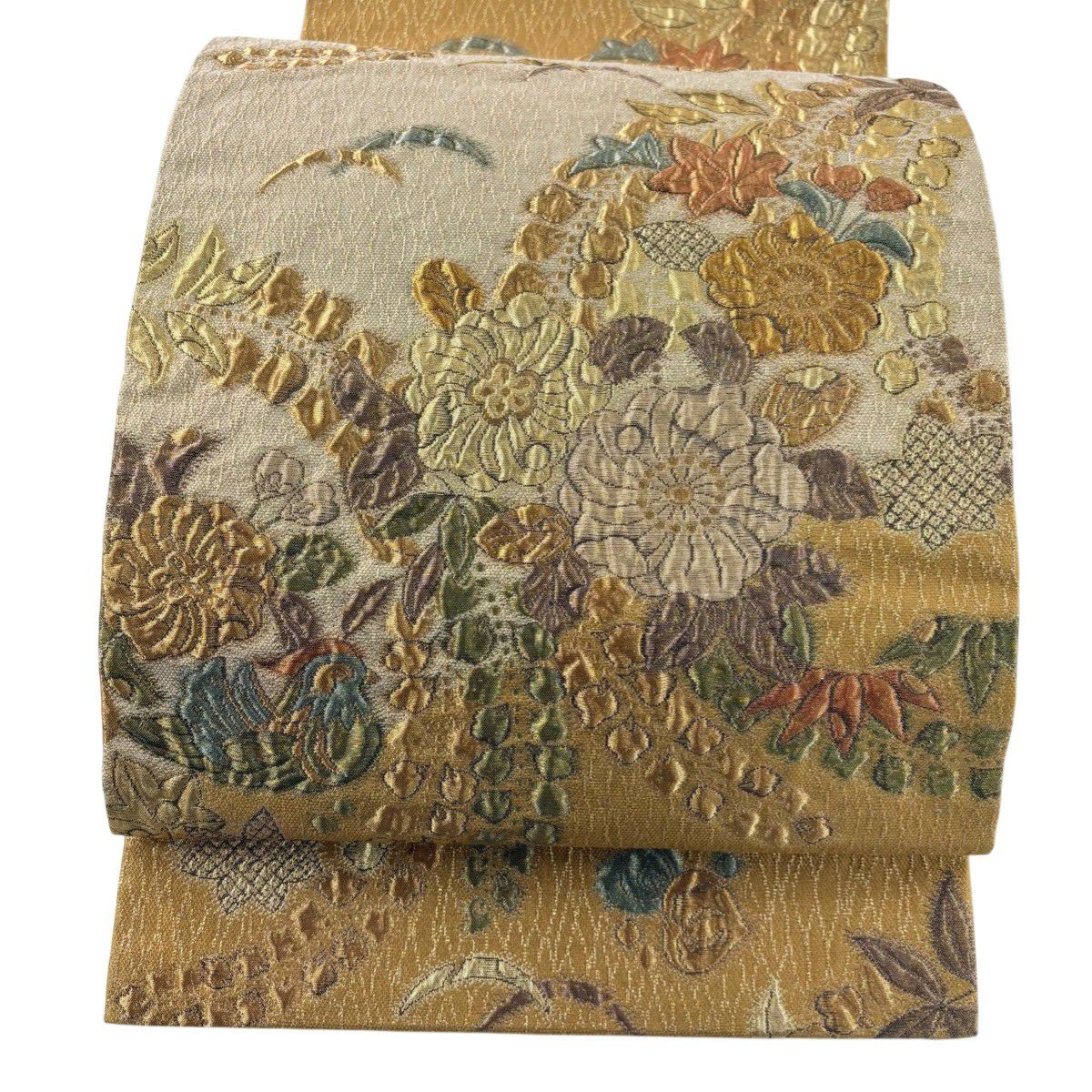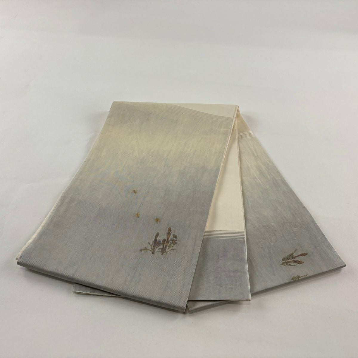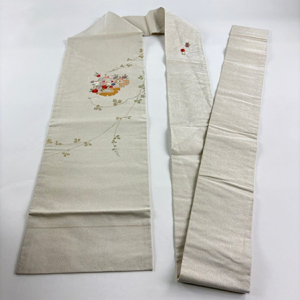【美品】 袋帯 秀品 草花 流水 箔 ベージュ 六通 正絹