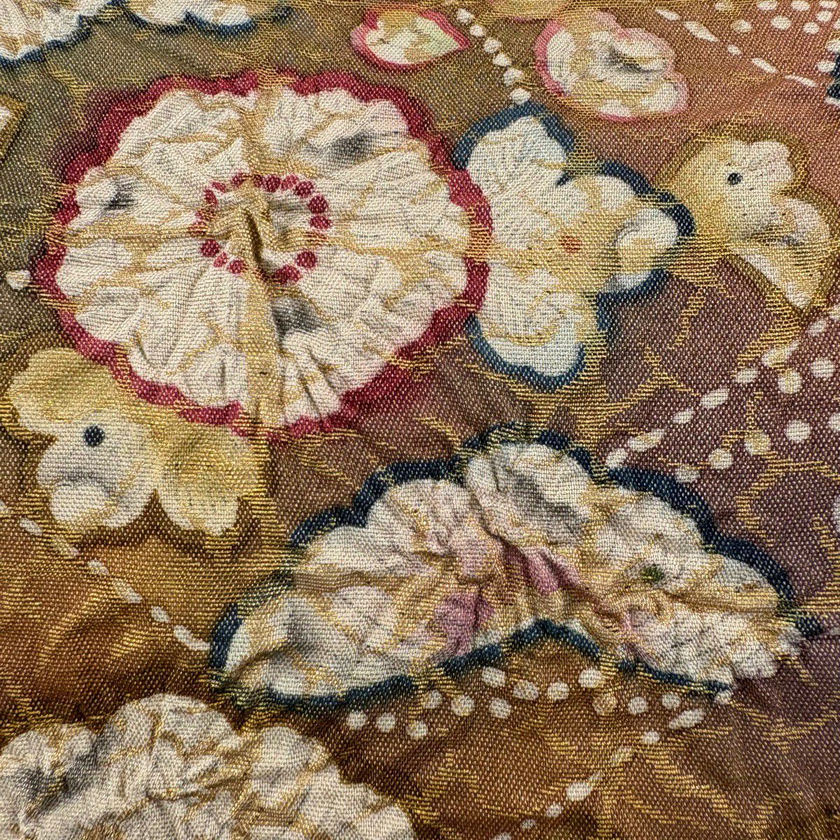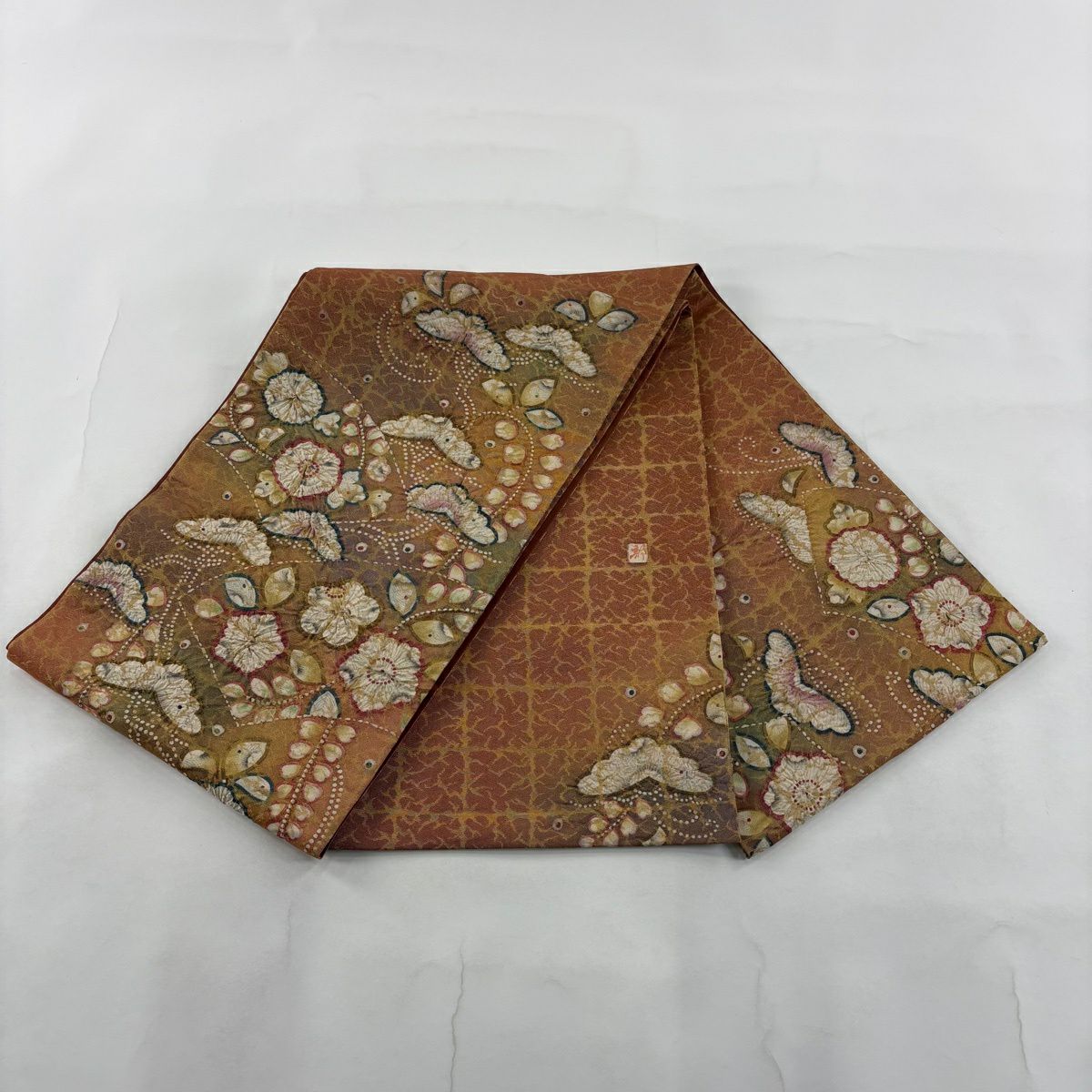 【美品】 袋帯 秀品 辻が花柄 金糸 箔 茶色 お太鼓柄 正絹