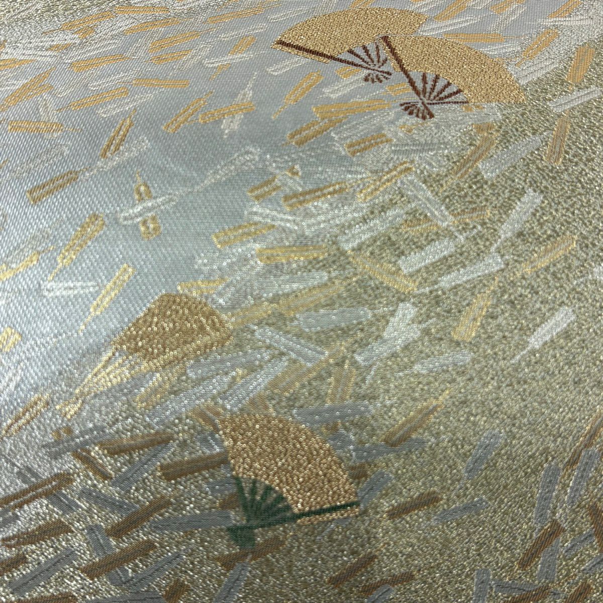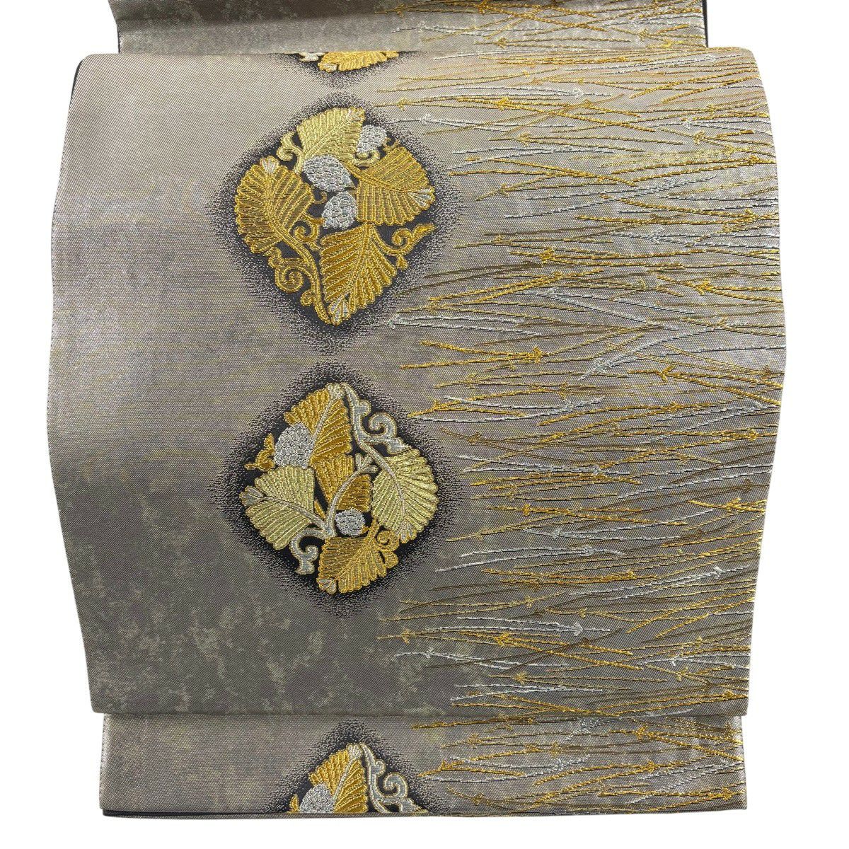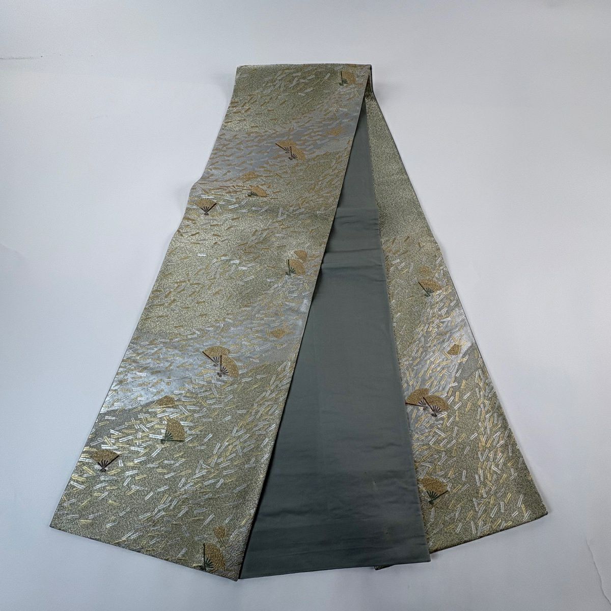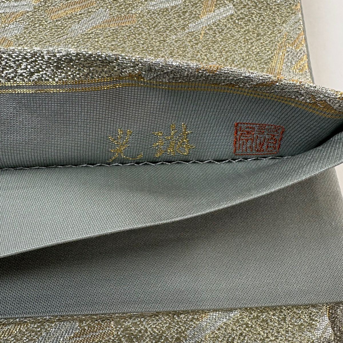 【美品】 袋帯 秀品 華文 道長取 金糸 箔 灰緑 六通 正絹