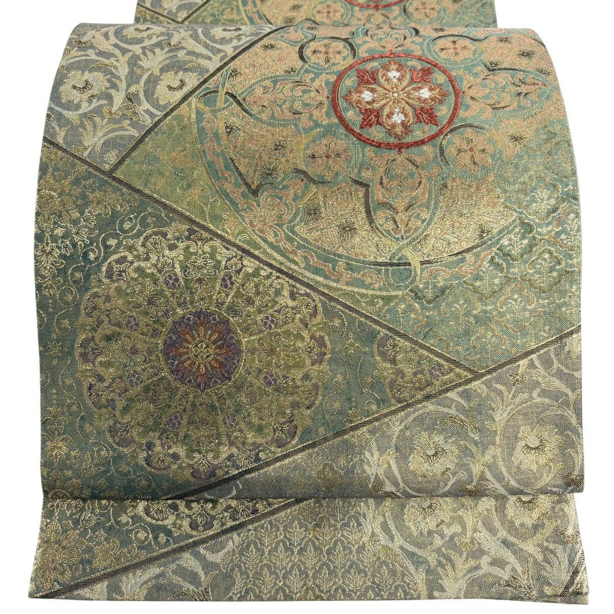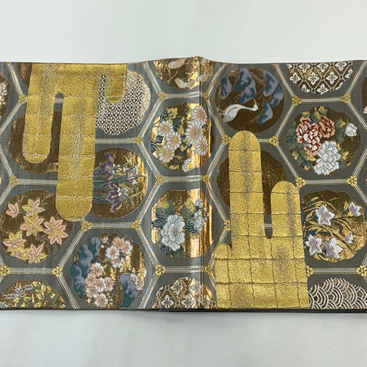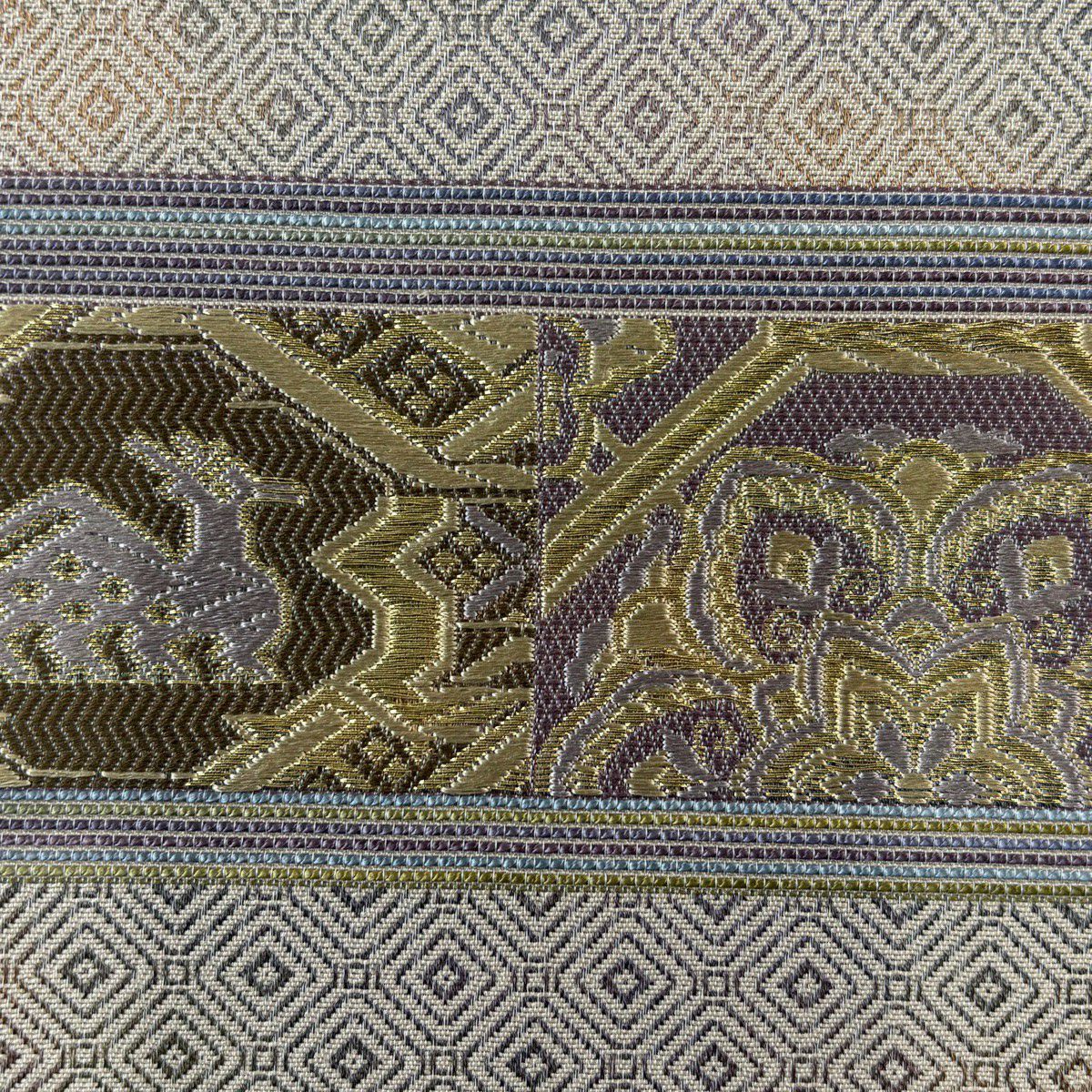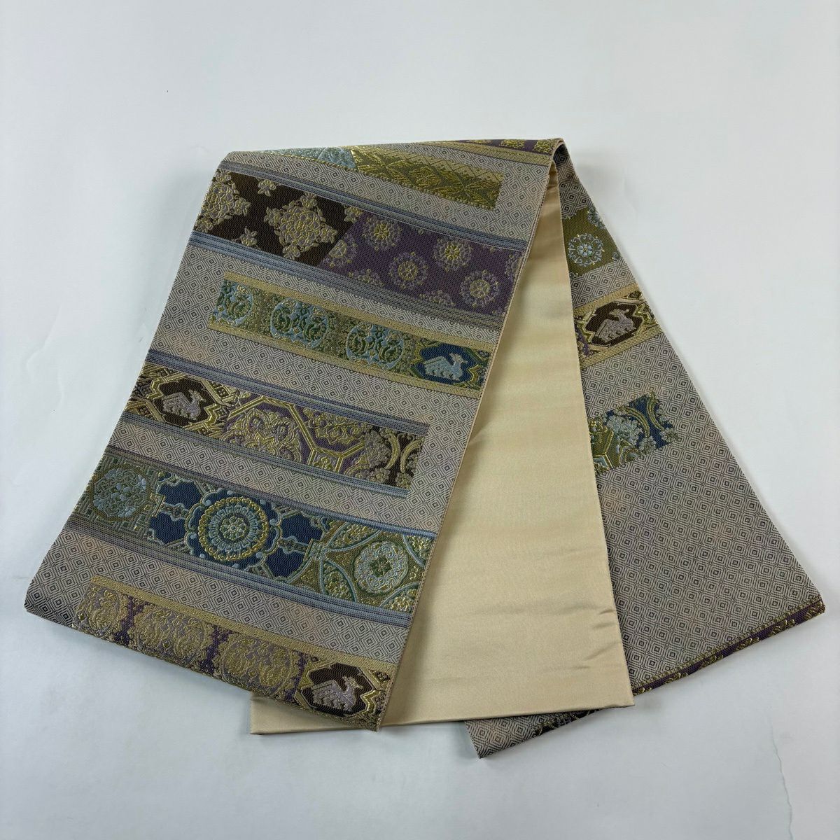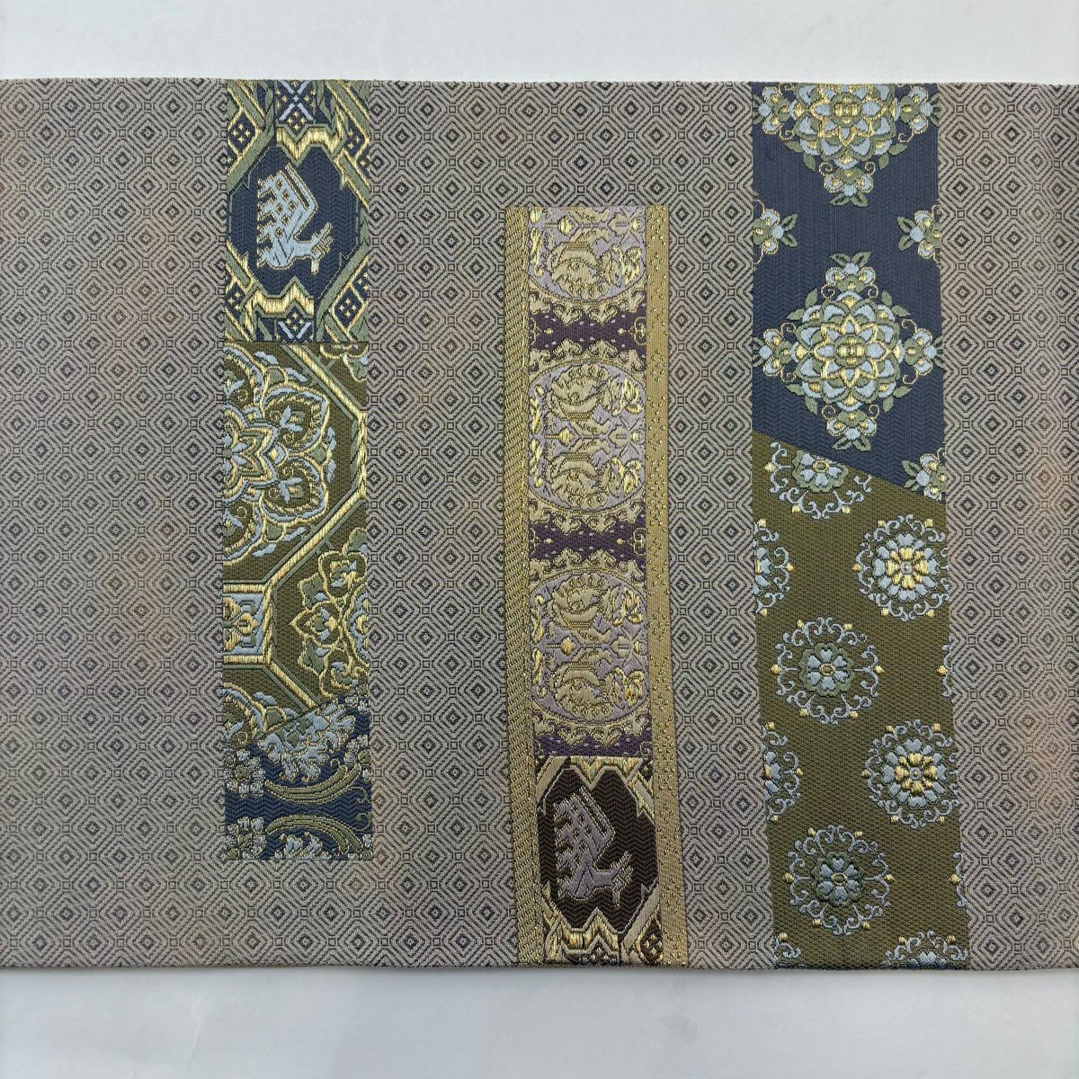 【美品】 袋帯 秀品 華文 道長取 金糸 箔 灰緑 六通 正絹