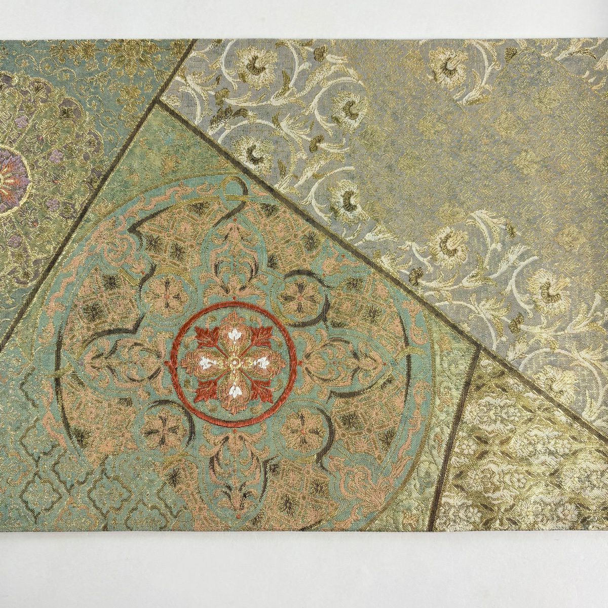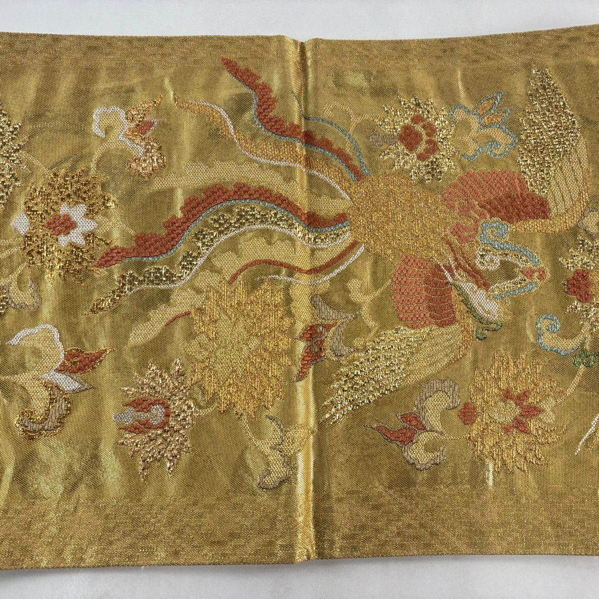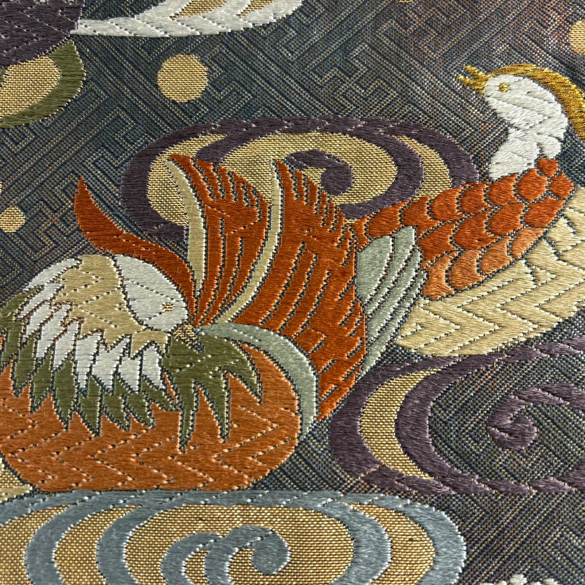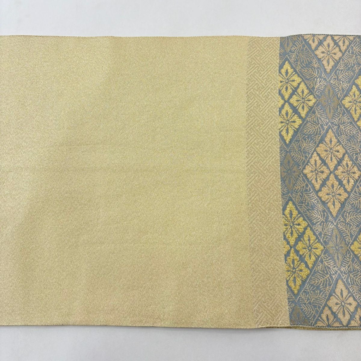【美品】 袋帯 秀品 華文 道長取 金糸 箔 灰緑 六通 正絹