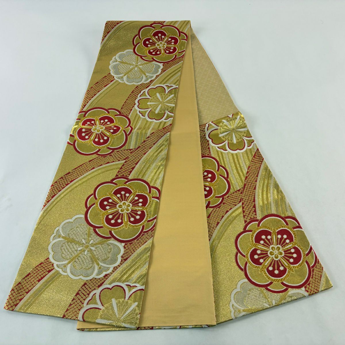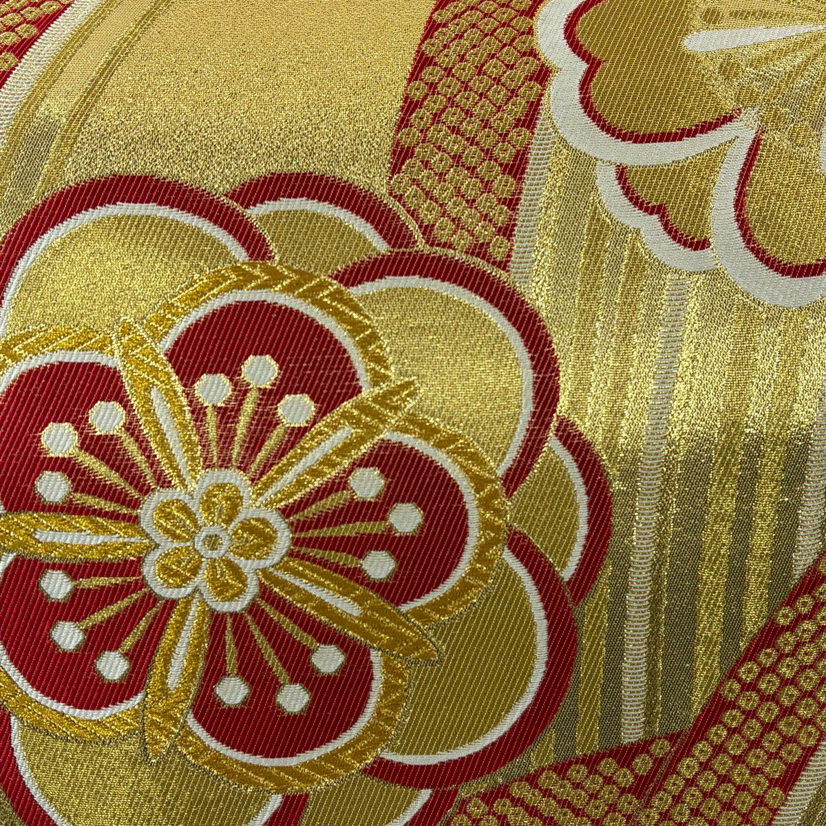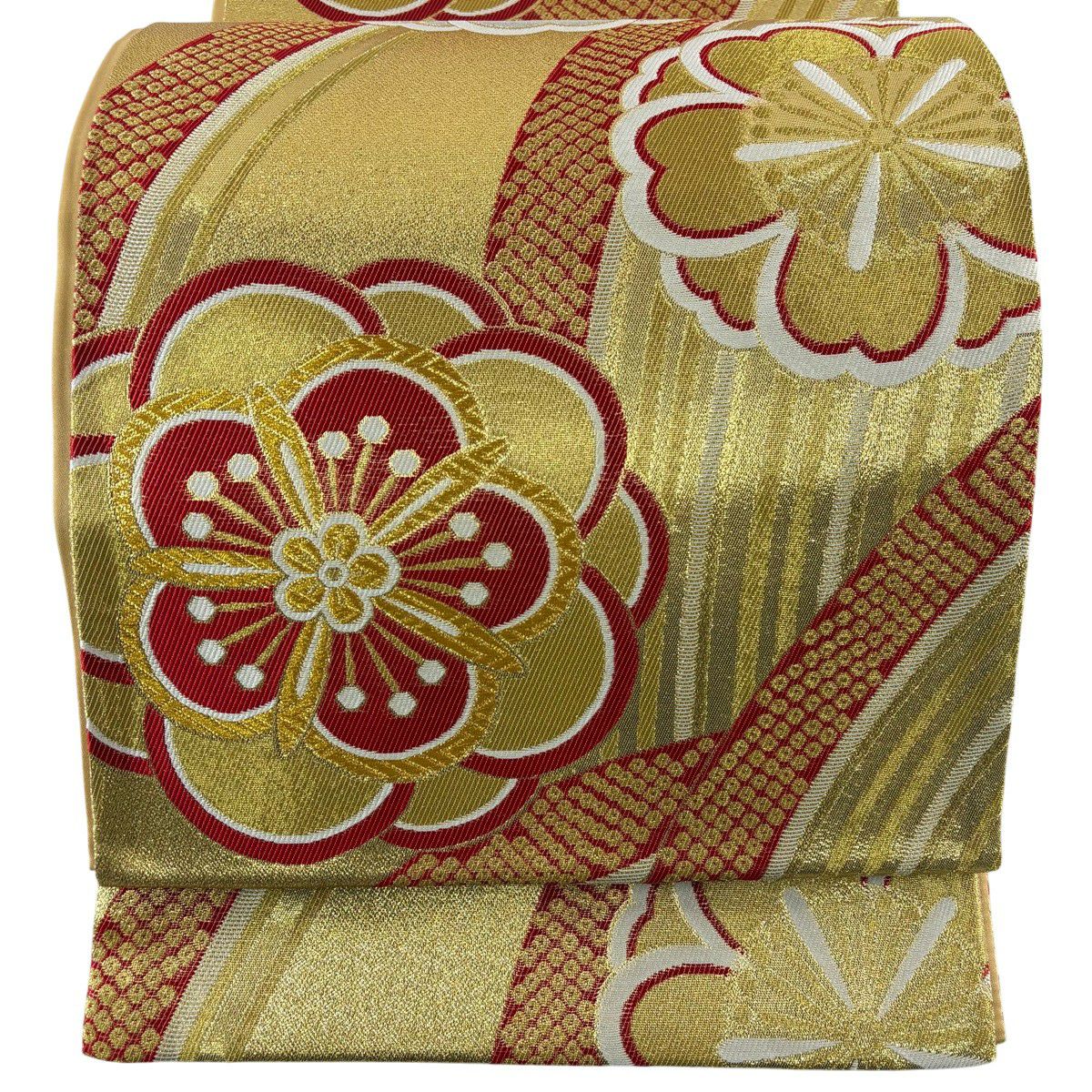 【美品】 袋帯 秀品 振袖向き 梅 金銀糸 箔 金色 六通 正絹
