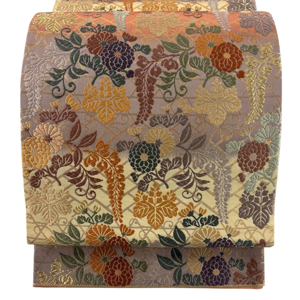 【美品】 袋帯 秀品 枝花 花びら 金糸 薄紫 お太鼓柄 正絹