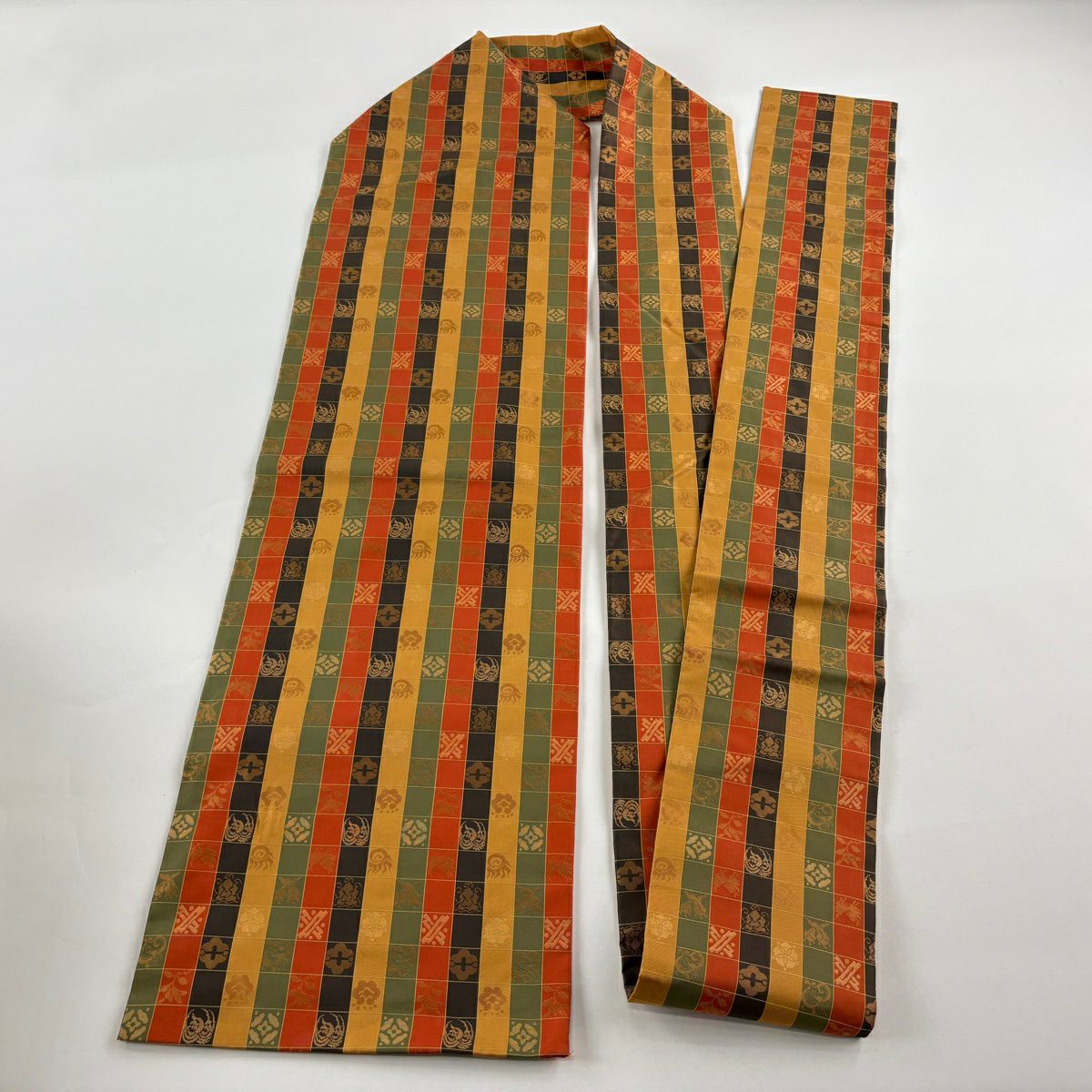 【美品】 名古屋帯 秀品 市松 宝尽くし 箔 オレンジ 正絹