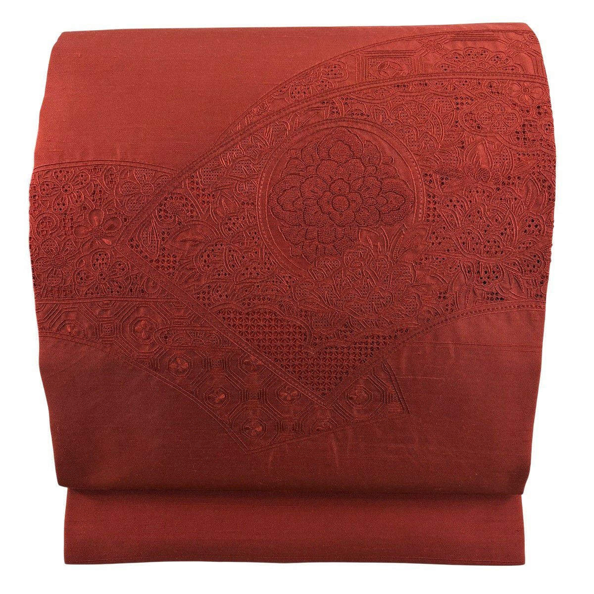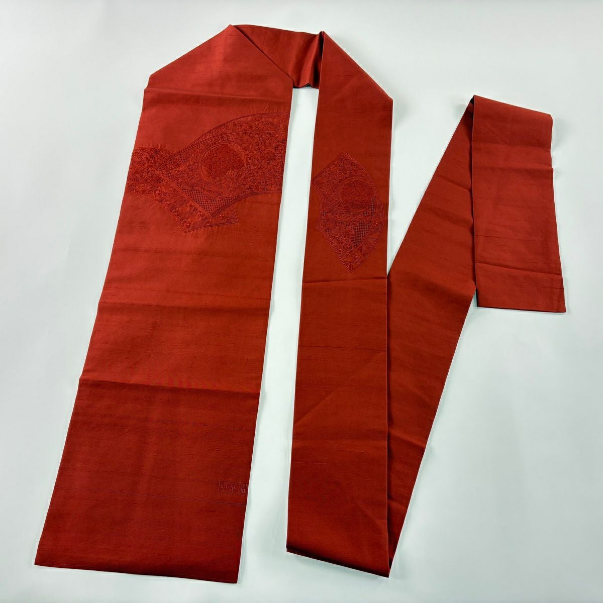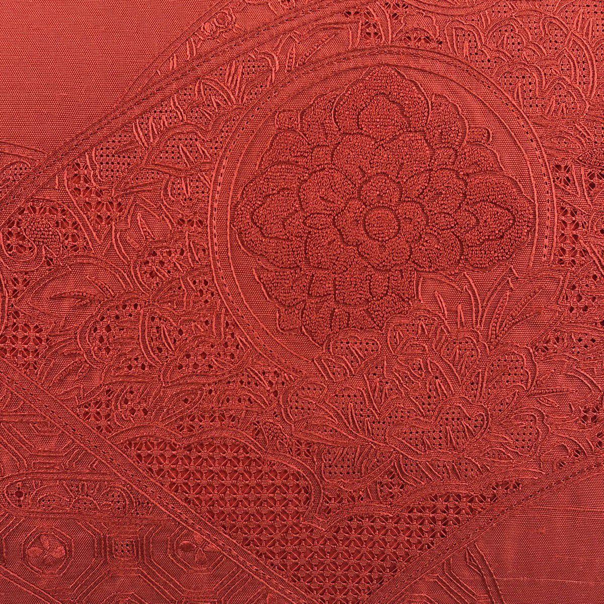 【美品】 名古屋帯 秀品 紬 草花 扇面 汕頭刺繍 朱色 正絹