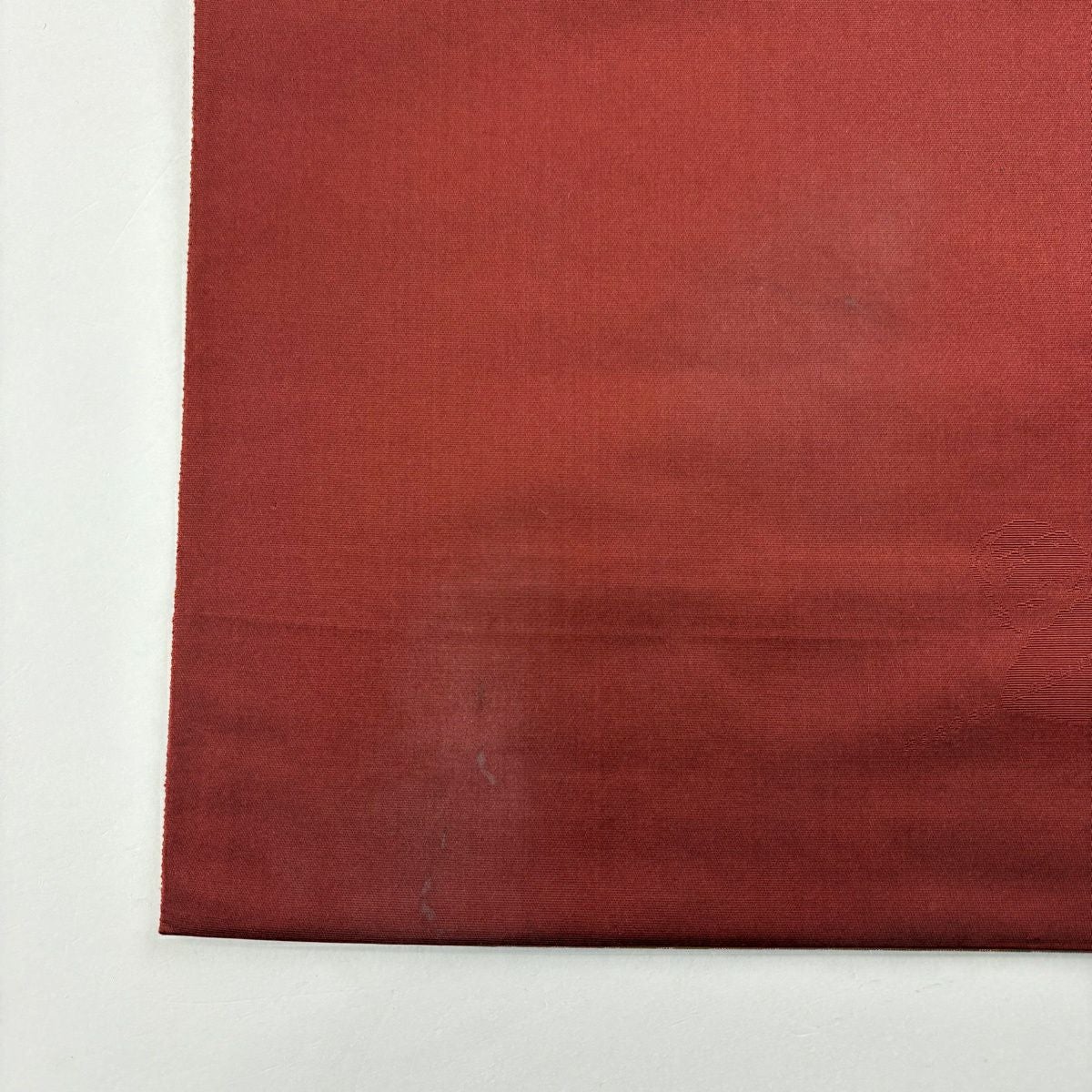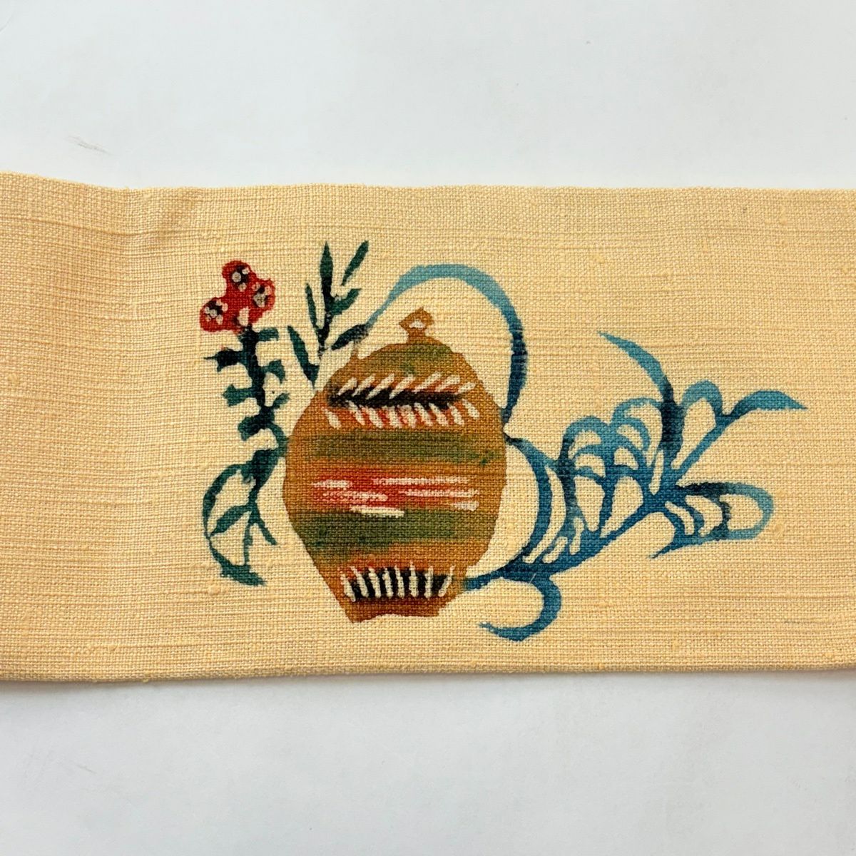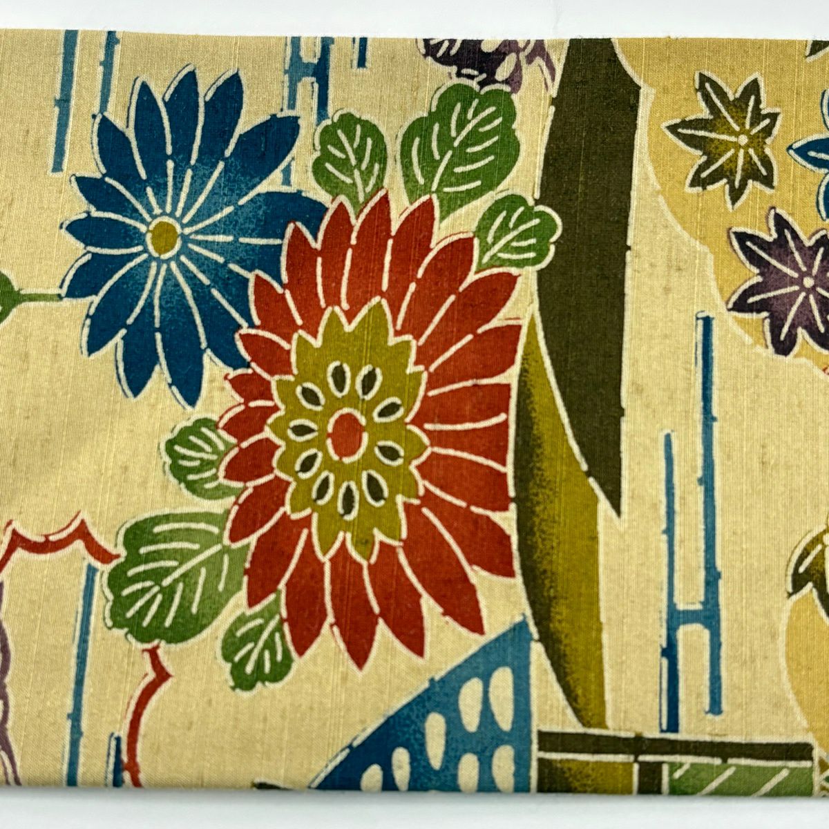 【美品】 名古屋帯 秀品 紬 草花 扇面 汕頭刺繍 朱色 正絹