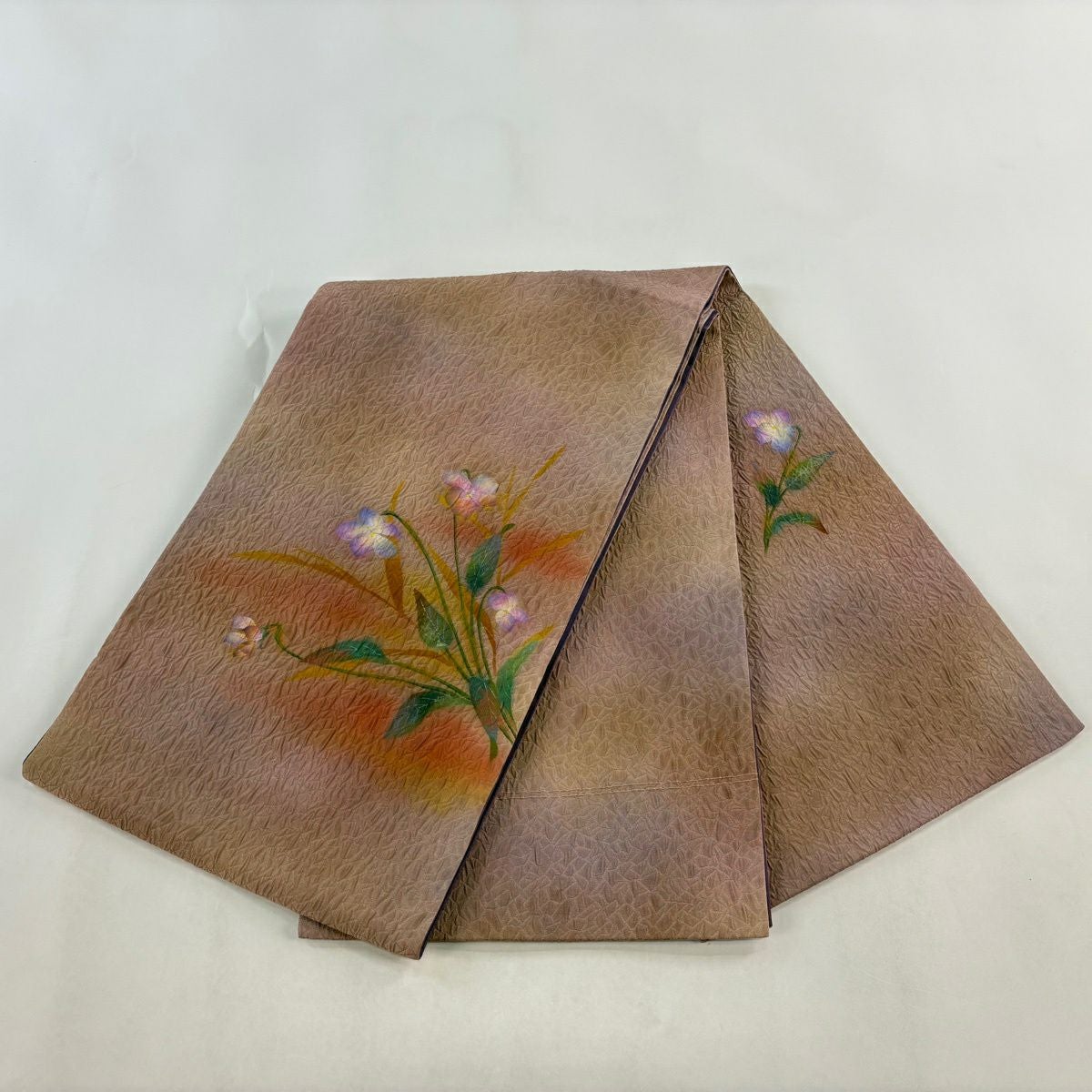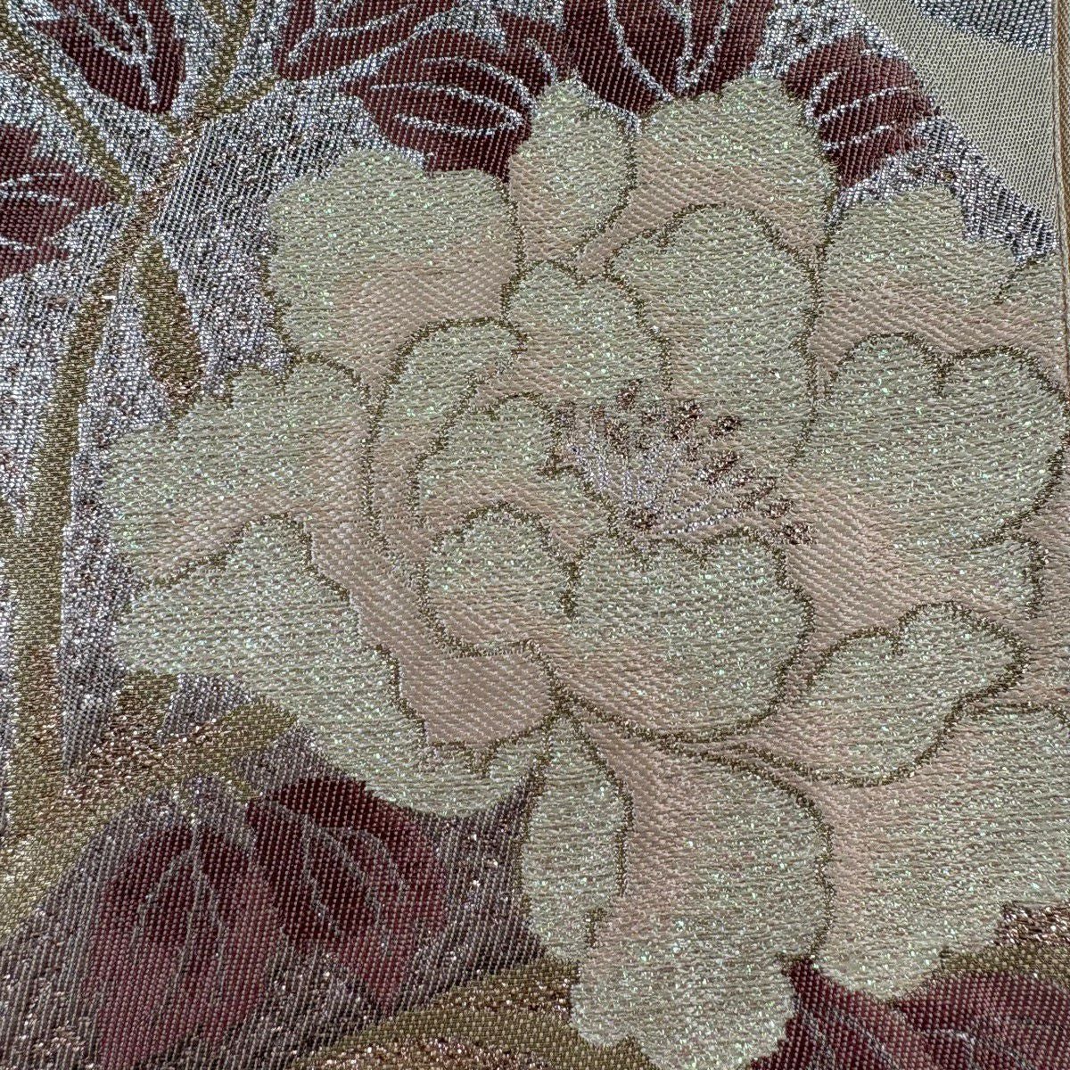 【美品】 袋帯 秀品 草花 霞 ぼかし 薄小豆 お太鼓柄 正絹